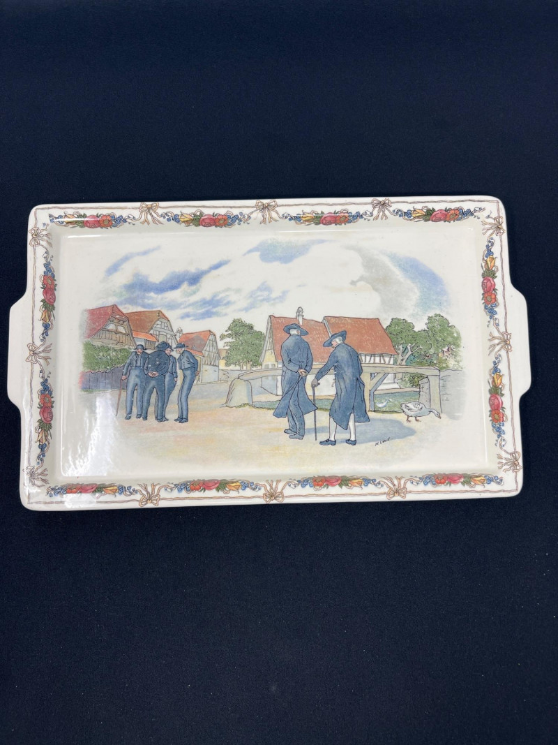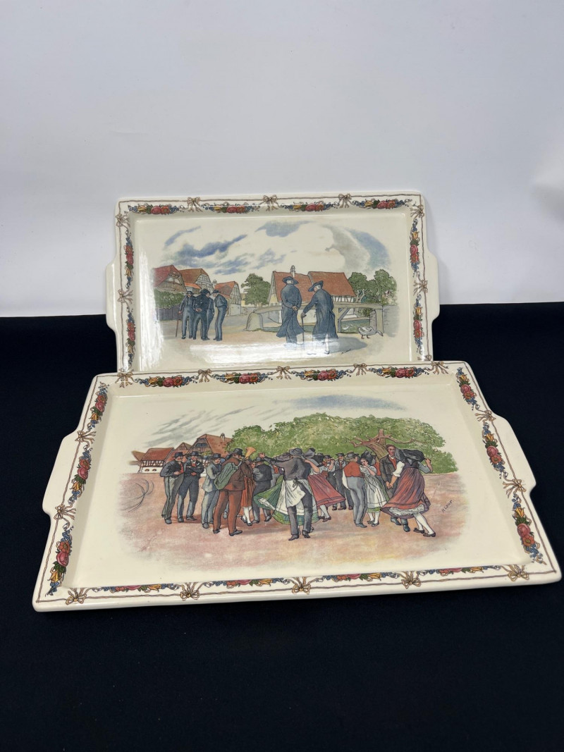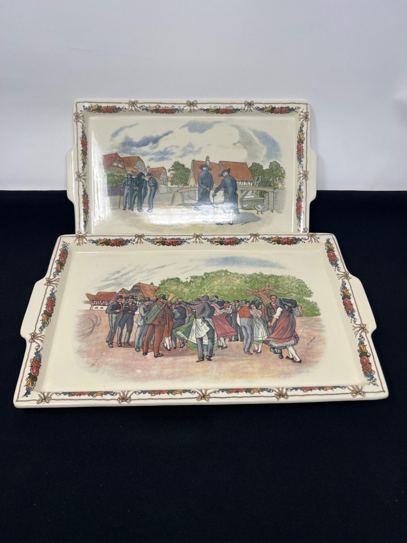 Set of two Obernai Faïenceries Sarreguemines ceramic serving trays featuring classic Alsatian village scenes inspired by the artwork of Henri Loux. Each tray is decorated with richly colored, transfer‑printed imagery framed by floral borders and fitted with side handles for functional use. The underside carries the Obernai / Faïenceries Sarreguemines France mark. Measurements: