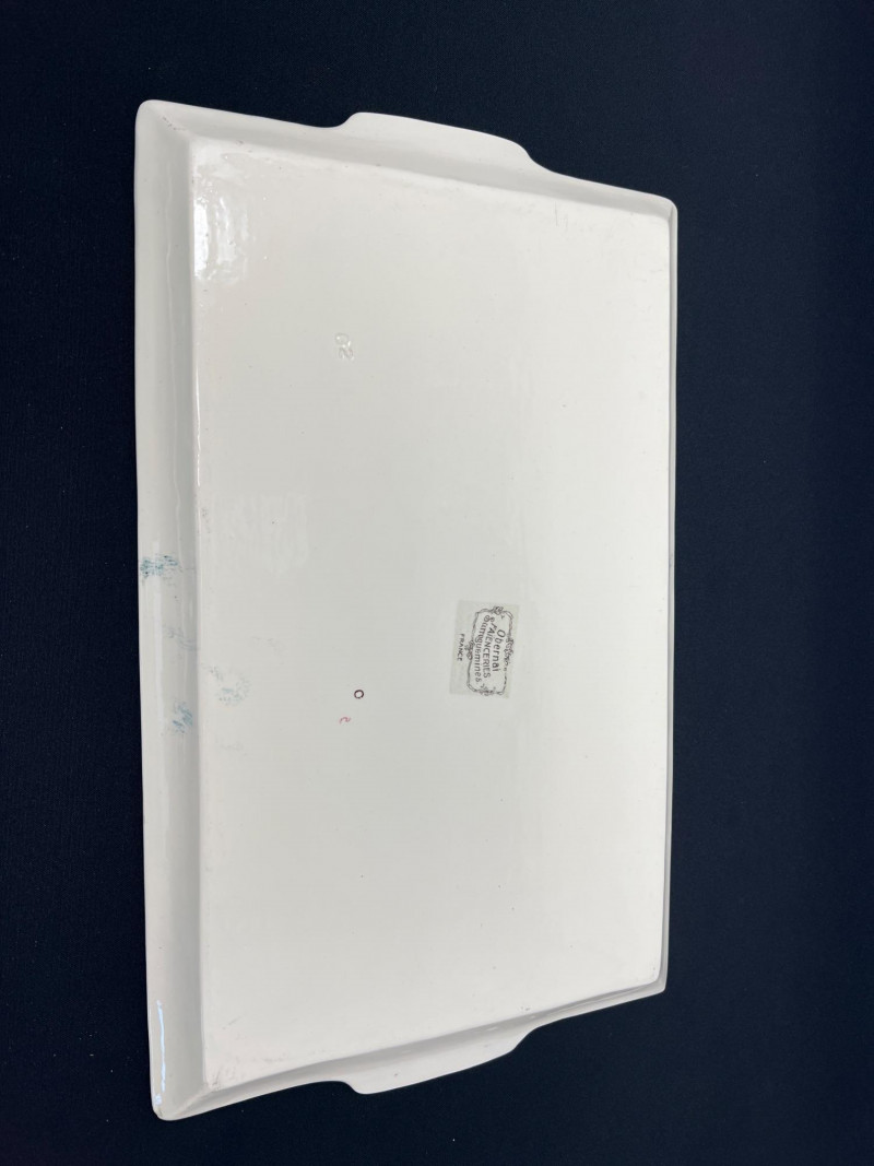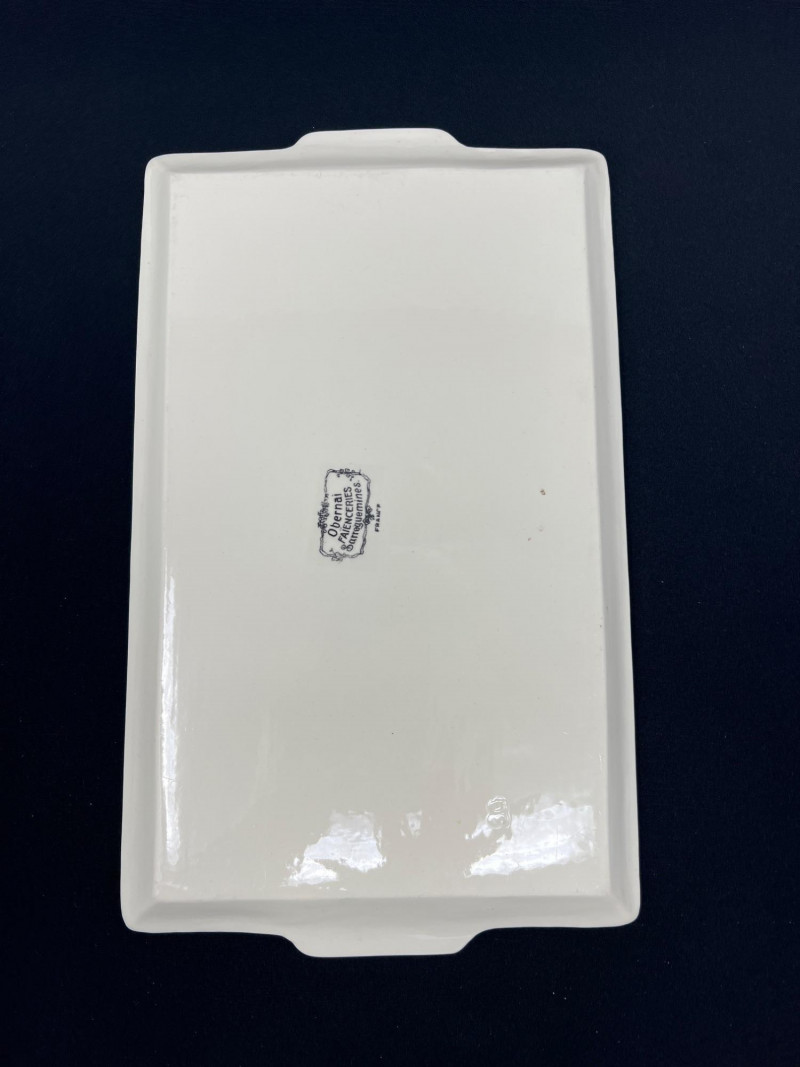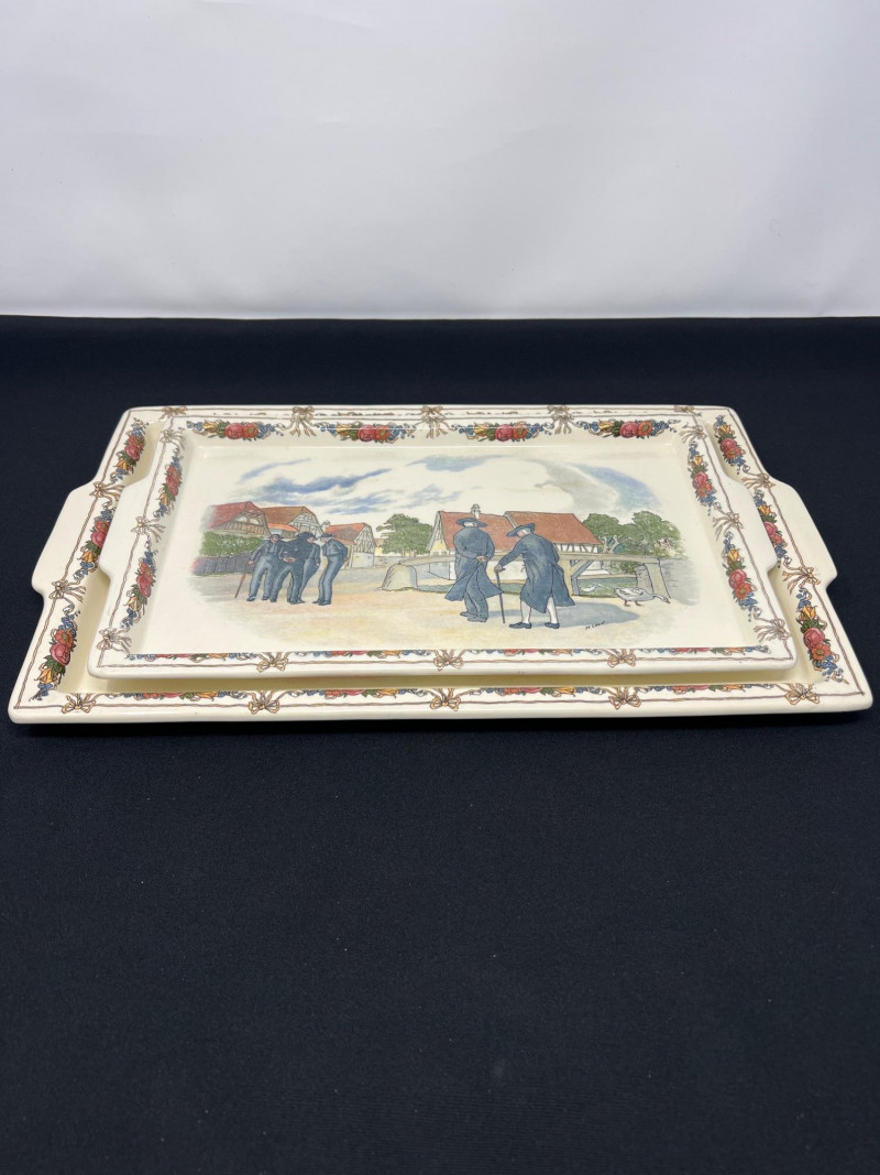 • Smaller tray: [13.5" length x 8" width] A charming pair for collectors of Obernai, French faience, or traditional European ceramic décor.