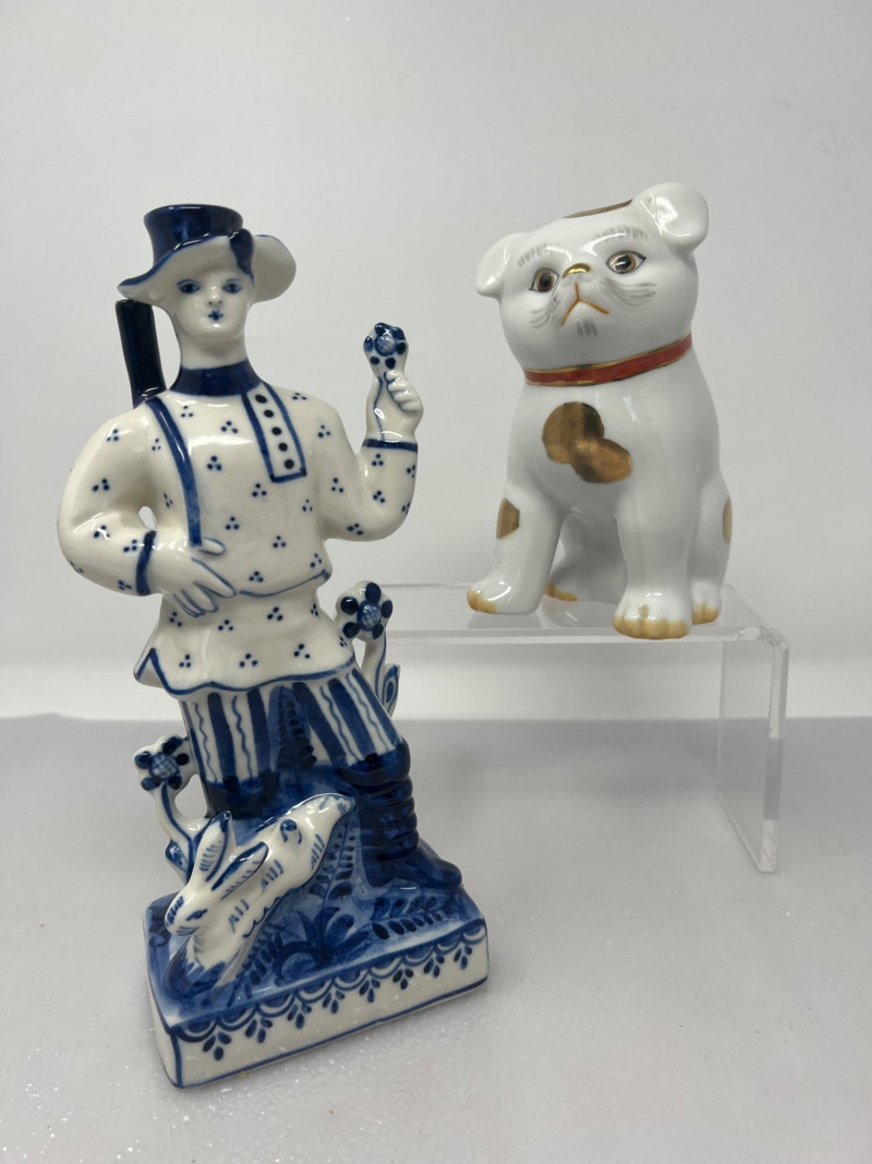 Lot # 20 - Kutani Puppy & Gzhel Soviet Hunter Ceramic Figurines