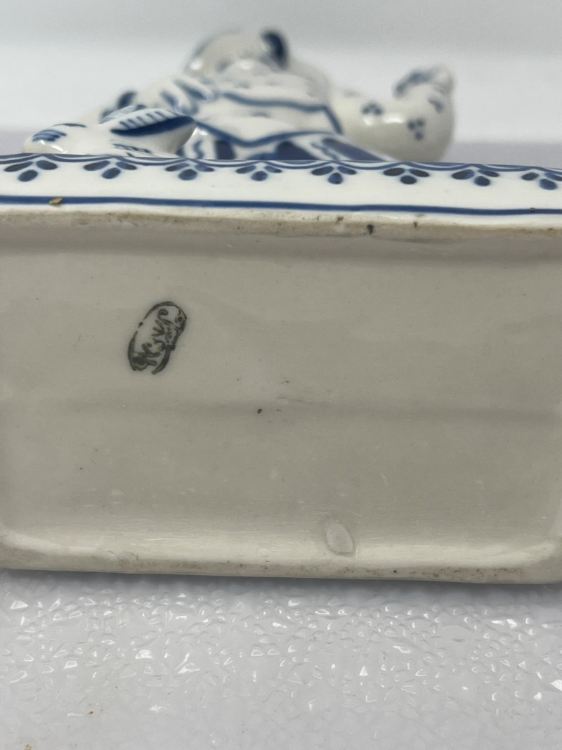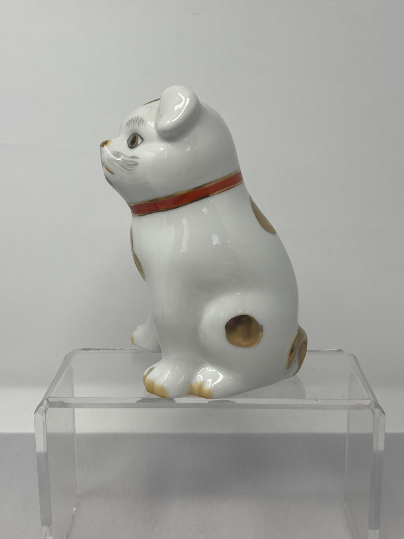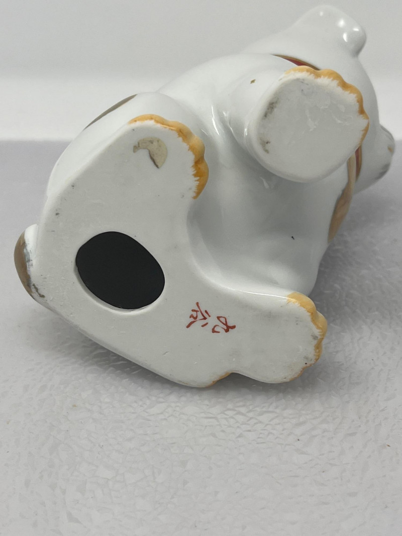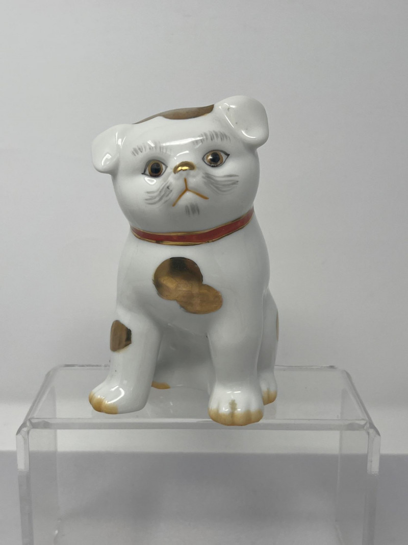 Two international ceramic figurine featuring an authentic Japanese Kutani puppy and a Soviet‑era Gzhel hunter. The Kutani puppy is hand‑painted with gold accents and marked in red on the underside, consistent with mid‑century Kutani export production. The Gzhel hunter displays the classic cobalt blue palette and carries an oval factory stamp used by Gzhel cooperative workshops during the late Soviet period. A distinctive pairing of Japanese porcelain artistry and Russian folk‑ceramic tradition, ideal for collectors of global ceramics and mid‑century decorative pieces. Japanese Kutani Puppy