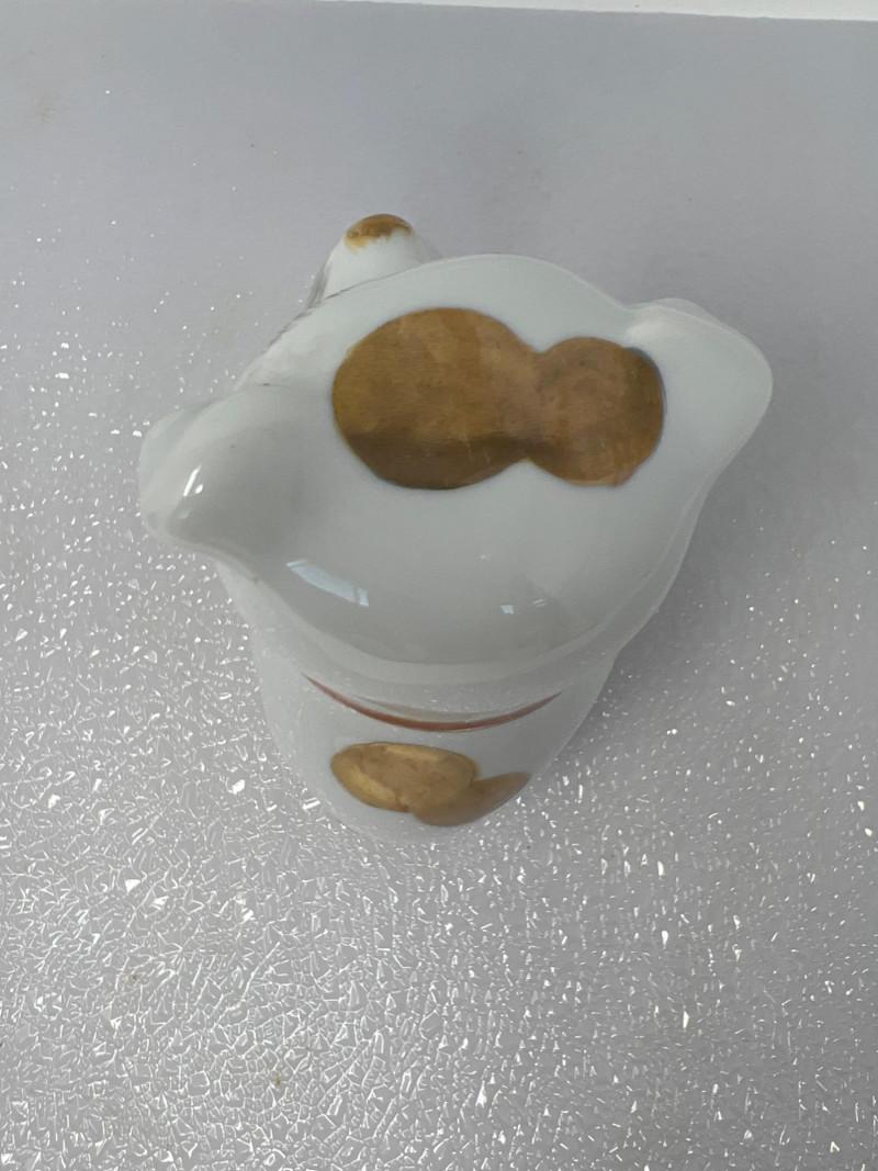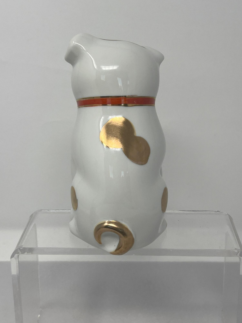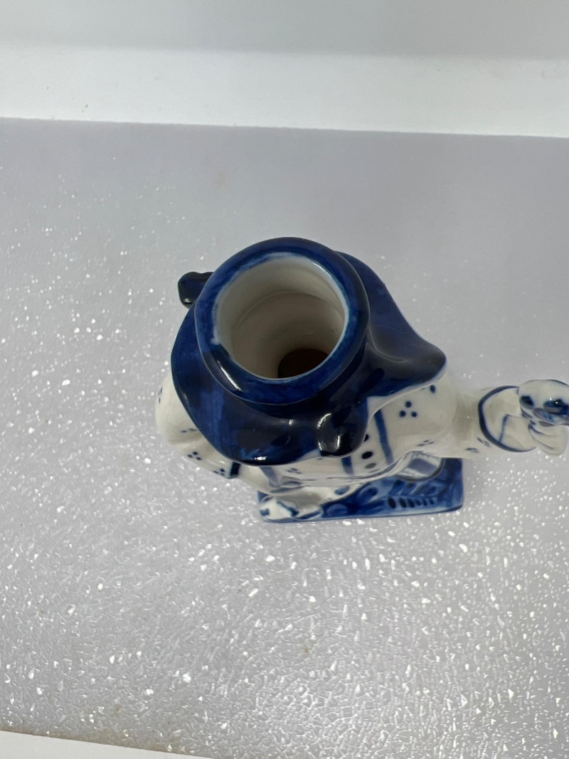Hand‑painted porcelain with gold‑accented spots and collar; red underside mark. 6” tall x 3.5” wide x 4” length Soviet‑Era Gzhel Hunter