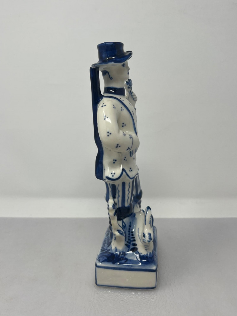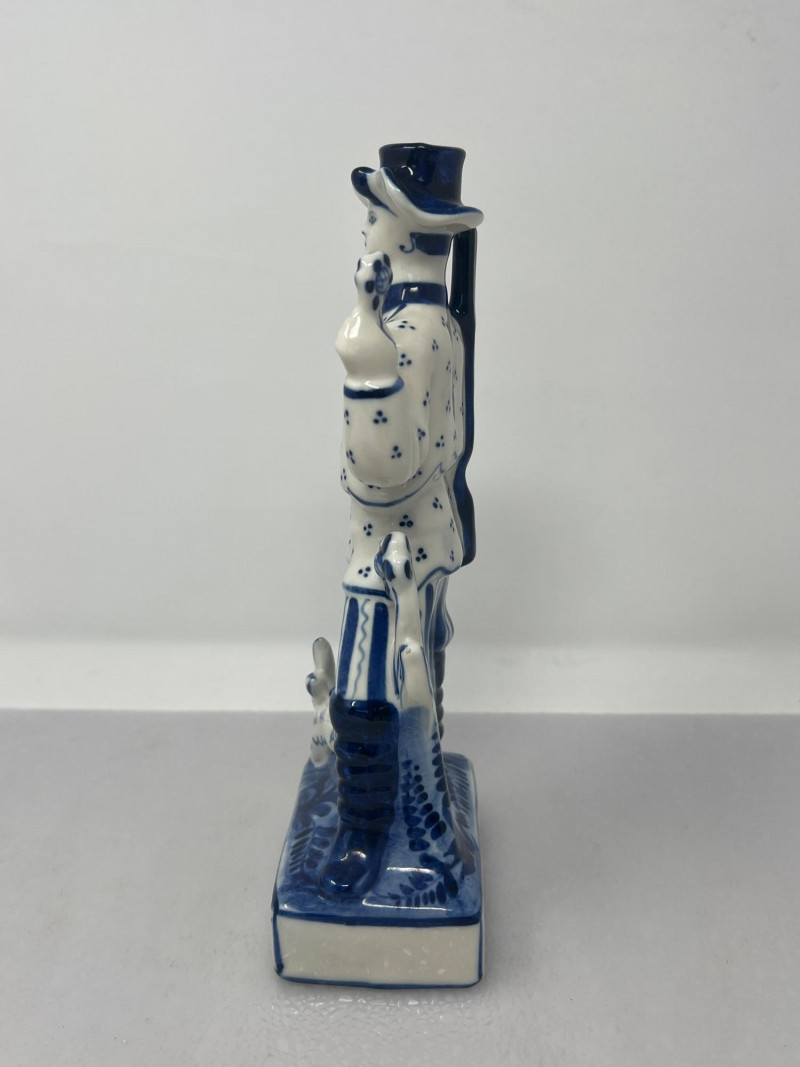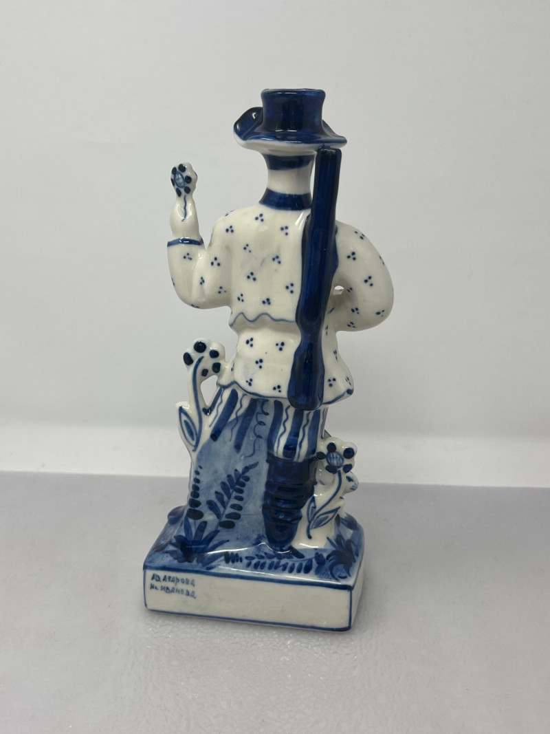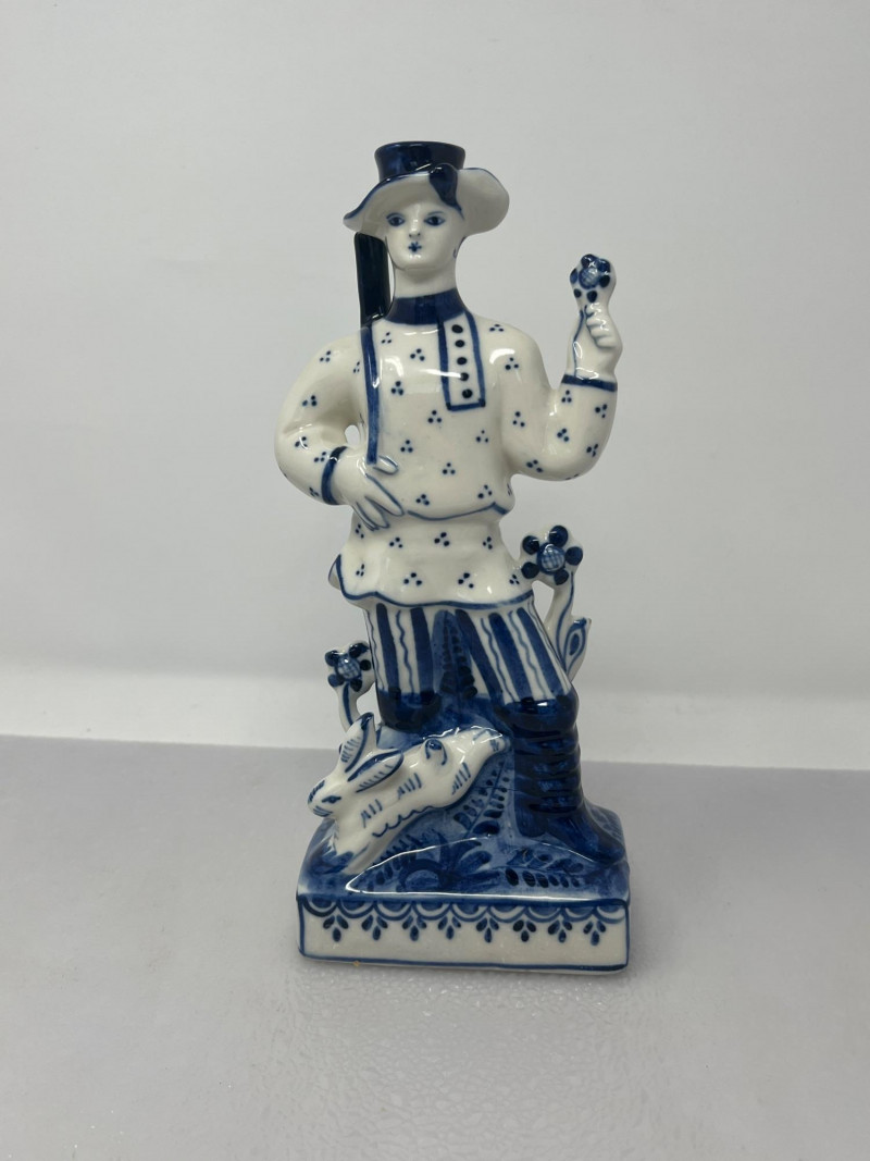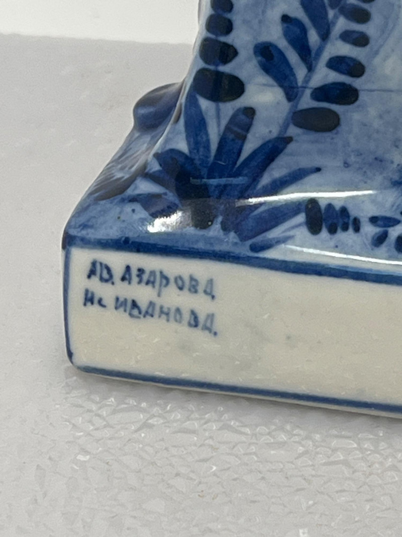 Blue‑and‑white porcelain figure with traditional attire; stamped with an oval Gzhel factory mark. 9.5” tall x 4” wide x 2.5” depth