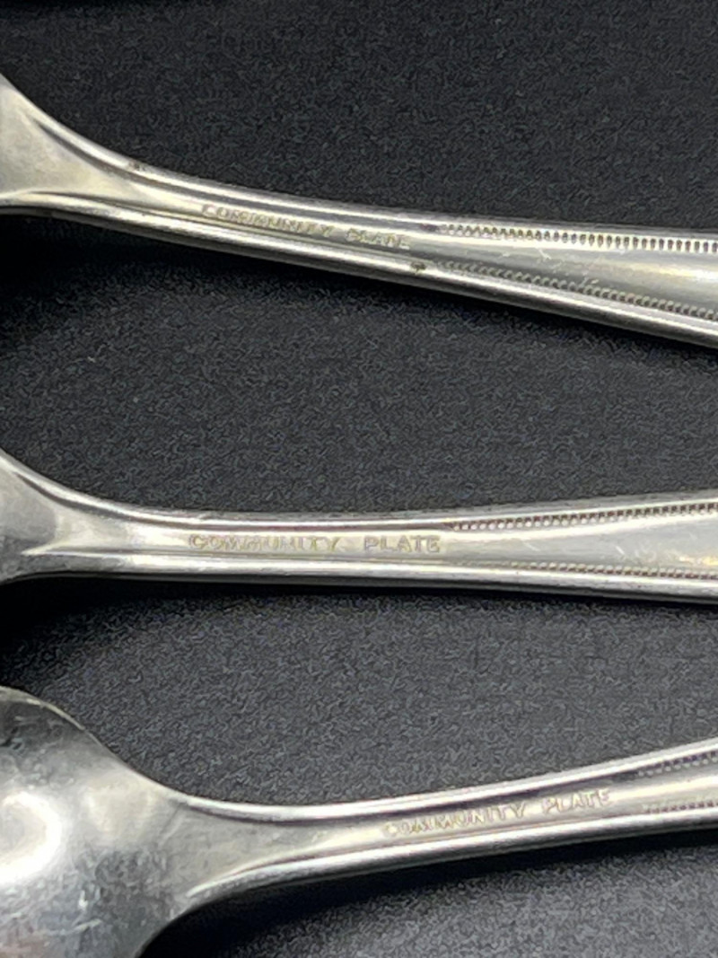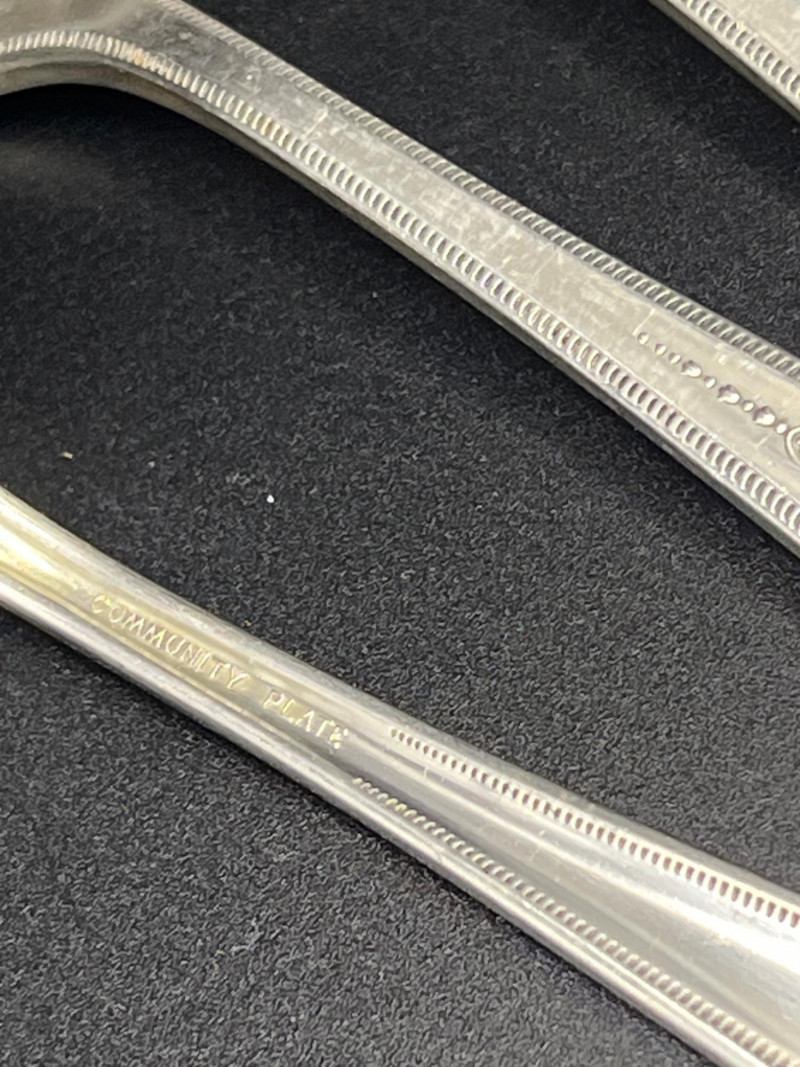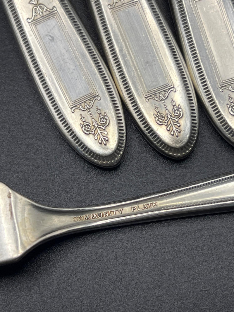 Assorted pieces of Oneida Community Plate silverplate flatware in the Grosvenor pattern, introduced in 1921. This pattern features an ornate Art Deco–influenced floral and scroll motif along the handles, a hallmark of Oneida’s early‑20th‑century craftsmanship. The lot includes a mix of forks, spoons, knives, and serving pieces, each with the original Community Plate hallmark. A lovely grouping for collectors of vintage silverplate, replacement pieces, or period‑style table settings.