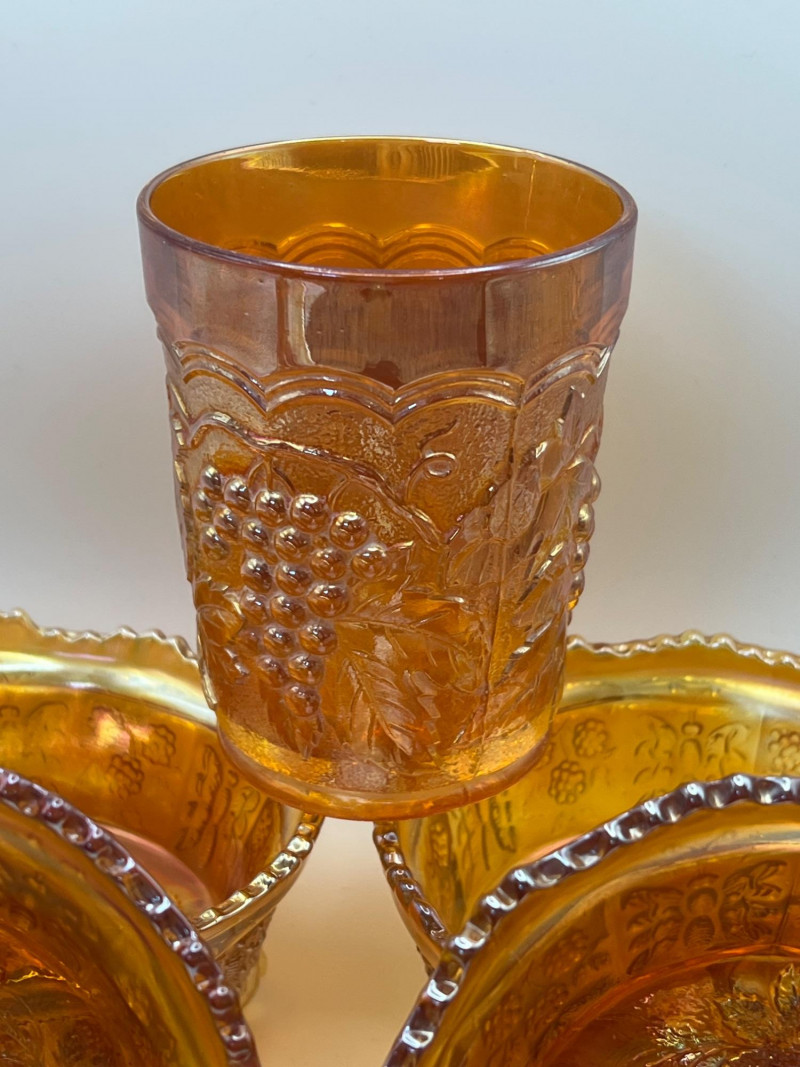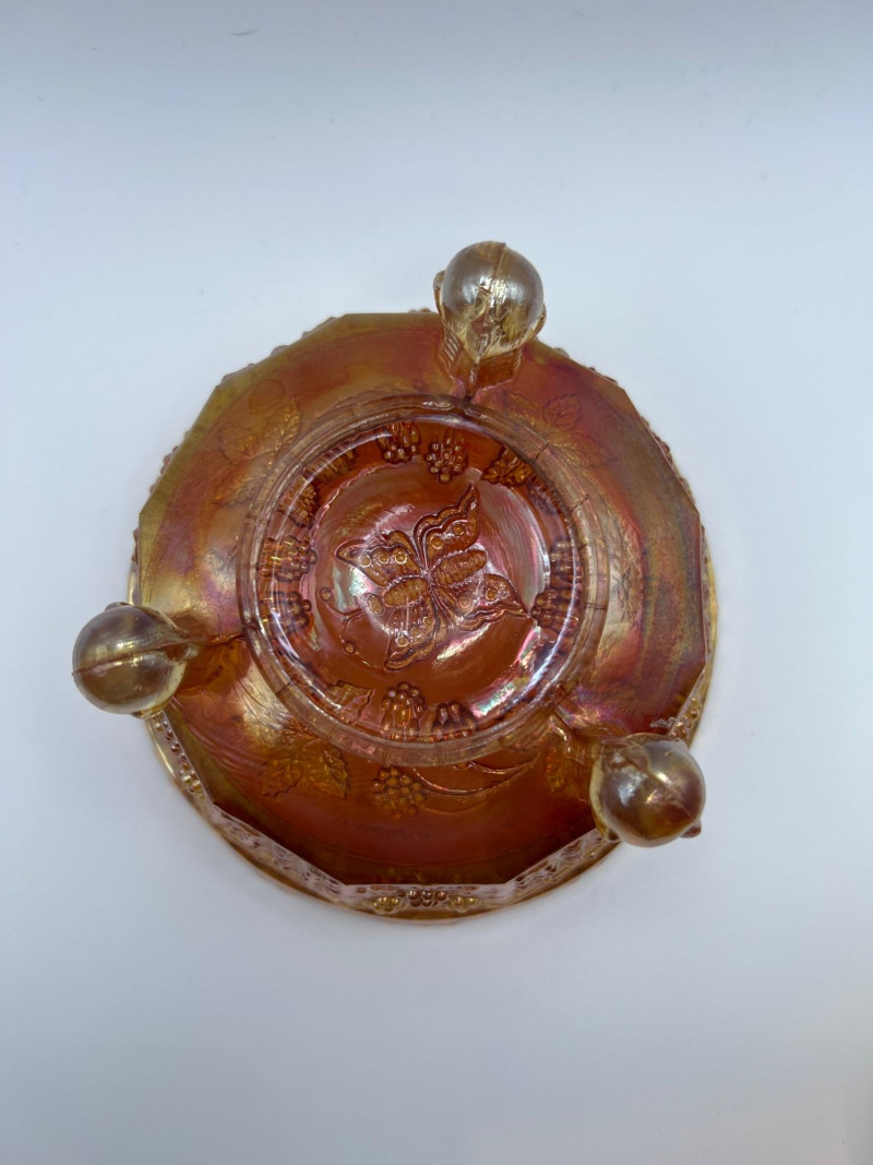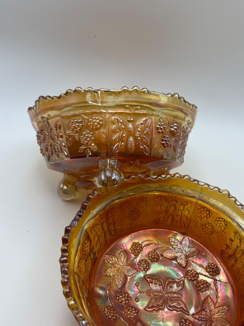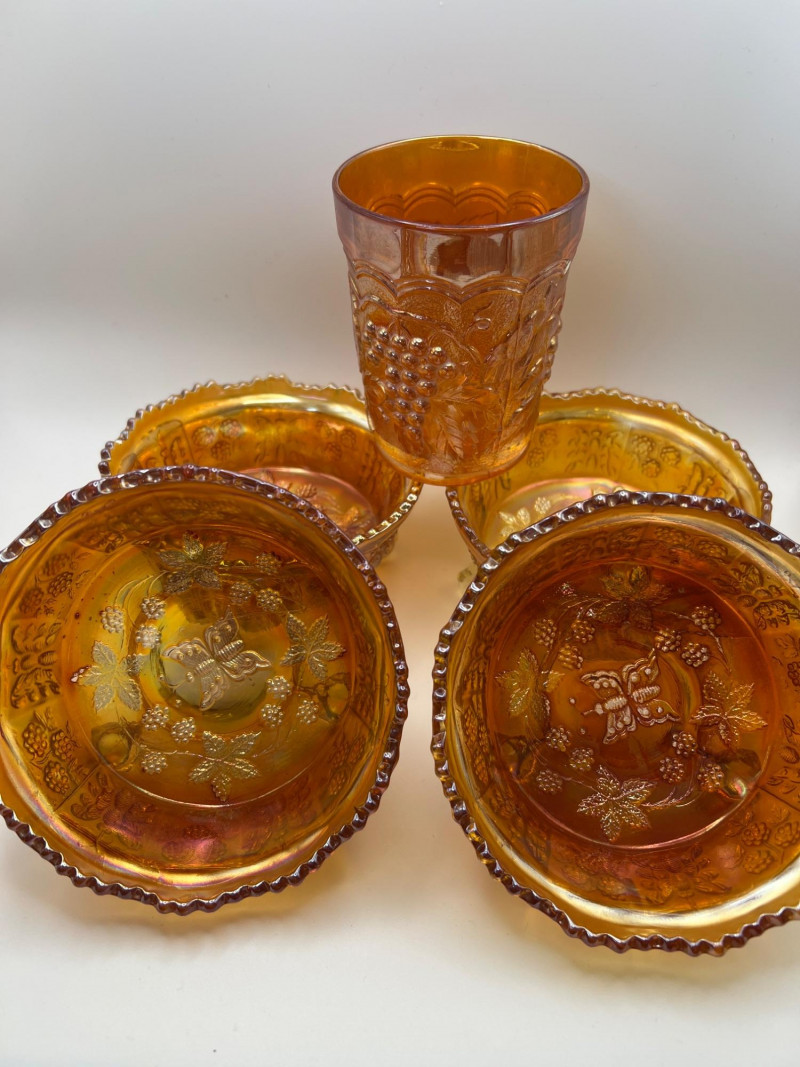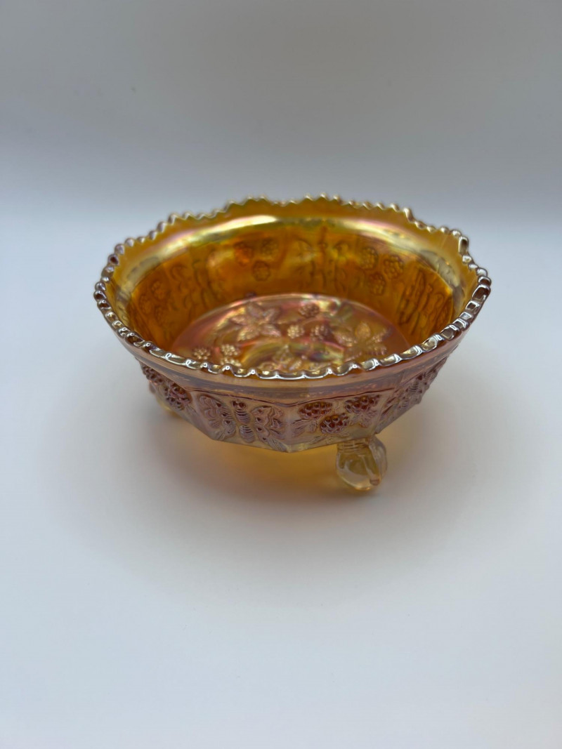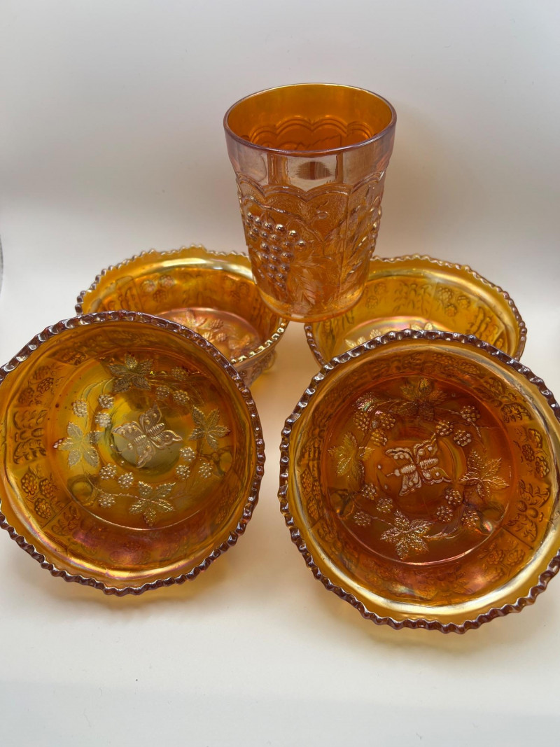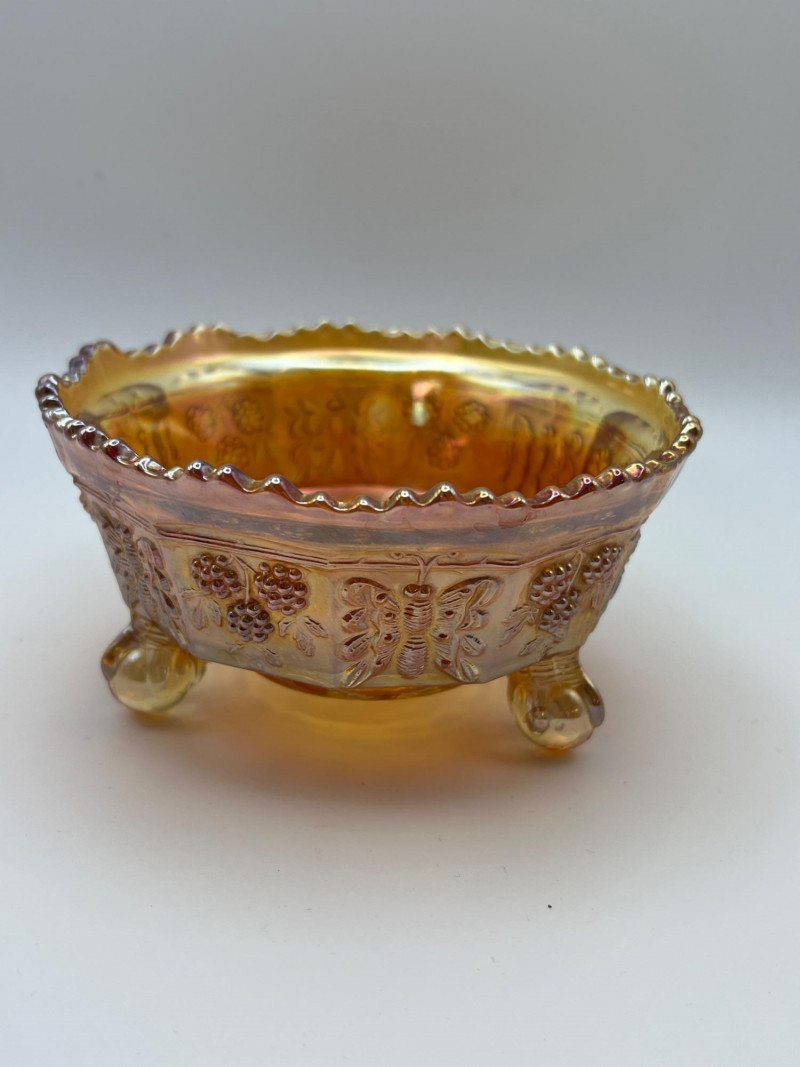 Grouping of vintage marigold carnival glass, including three footed berry bowls with butterfly and grapevine motifs and one matching marigold tumbler featuring a grape pattern and starburst base. These pieces display the classic warm iridescence associated with early‑ to mid‑20th‑century carnival glass production, with detailed pressed‑glass patterns and scalloped edges. Potentially Indiana Glass Company? or Imperial? Both were known for these patterns. A coordinated decorative lot ideal for collectors, display arrangements, or vintage glass enthusiasts. Marigold 3-footed bowls - 4.75” round x 2.25” tall Marigold juice glasses - 4.25” tall x 3” round