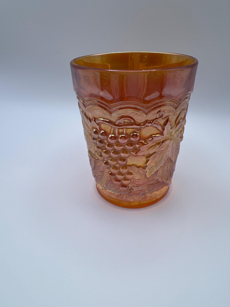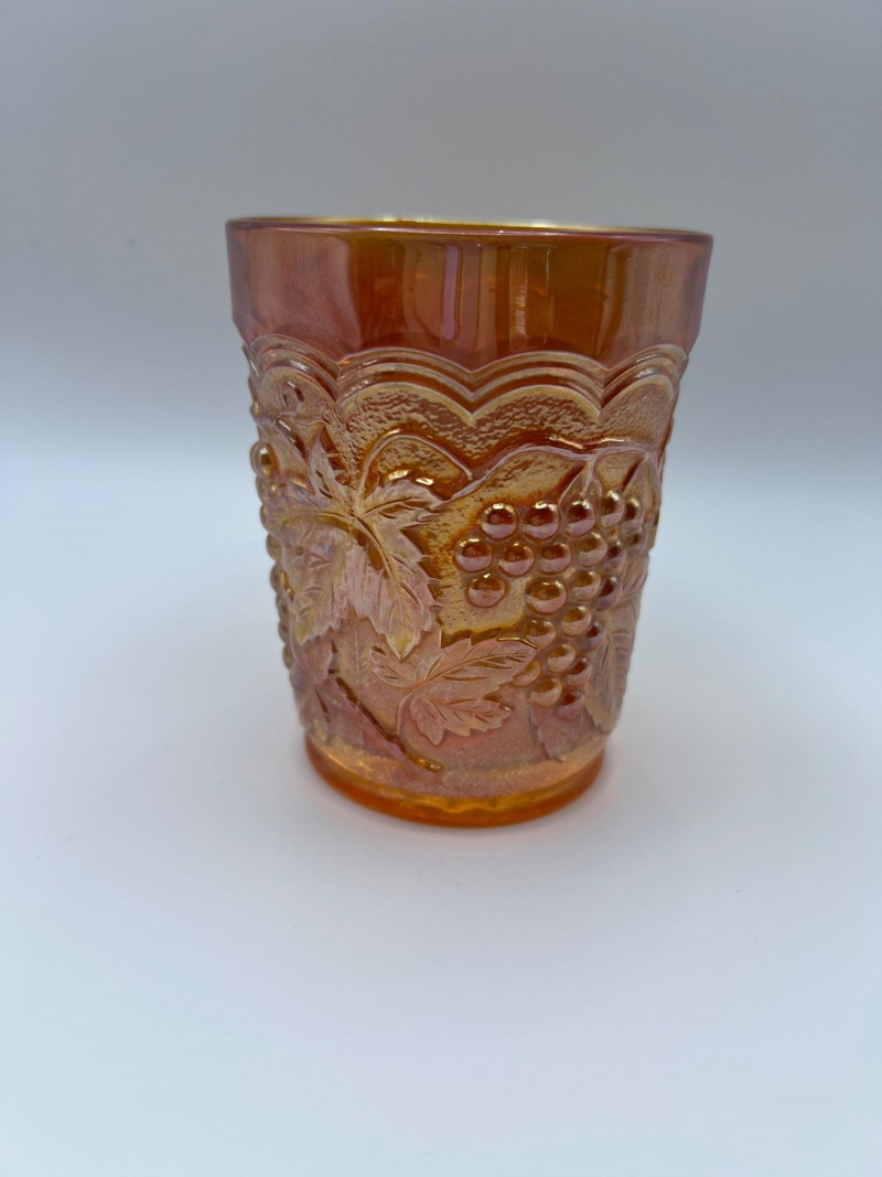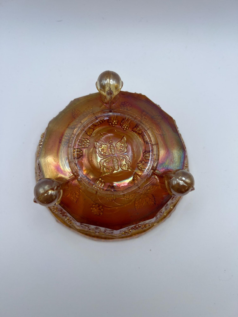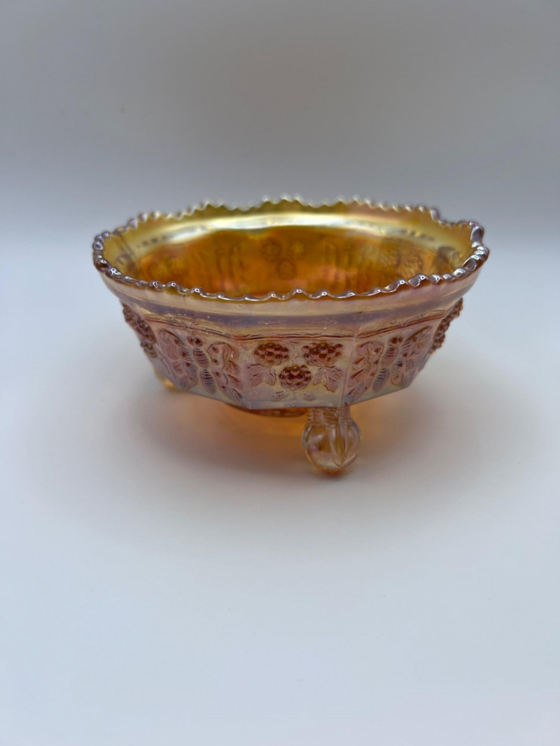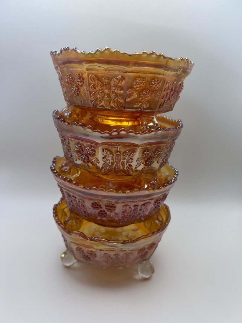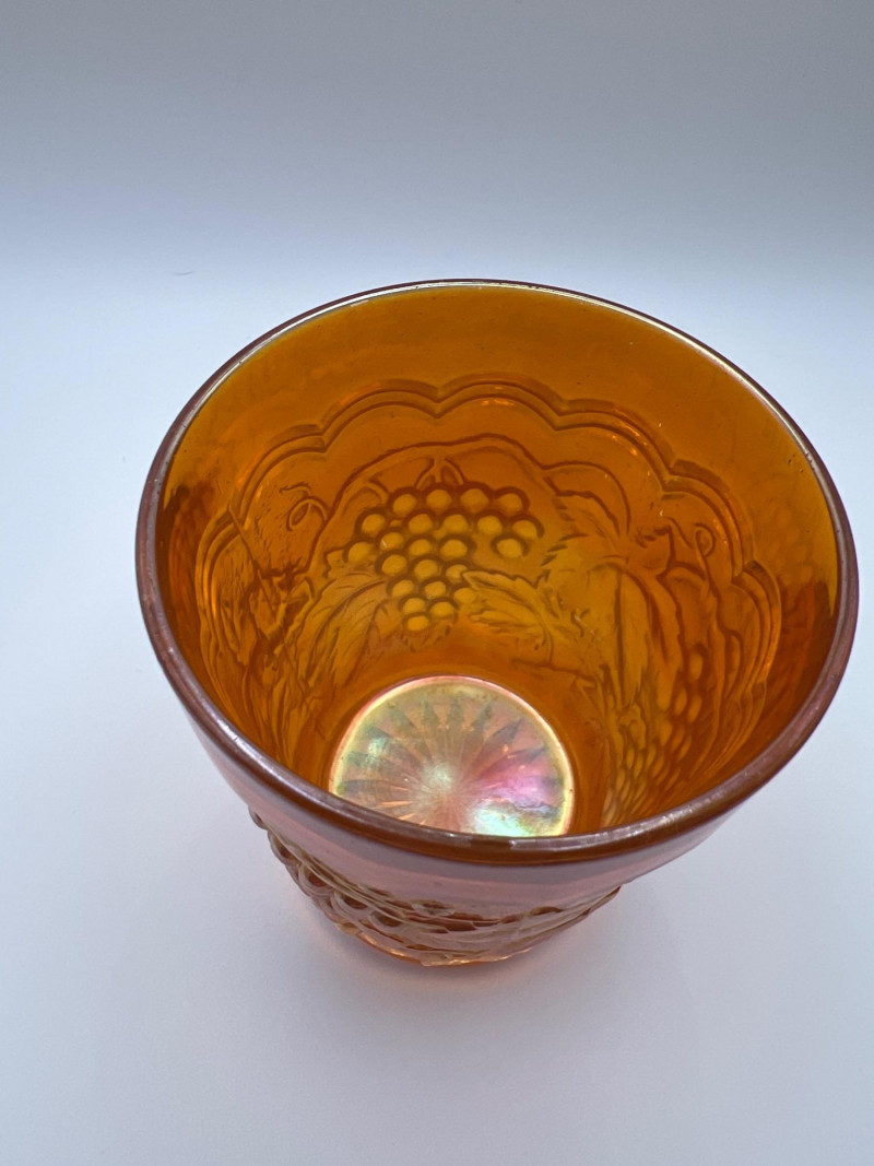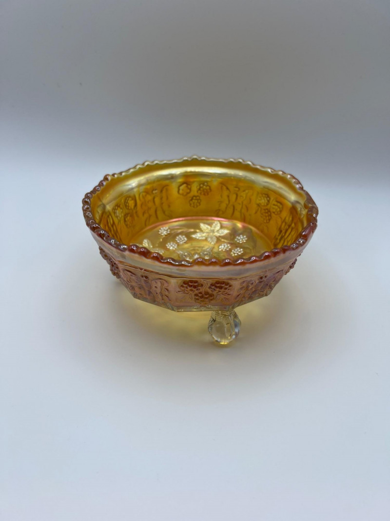 Grouping of vintage marigold carnival glass, including three footed berry bowls with butterfly and grapevine motifs and one matching marigold tumbler featuring a grape pattern and starburst base. These pieces display the classic warm iridescence associated with early‑ to mid‑20th‑century carnival glass production, with detailed pressed‑glass patterns and scalloped edges. Potentially Indiana Glass Company? or Imperial? Both were known for these patterns. A coordinated decorative lot ideal for collectors, display arrangements, or vintage glass enthusiasts. Marigold 3-footed bowls - 4.75” round x 2.25” tall Marigold juice glasses - 4.25” tall x 3” round