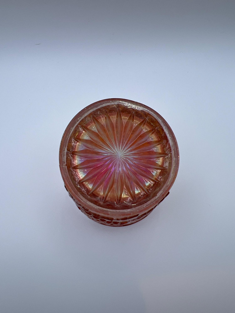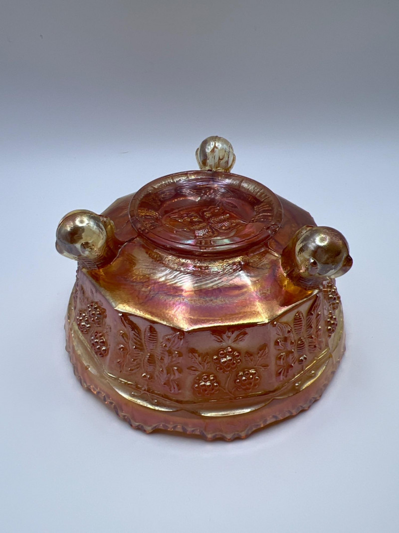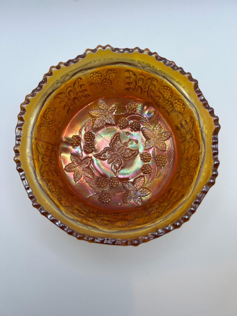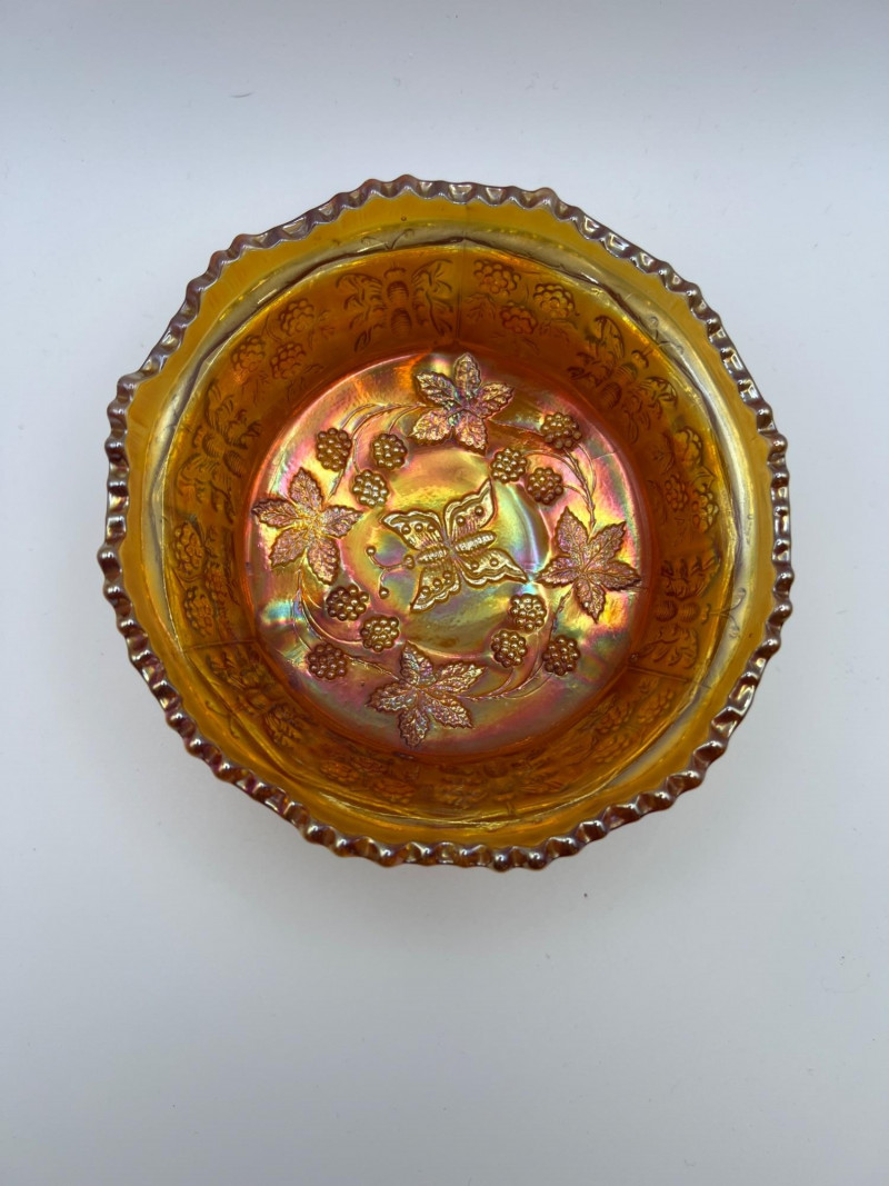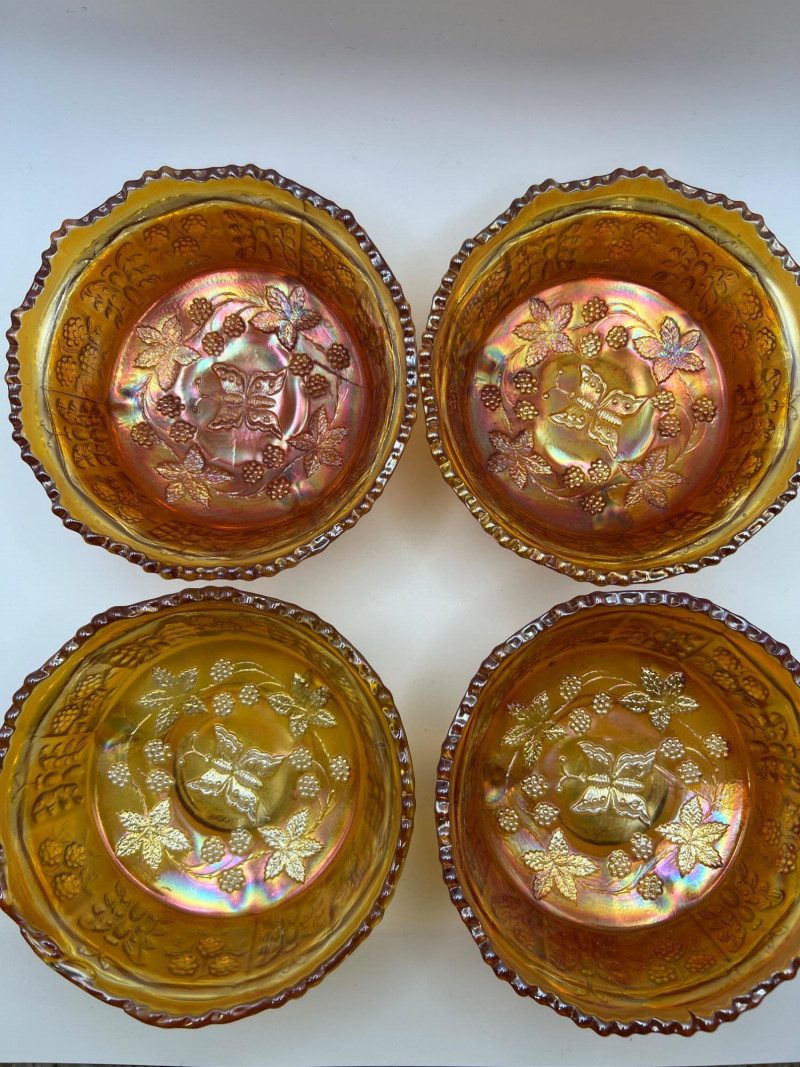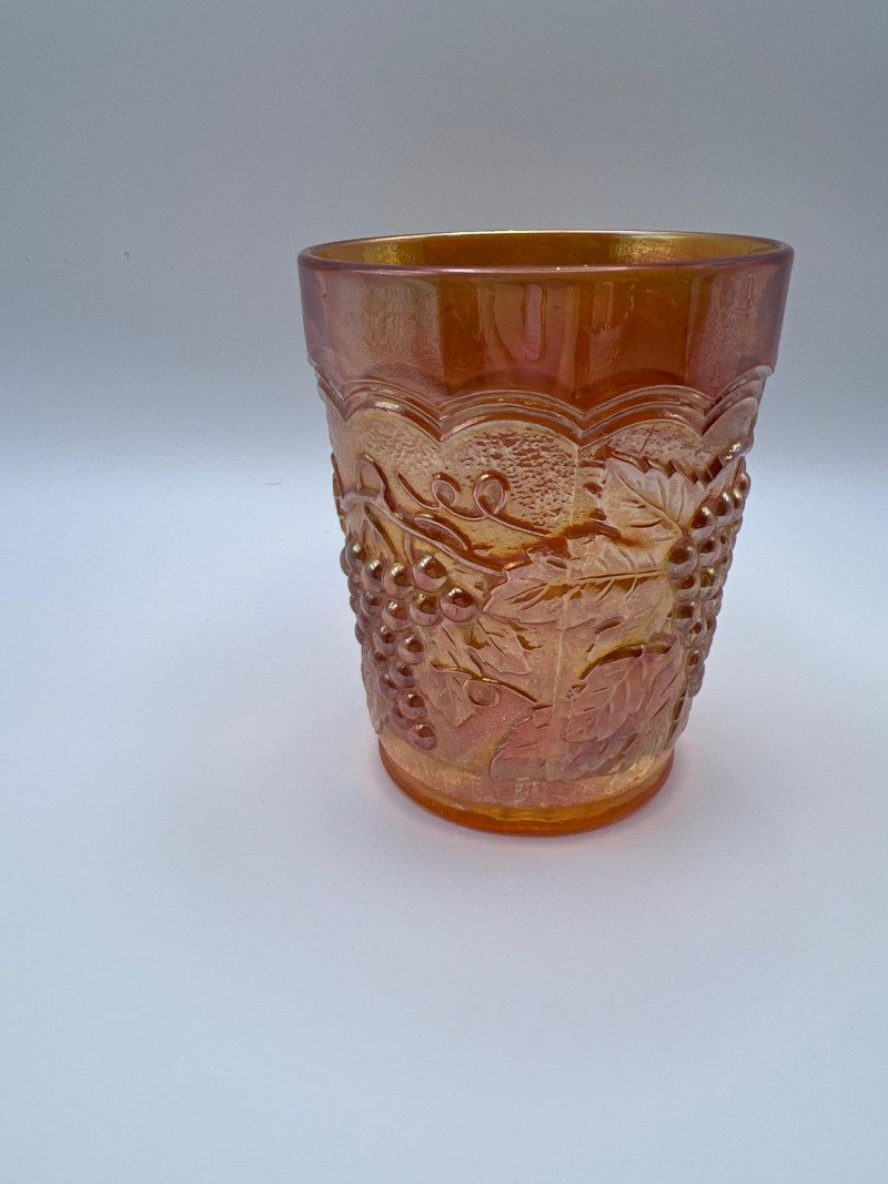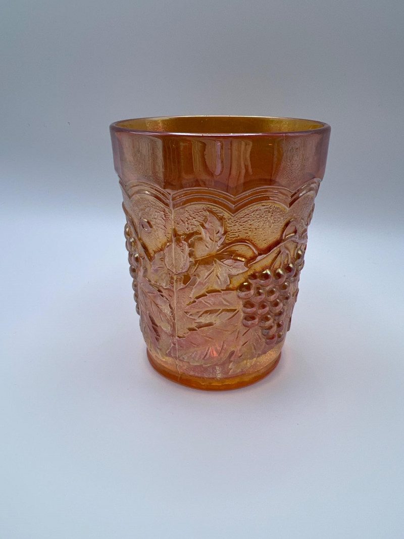 Grouping of vintage marigold carnival glass, including three footed berry bowls with butterfly and grapevine motifs and one matching marigold tumbler featuring a grape pattern and starburst base. These pieces display the classic warm iridescence associated with early‑ to mid‑20th‑century carnival glass production, with detailed pressed‑glass patterns and scalloped edges. Potentially Indiana Glass Company? or Imperial? Both were known for these patterns. A coordinated decorative lot ideal for collectors, display arrangements, or vintage glass enthusiasts. Marigold 3-footed bowls - 4.75” round x 2.25” tall Marigold juice glasses - 4.25” tall x 3” round