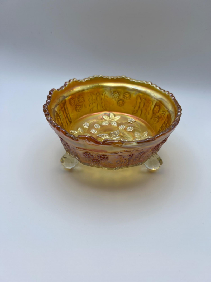 Lot # 28 - Marigold Carnival Glass — Three Footed Berry Bowls & One Grape‑Pattern