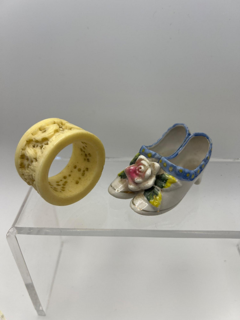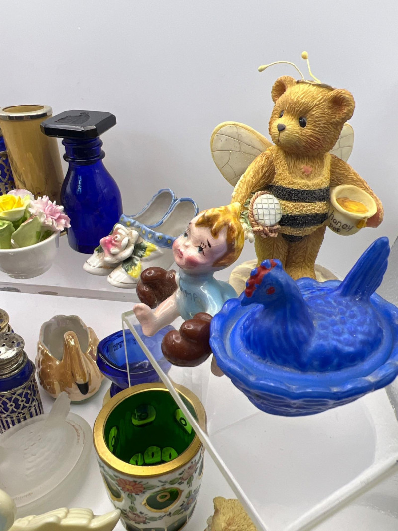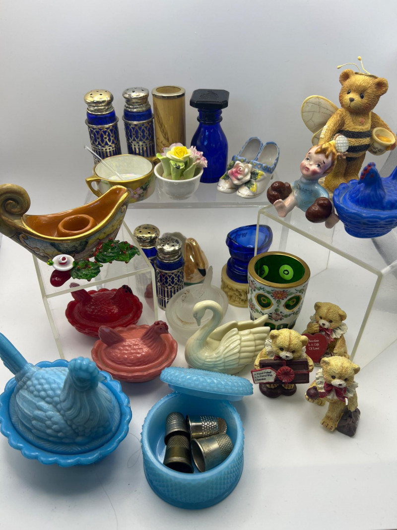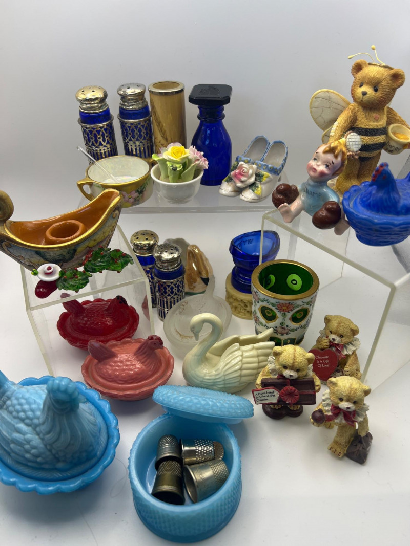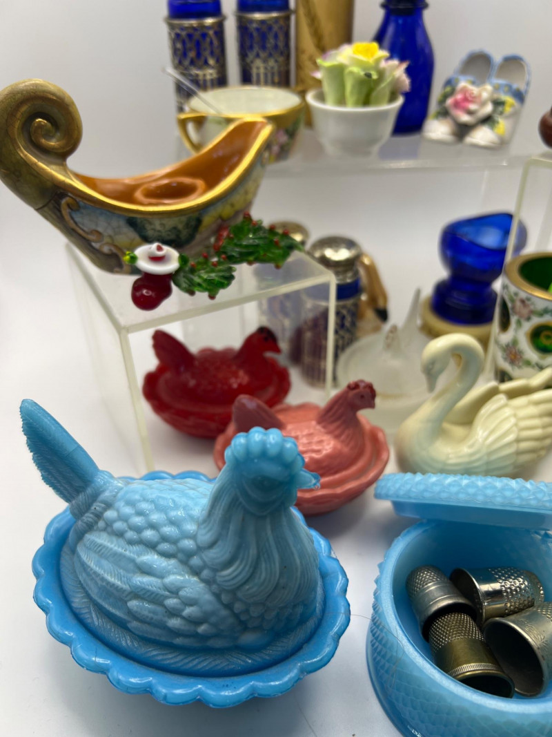 A delightful assortment of vintage miniature collectibles, offering a mix of color, whimsy, and mid‑century charm. Included are several hen‑in‑nest trinket dishes in multiple colors, a pair of cobalt blue and silver‑toned salt and pepper shakers, mid‑century ceramic shoes made in Japan, metal thimbles, Bohemian cased cut to green glass 3 inch cup, Lenox swan and a further array of small figurines, and decorative novelties. A playful, varied grouping perfect for collectors, display, or crafting projects.