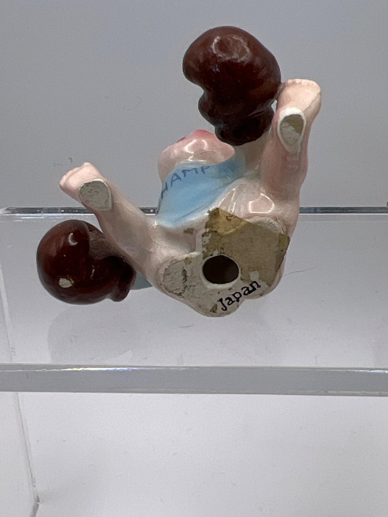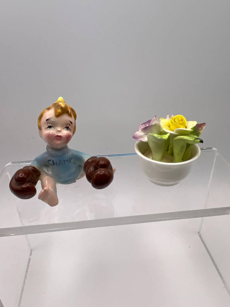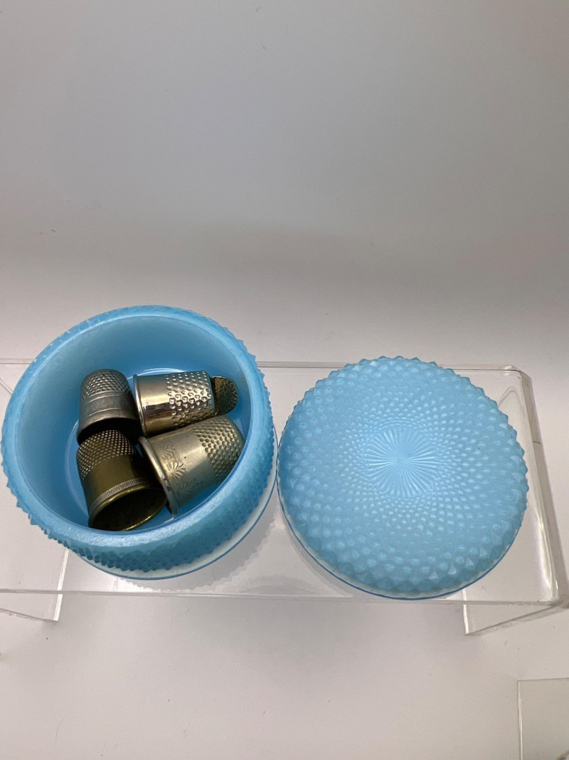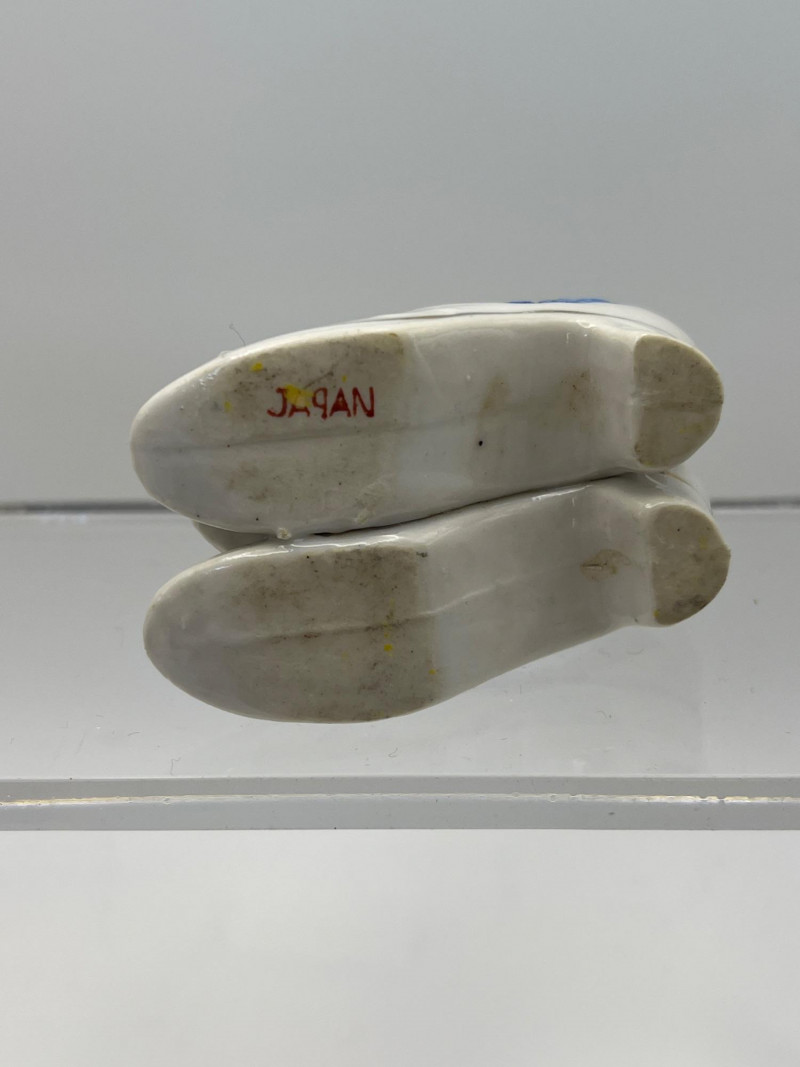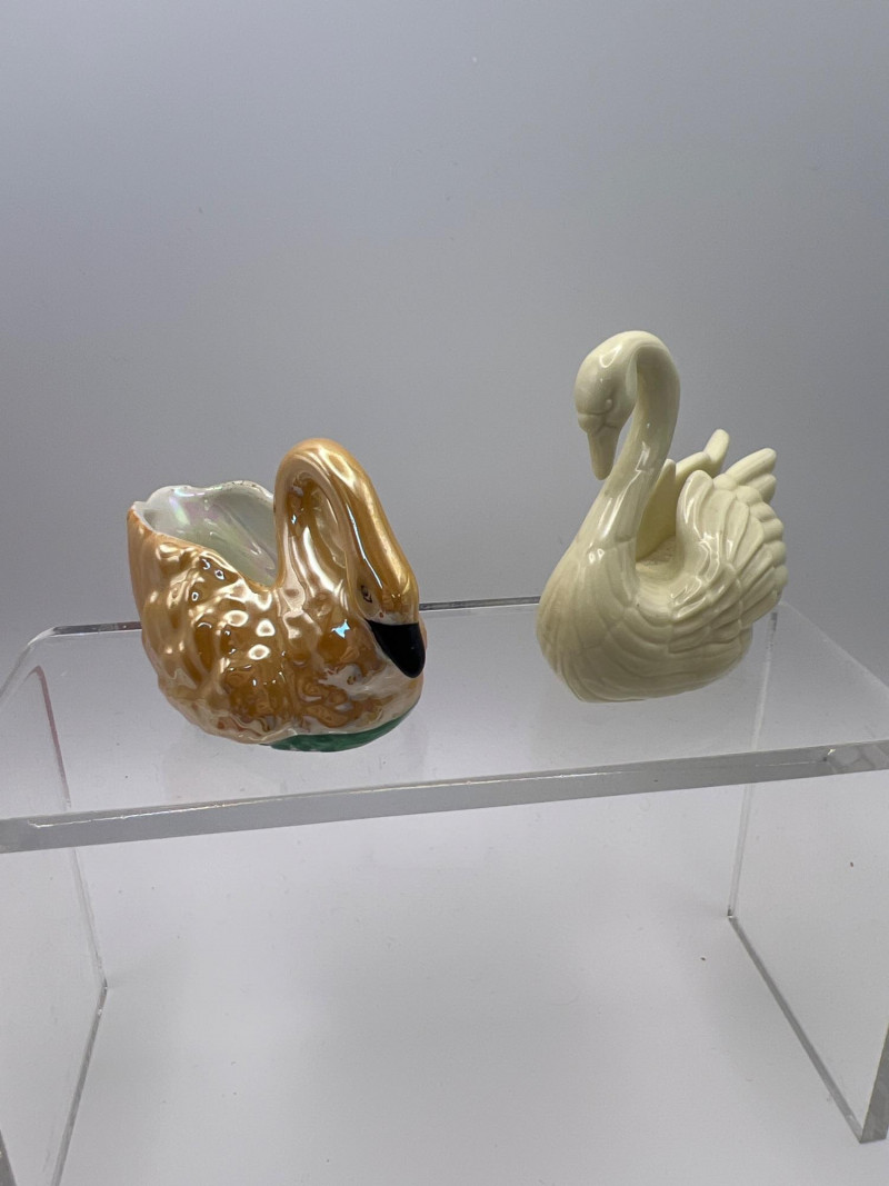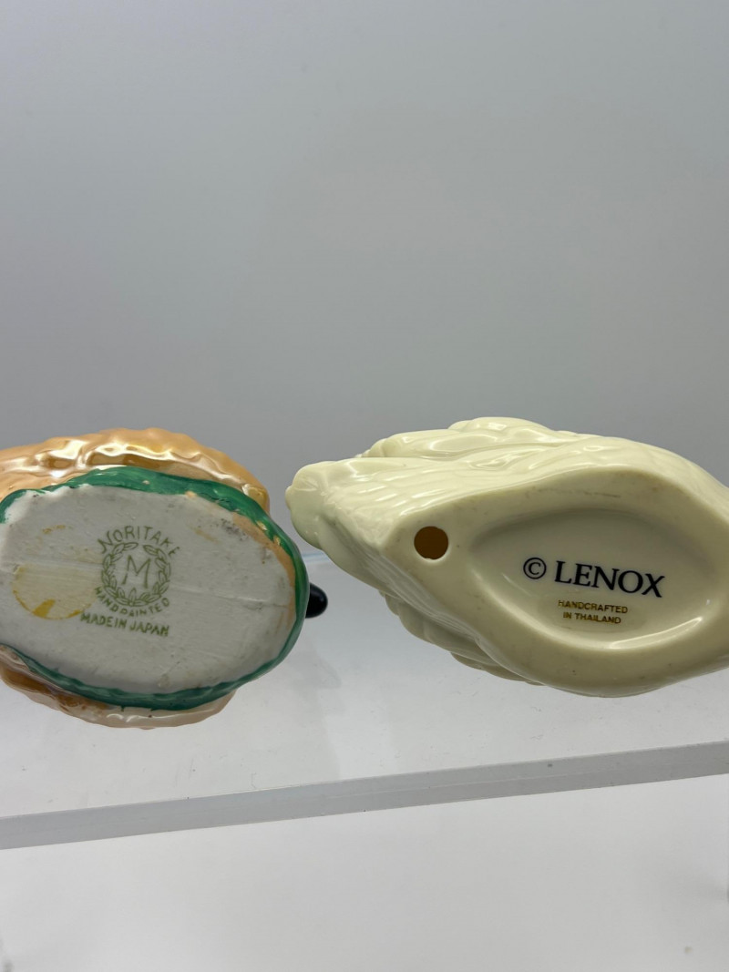 A delightful assortment of vintage miniature collectibles, offering a mix of color, whimsy, and mid‑century charm. Included are several hen‑in‑nest trinket dishes in multiple colors, a pair of cobalt blue and silver‑toned salt and pepper shakers, mid‑century ceramic shoes made in Japan, metal thimbles, Bohemian cased cut to green glass 3 inch cup, Lenox swan and a further array of small figurines, and decorative novelties. A playful, varied grouping perfect for collectors, display, or crafting projects.