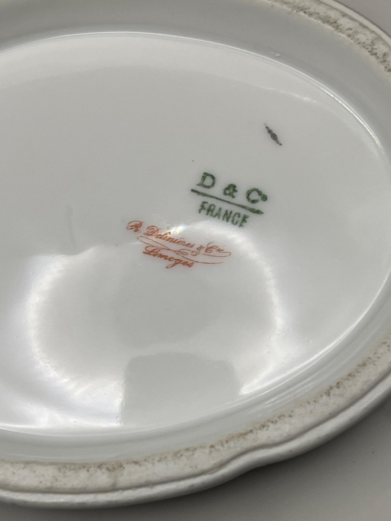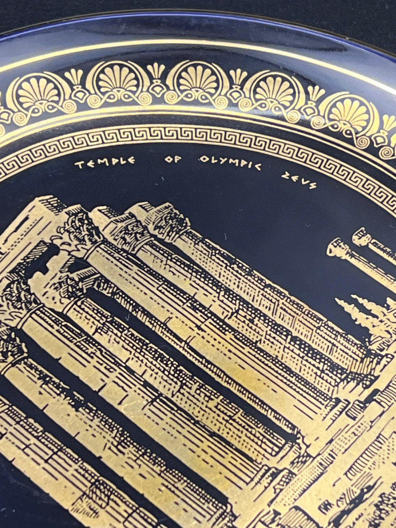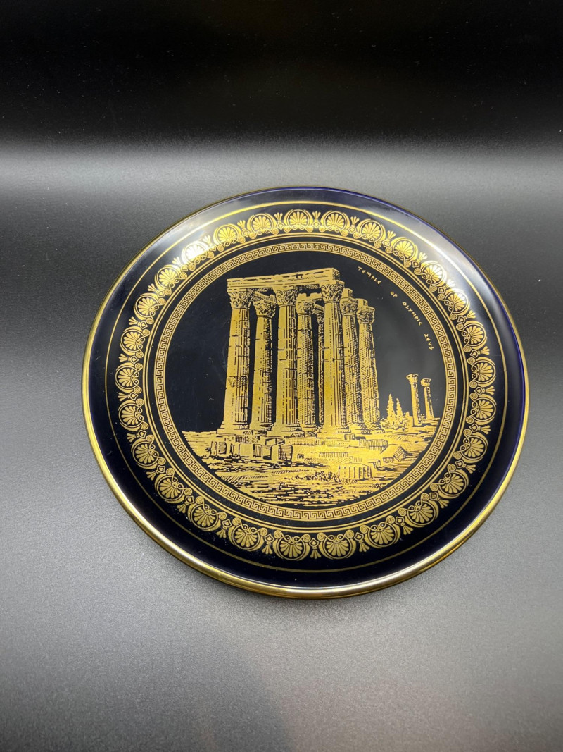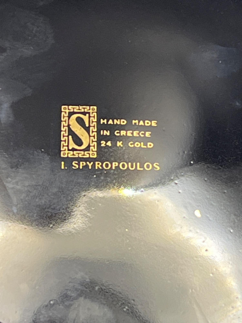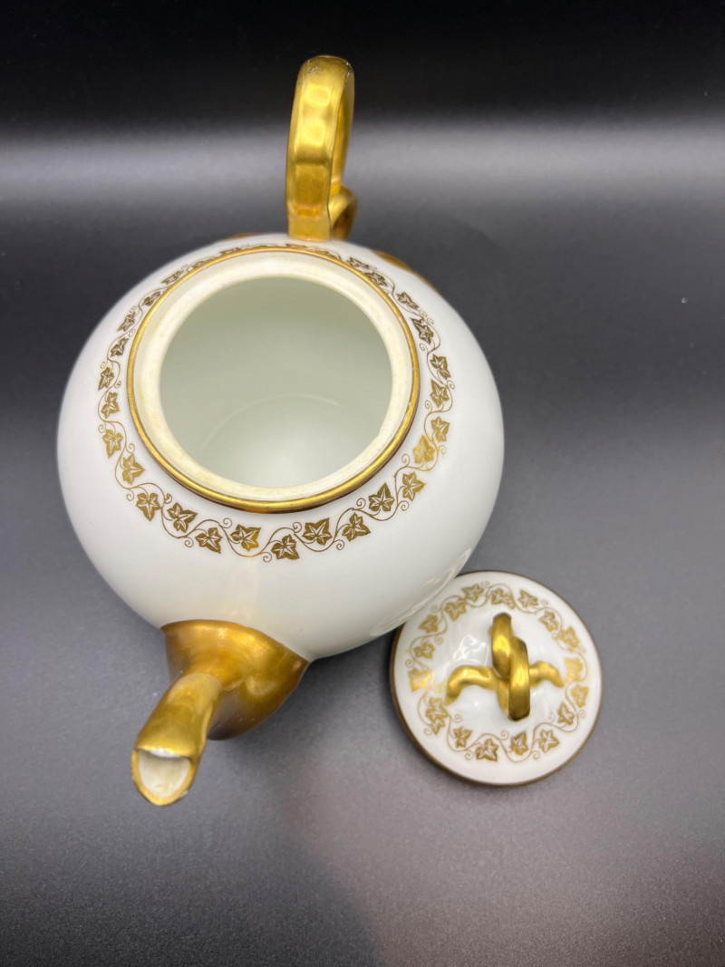 Trio of decorative porcelain pieces including a 24k gold Spyropoulos plate featuring a classical architectural motif, paired with a genuine Limoges covered dish and matching Limoges teapot, both marked D & C France (Delinieres & Co.). The Limoges pieces feature white porcelain bodies with ornate gold ivy detailing, sculpted handles, and refined European craftsmanship characteristic of early 20th‑century French production. A striking mixed grouping for display or collection, combining the bold black‑and‑gold artistry of Spyropoulos with the timeless elegance of authentic Limoges porcelain. Teapot - 7.5” length x 4” tall x 5” wide Lidded Bowl - 11” length x 7” width x 6” height 24K Gold Etched Plate - 7.5” round
