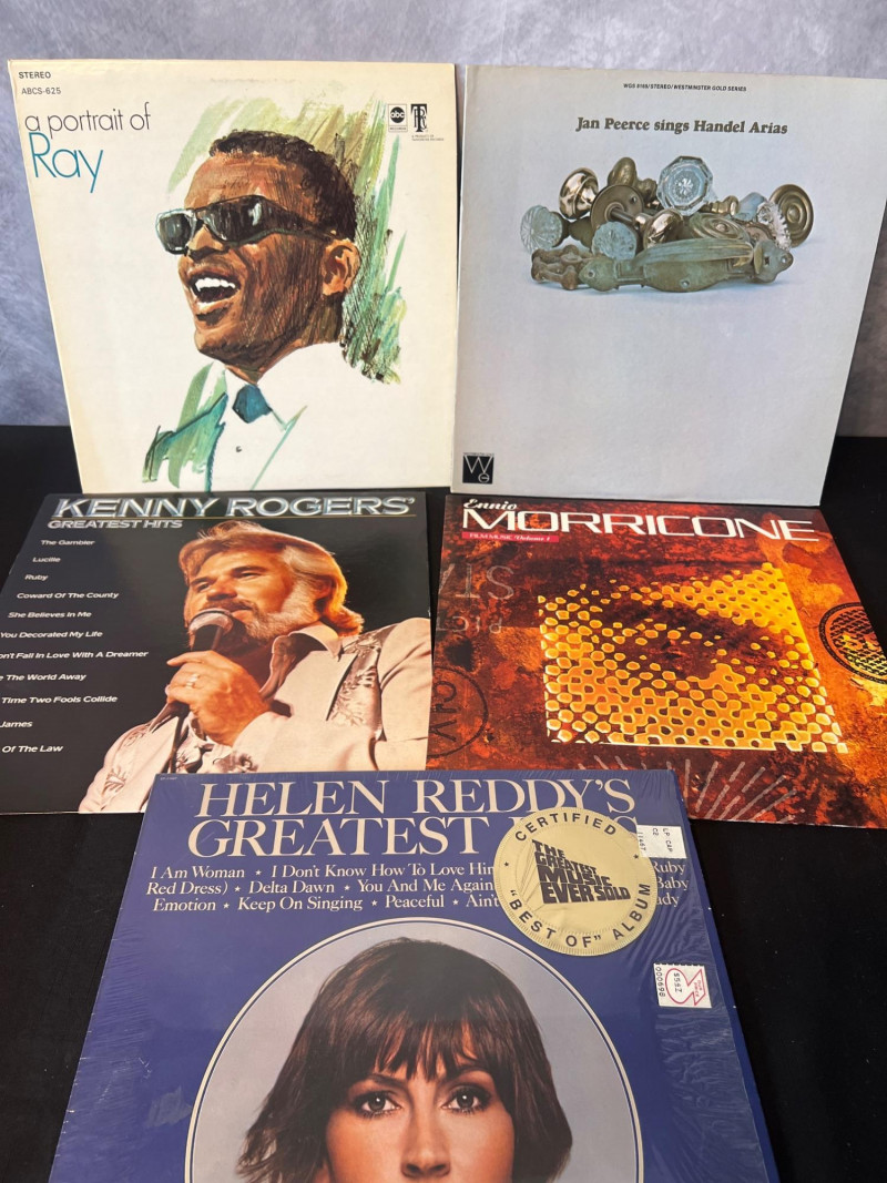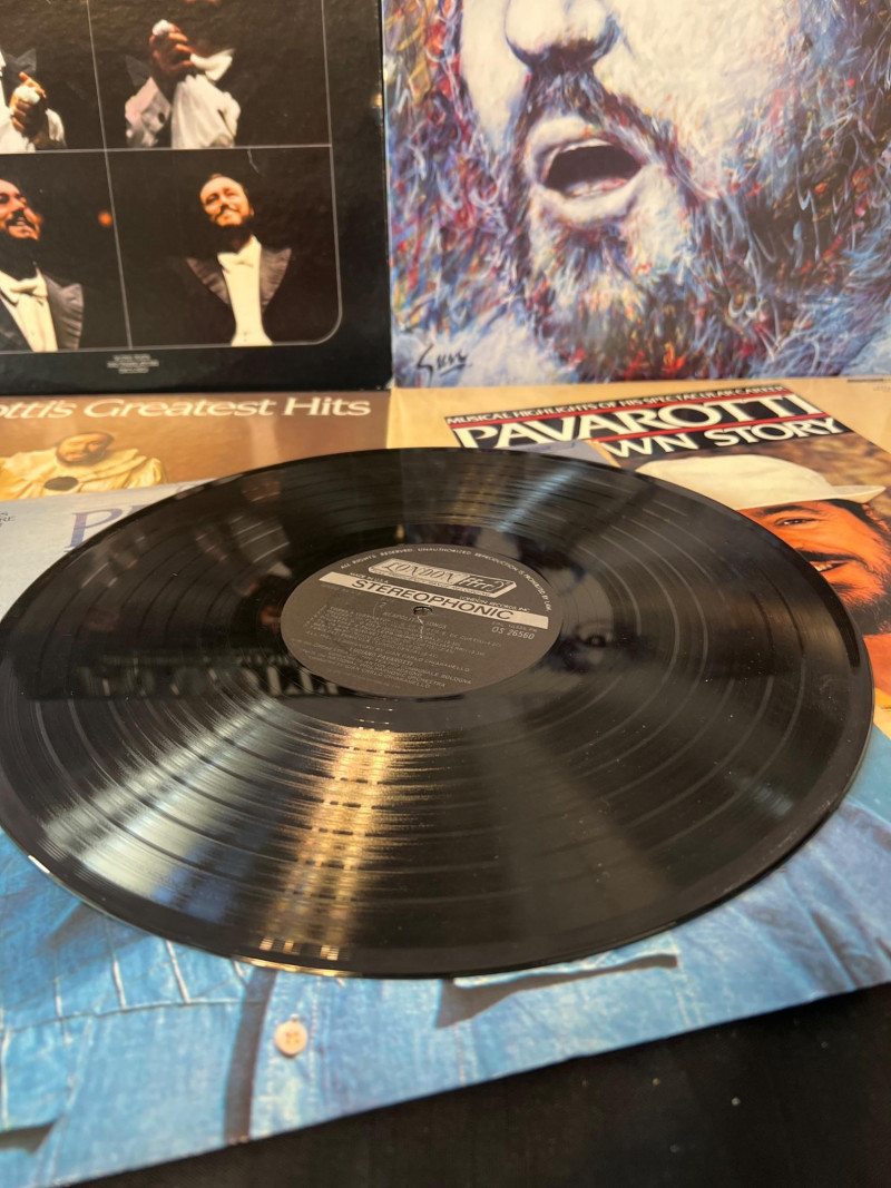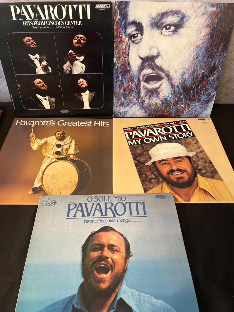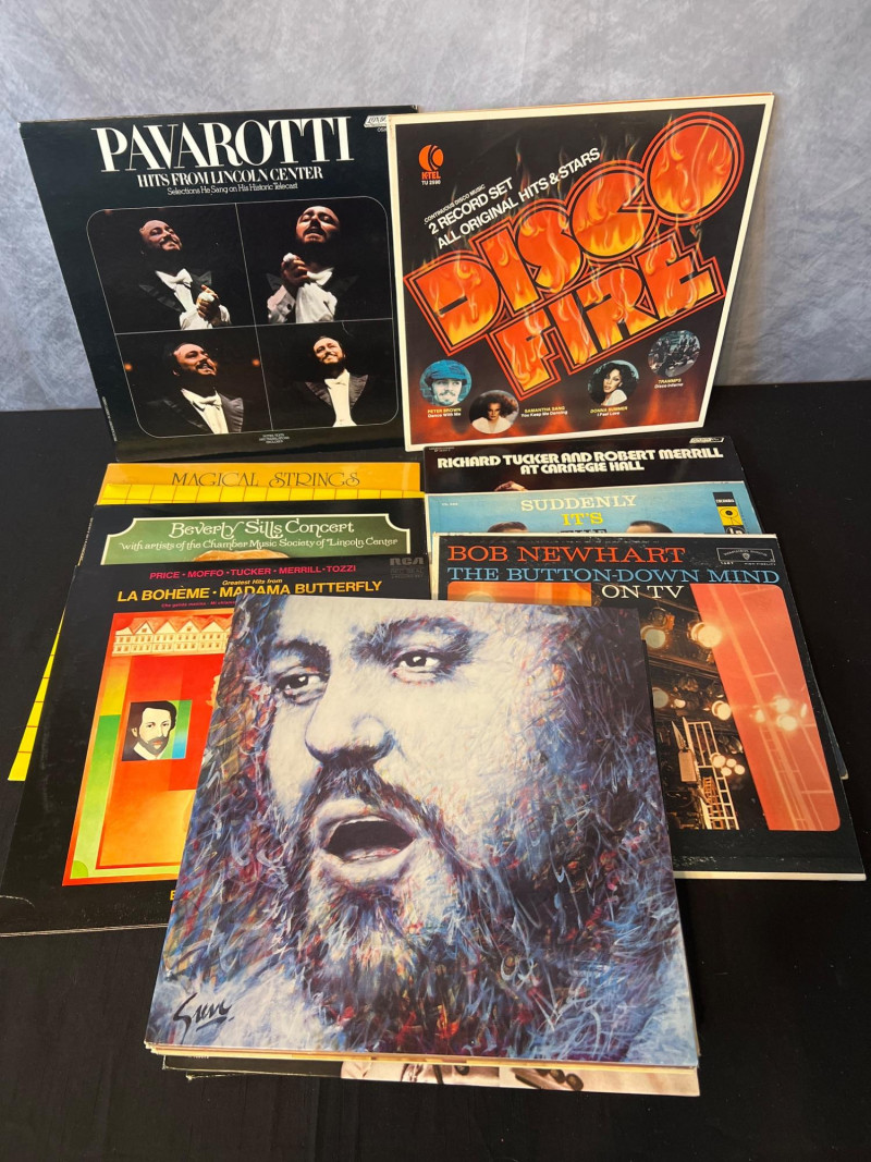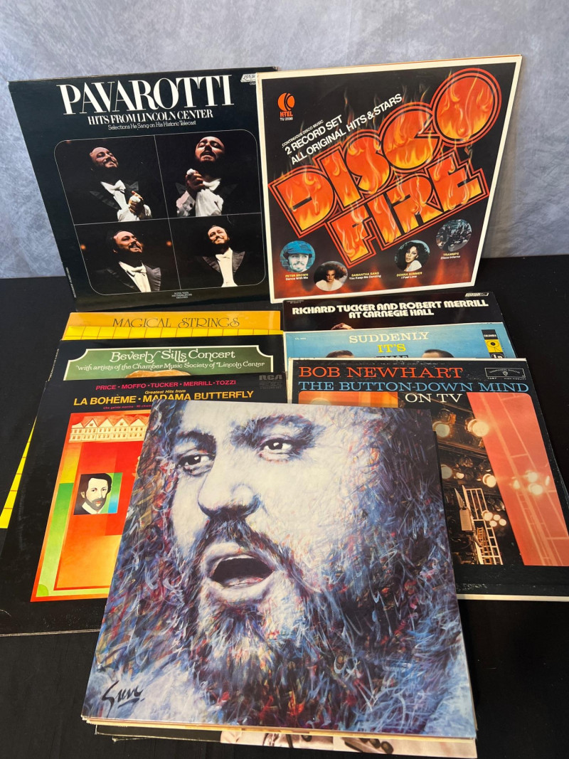 A mixed vinyl LP collection spanning classical, opera, soul, country, comedy, and disco. Highlights include Luciano Pavarotti performances, Ray Charles, and Kenny Rogers, along with additional albums such as Disco Fire, Magical Strings, Beverly Sills Concert, La Bohème / Madama Butterfly, and Suddenly It’s Bob Newhart. A diverse group ideal for collectors, listeners, and anyone building a vintage record library. Some artists and albums include: Luciano Pavarotti – multiple performances including Hits from Lincoln Center Ray Charles Kenny Rogers Beverly Sills Bob Newhart – The Button‑Down Mind on TV Disco Fire – 2‑Record Set Magical Strings La Bohème / Madama Butterfly (opera selections)