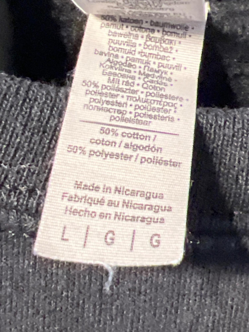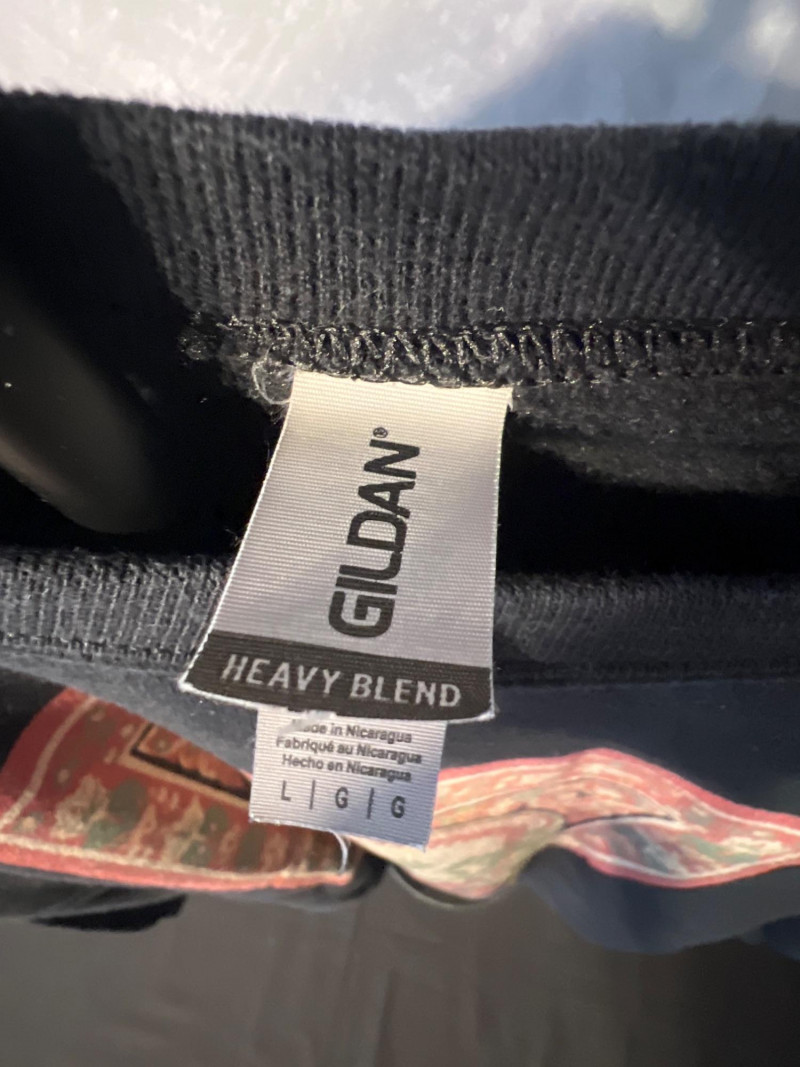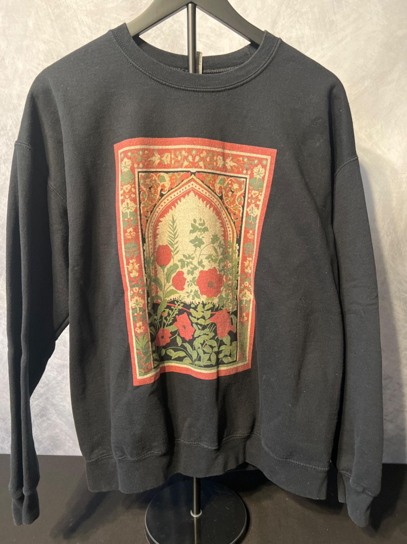 Colorful chicken graphic with bold text on a soft dark‑gray hoodie. Dark Gray Sweatshirt – Floral Tapestry Motif Size Large