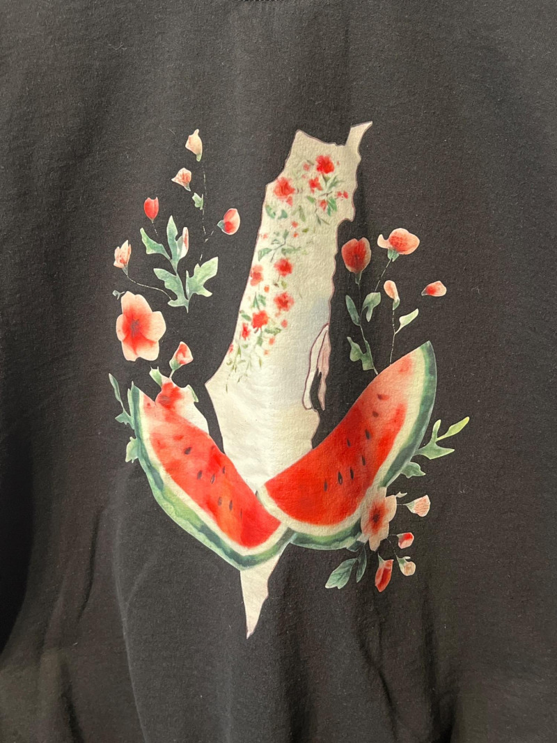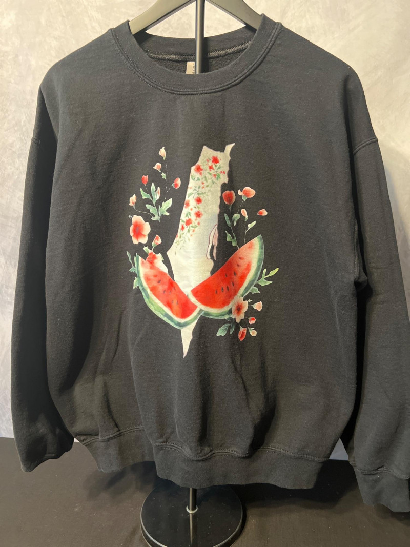 Row of stylized chickens in yellow, white, orange, and red. Dark Gray Sweatshirt – Fox & Watermelon Floral Graphic Size Large