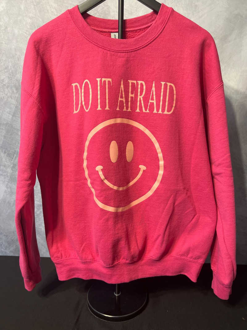 Ornate, tapestry‑style multicolor design on a classic crewneck. Bright Pink Sweatshirt – “Do It Afraid” Size Large