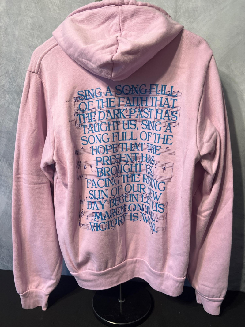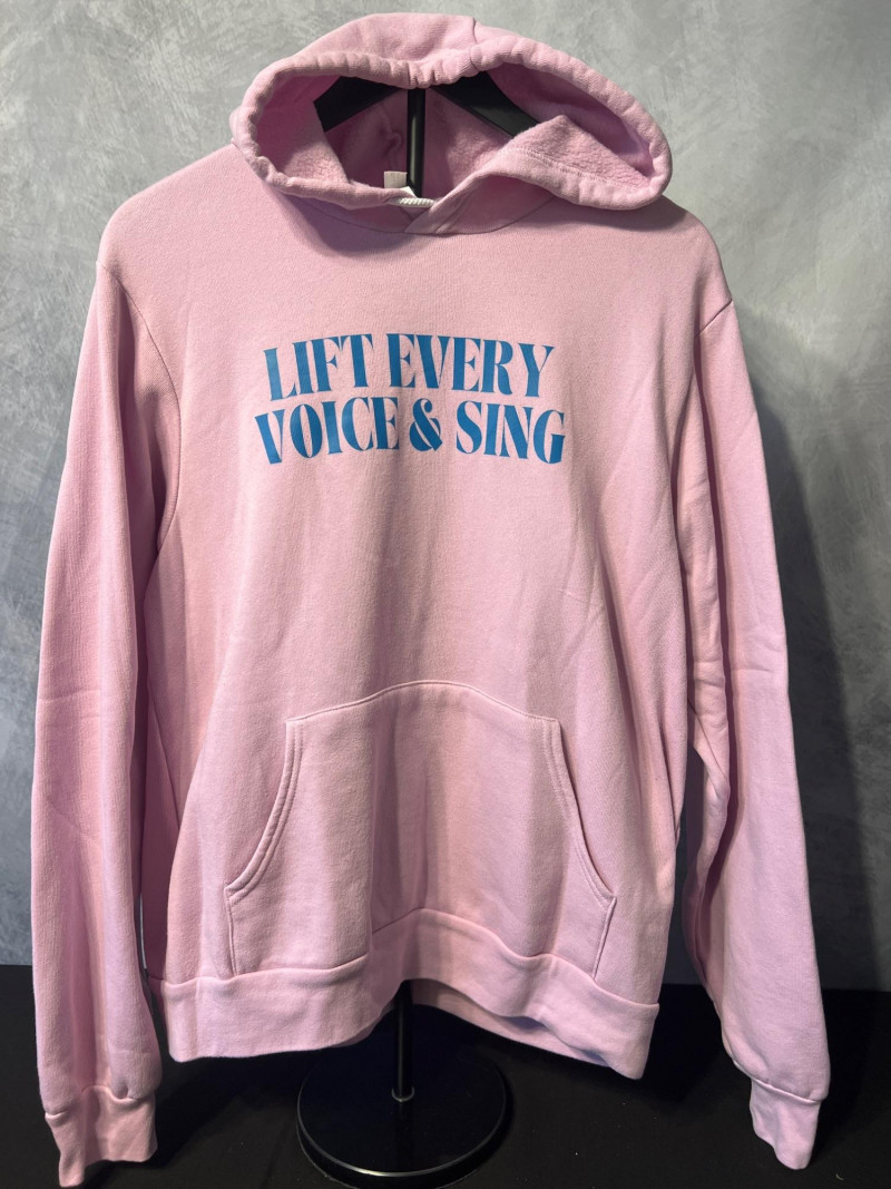 Large smiley face graphic with motivational text. Light Pink Hoodie – “Lift Every Voice & Sing” Size Large