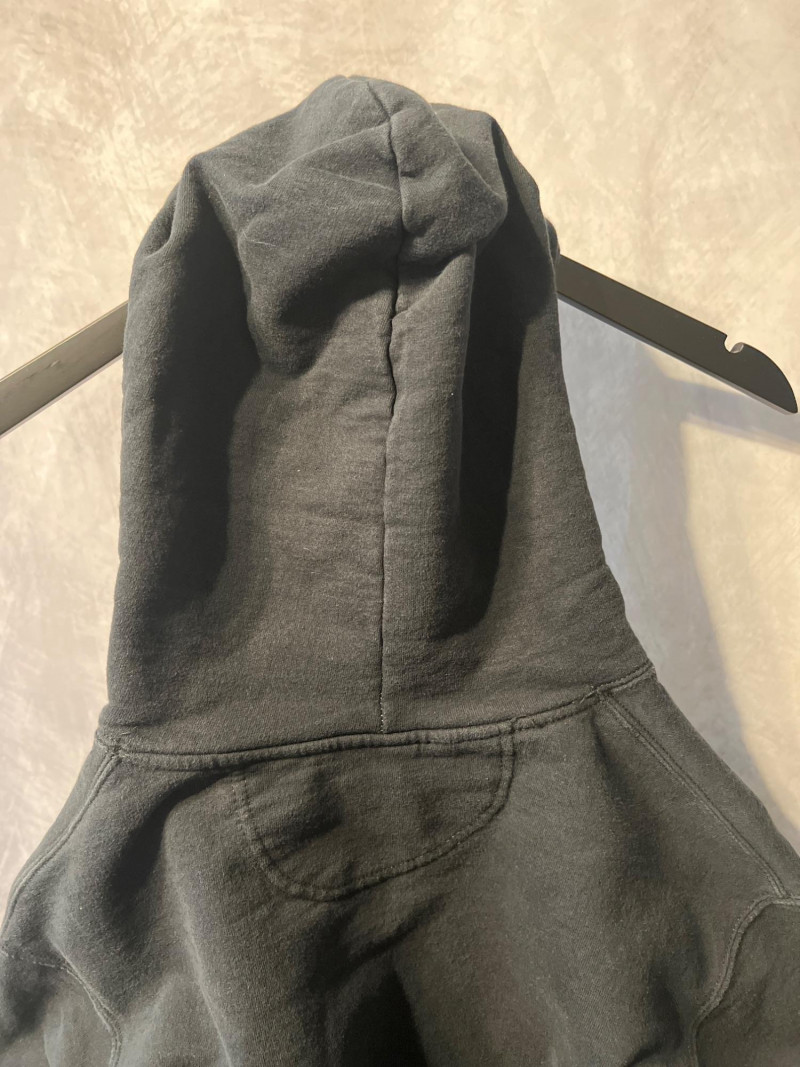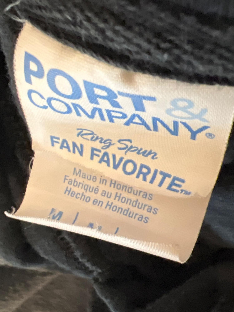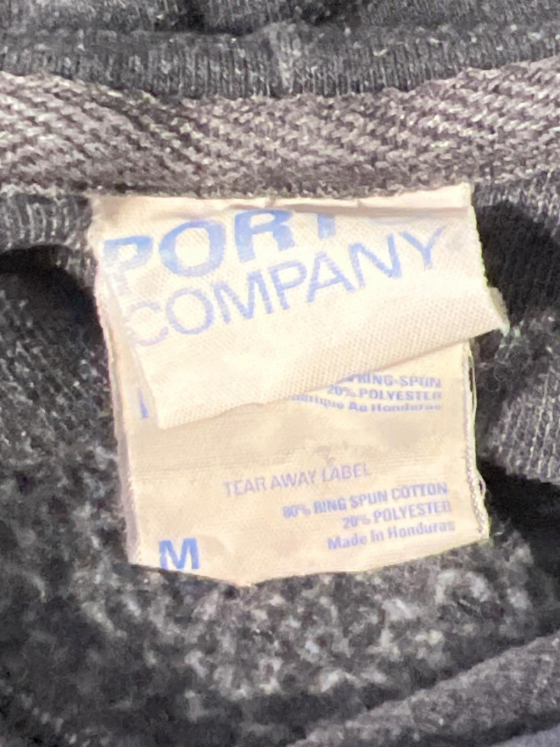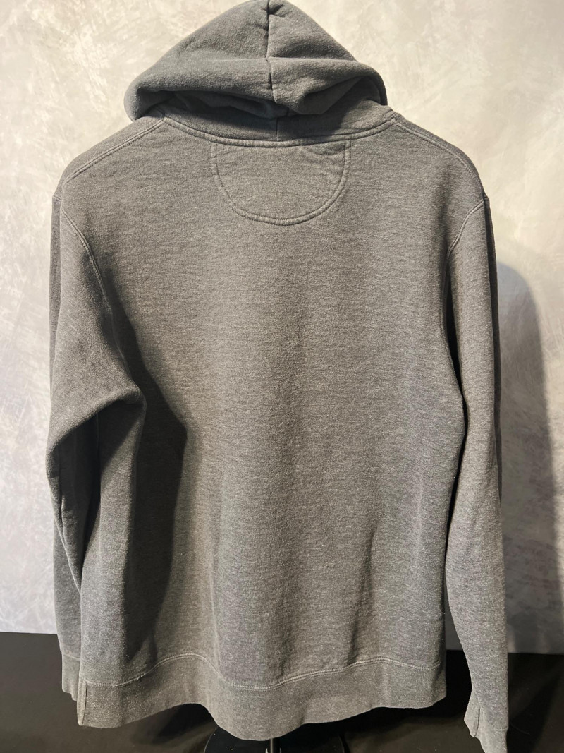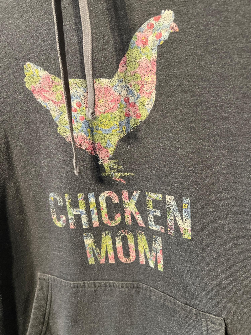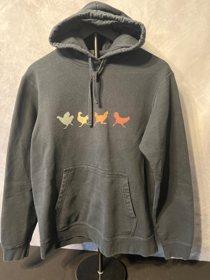 Blue block lettering on a soft pastel hoodie. Dark Gray Hoodie – Four Chicken Silhouettes Size Medium