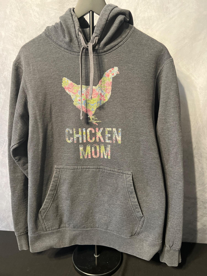 Set of six graphic sweatshirts and hoodies printed on Gildan and Bella+Canvas blanks. Each piece features a distinct motif or message: Dark Gray Hoodie – “Chicken Mom” Size Medium