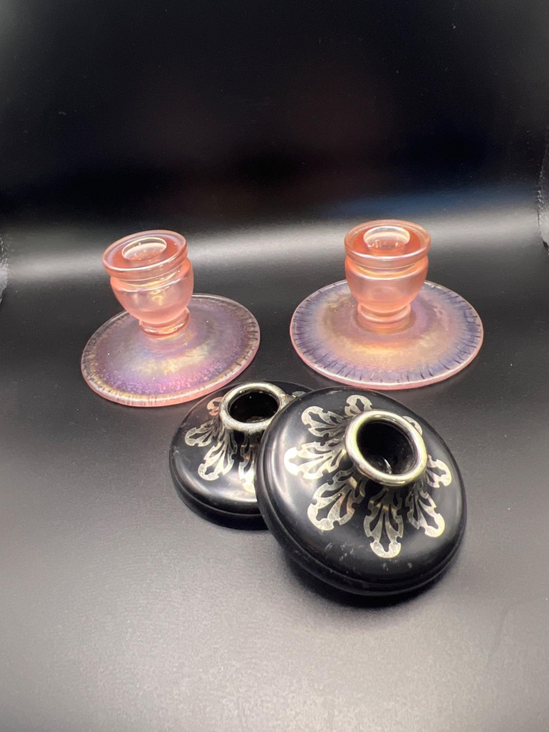 Grouping of four vintage candle holders, including a pair of Harvite black holders with ornate silver‑tone floral detailing and a pair of Fenton Velva Rose pink stretch glass candle holders.