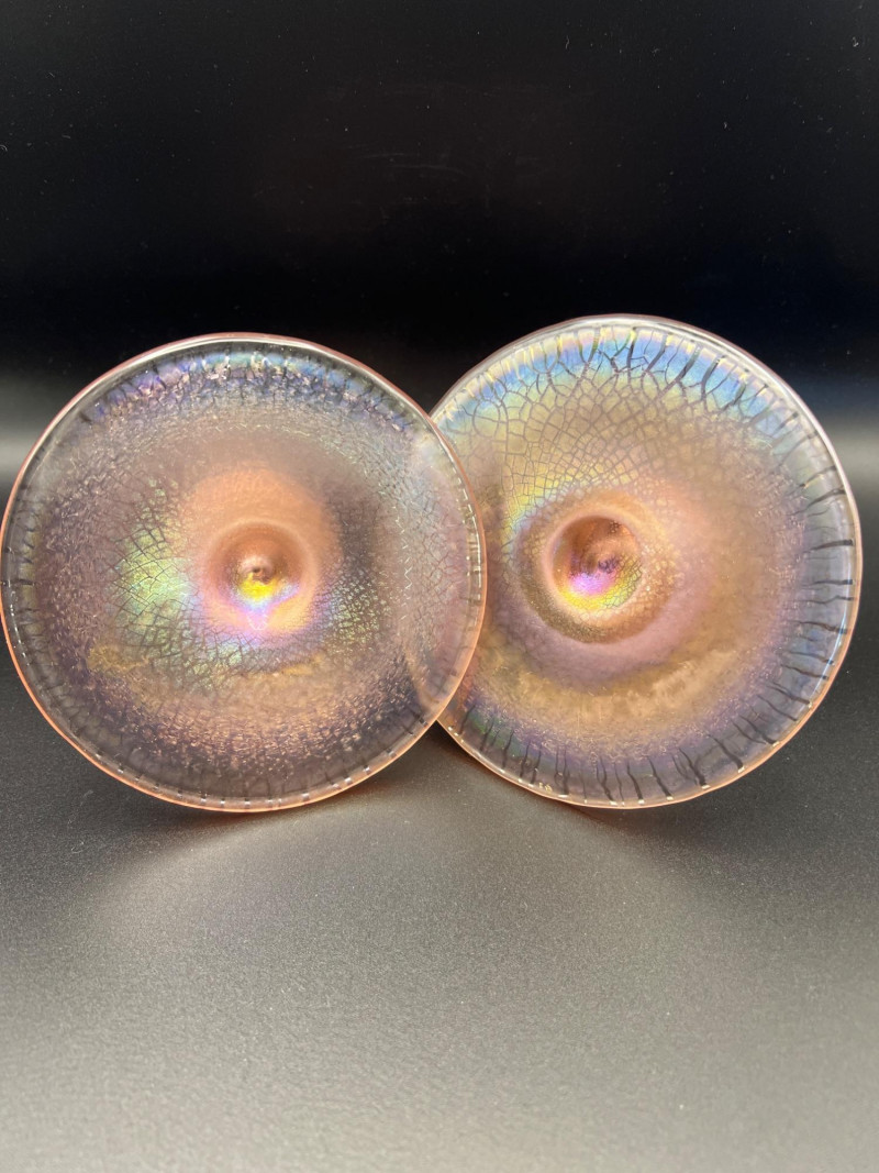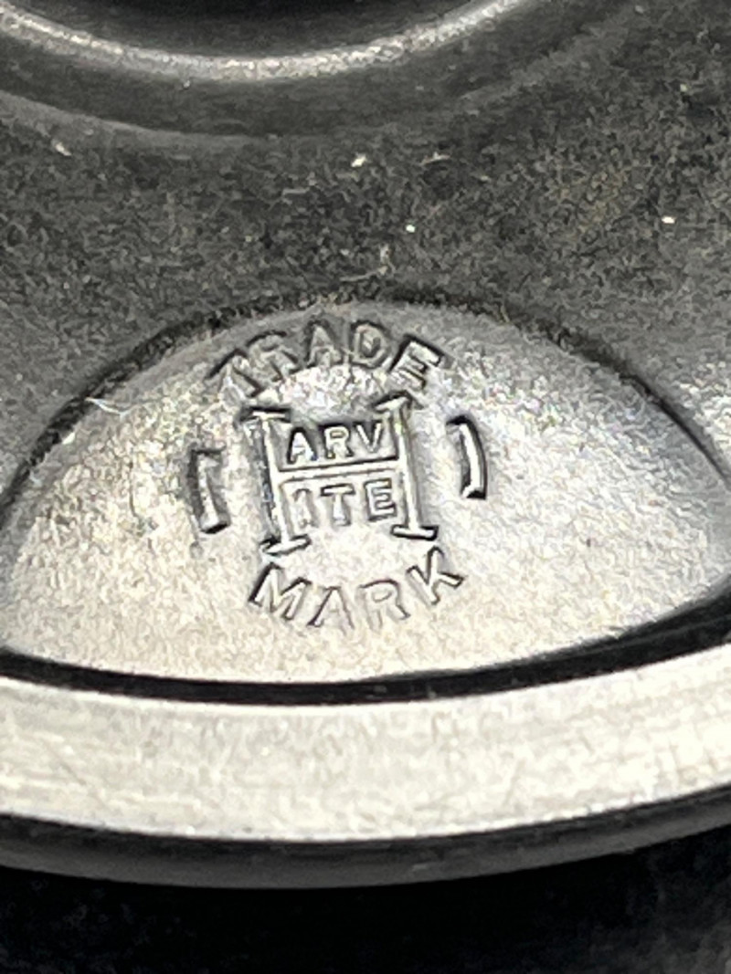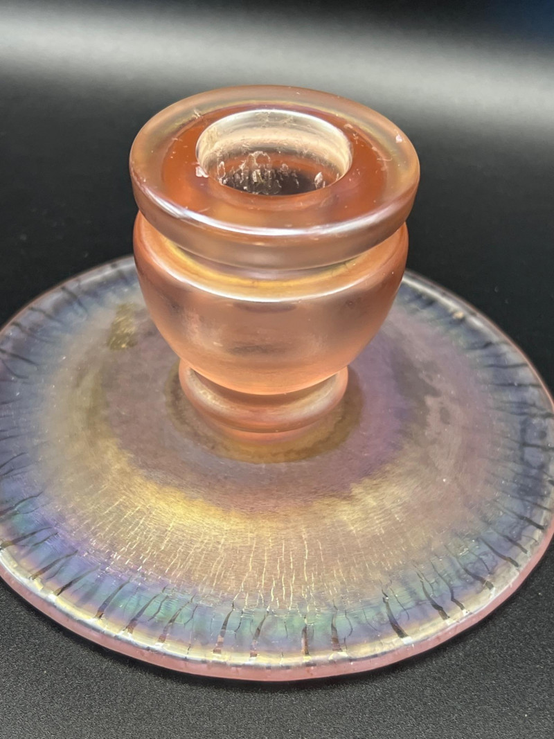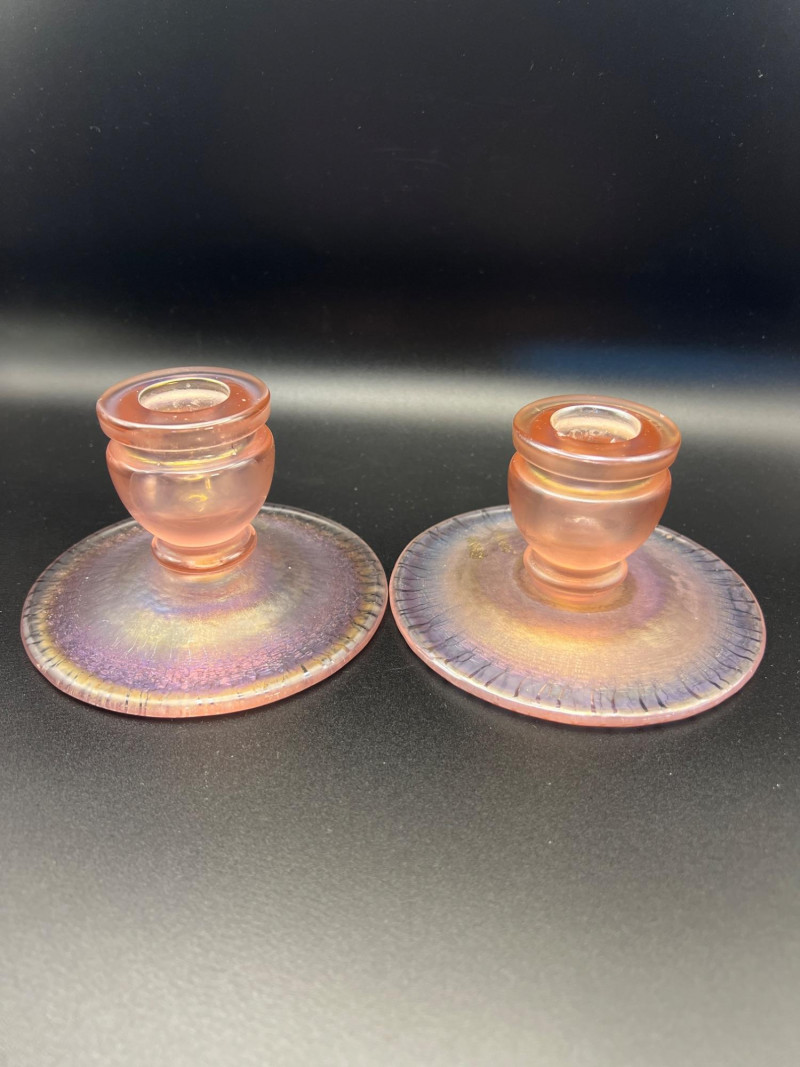 The Harvite pieces feature a classic mid‑century black finish with silver decoration around the rim. The Fenton holders display the signature iridescent sheen of Velva Rose stretch glass, with soft pink tones and a wide, flared form. A striking mixed lot combining mid‑century metalwork with collectible Fenton art glass.