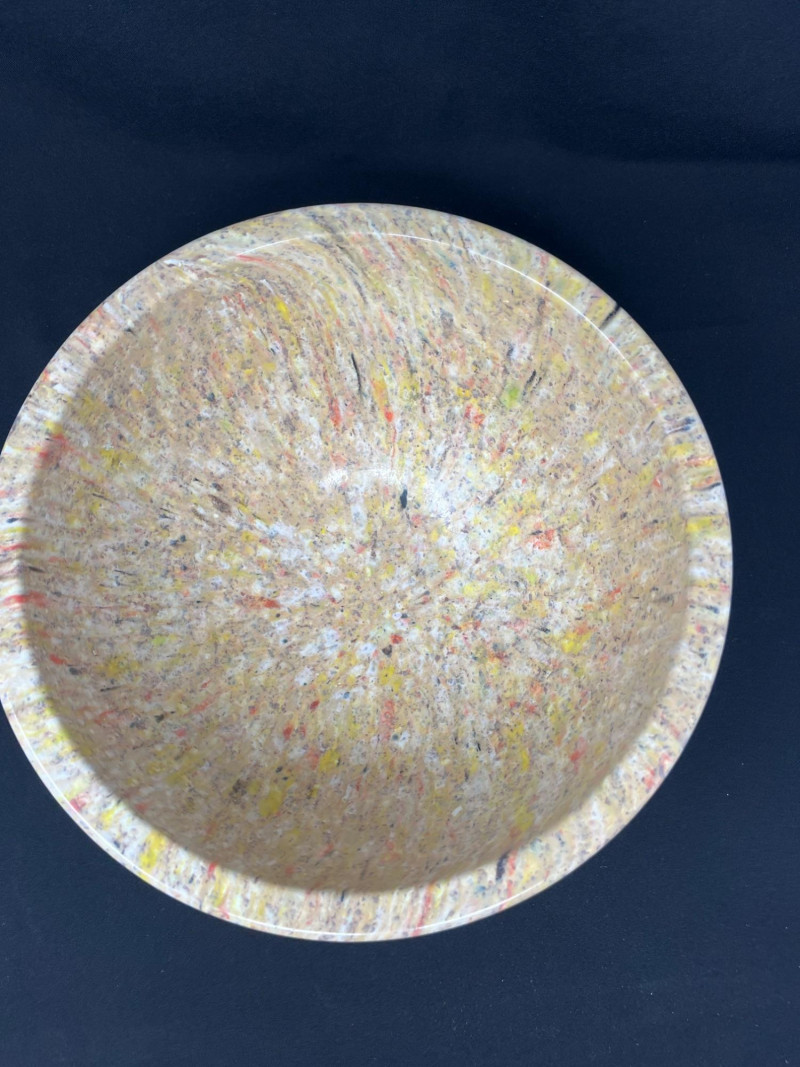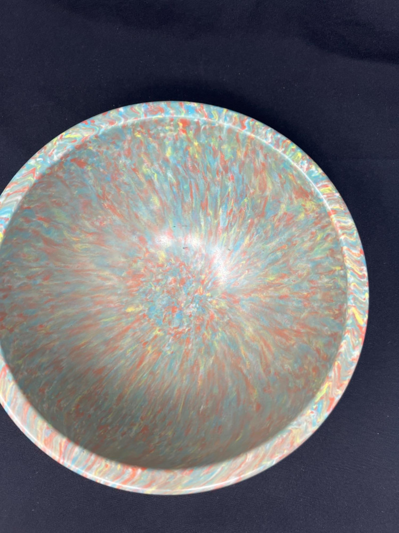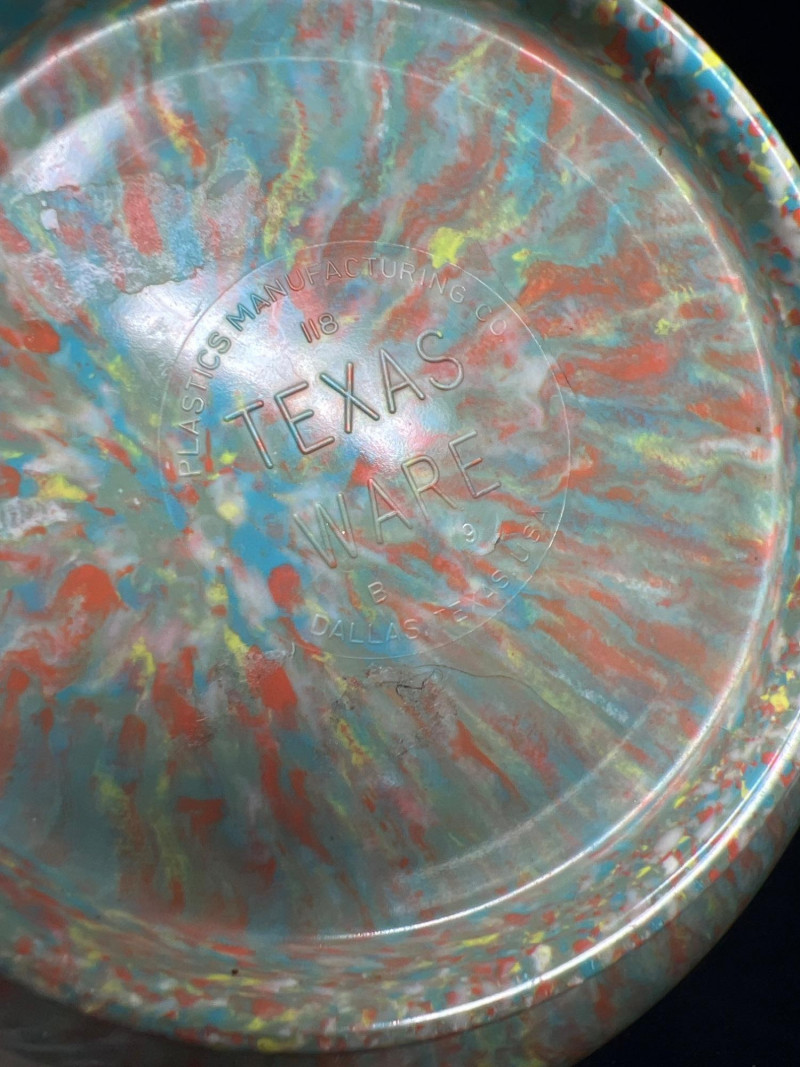 Each piece is crafted from durable melamine, showcasing the playful color blends and sculptural forms that define mid‑century American kitchenware. A lively, functional set for collectors and retro‑kitchen enthusiasts. Rare. Three Texas Ware Bowls - one medium (10” round x 4.5” height) and (2) 11.5” round x 5.25” height bowls.