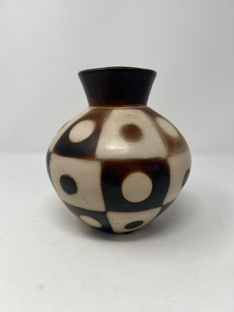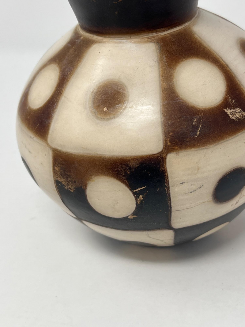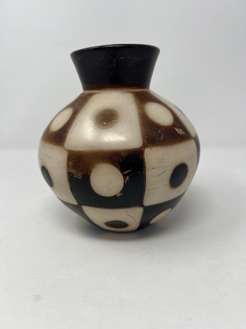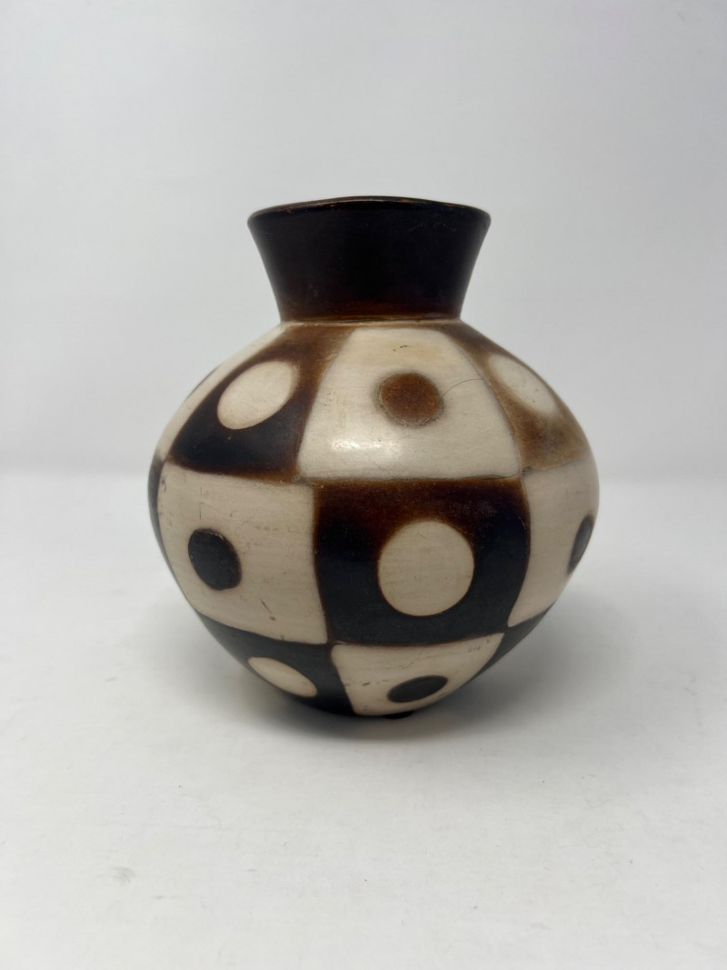 Handcrafted Chulucanas pottery vase by noted Peruvian ceramic artist Valerian Paz, signed and dated 6‑21‑20 on the base. The piece features the region’s signature smooth, burnished finish and a striking geometric checkerboard pattern with contrasting circular dot motifs. The bulbous body and tapered neck reflect traditional Chulucanas forms, while the bold black‑and‑white palette with warm brown undertones showcases Paz’s contemporary interpretation of this celebrated ceramic tradition. Felt pads applied to the base for surface protection. Light, expected wear. A distinctive, collectible example of modern Peruvian ceramic artistry from one of the region’s recognized makers.
