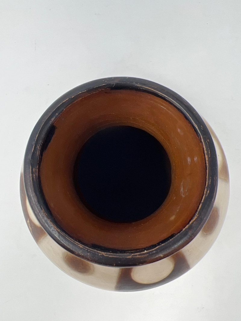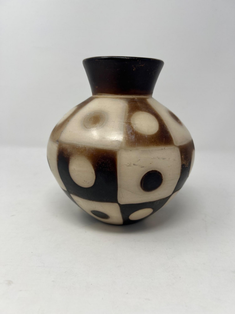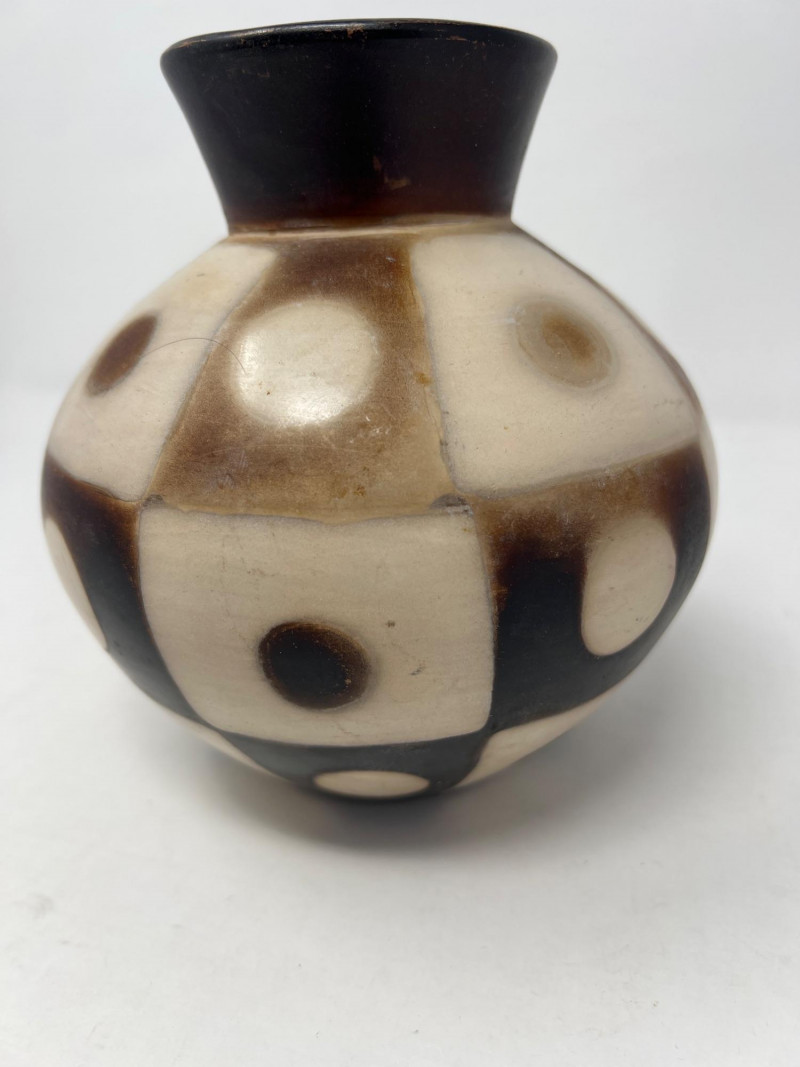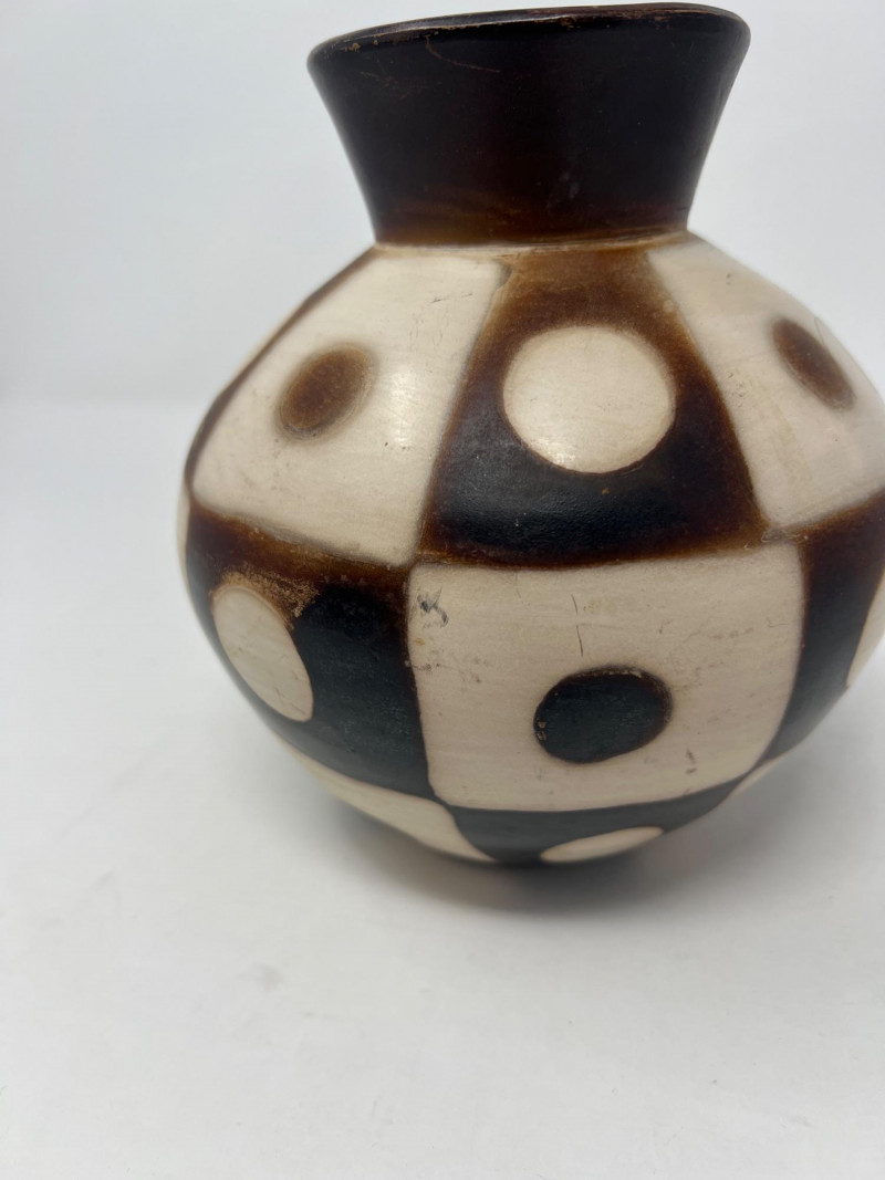 Handcrafted Chulucanas pottery vase by noted Peruvian ceramic artist Valerian Paz, signed and dated 6‑21‑20 on the base. The piece features the region’s signature smooth, burnished finish and a striking geometric checkerboard pattern with contrasting circular dot motifs. The bulbous body and tapered neck reflect traditional Chulucanas forms, while the bold black‑and‑white palette with warm brown undertones showcases Paz’s contemporary interpretation of this celebrated ceramic tradition. Felt pads applied to the base for surface protection. Light, expected wear. A distinctive, collectible example of modern Peruvian ceramic artistry from one of the region’s recognized makers.