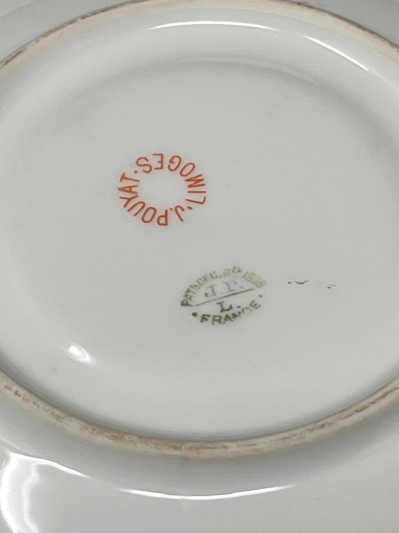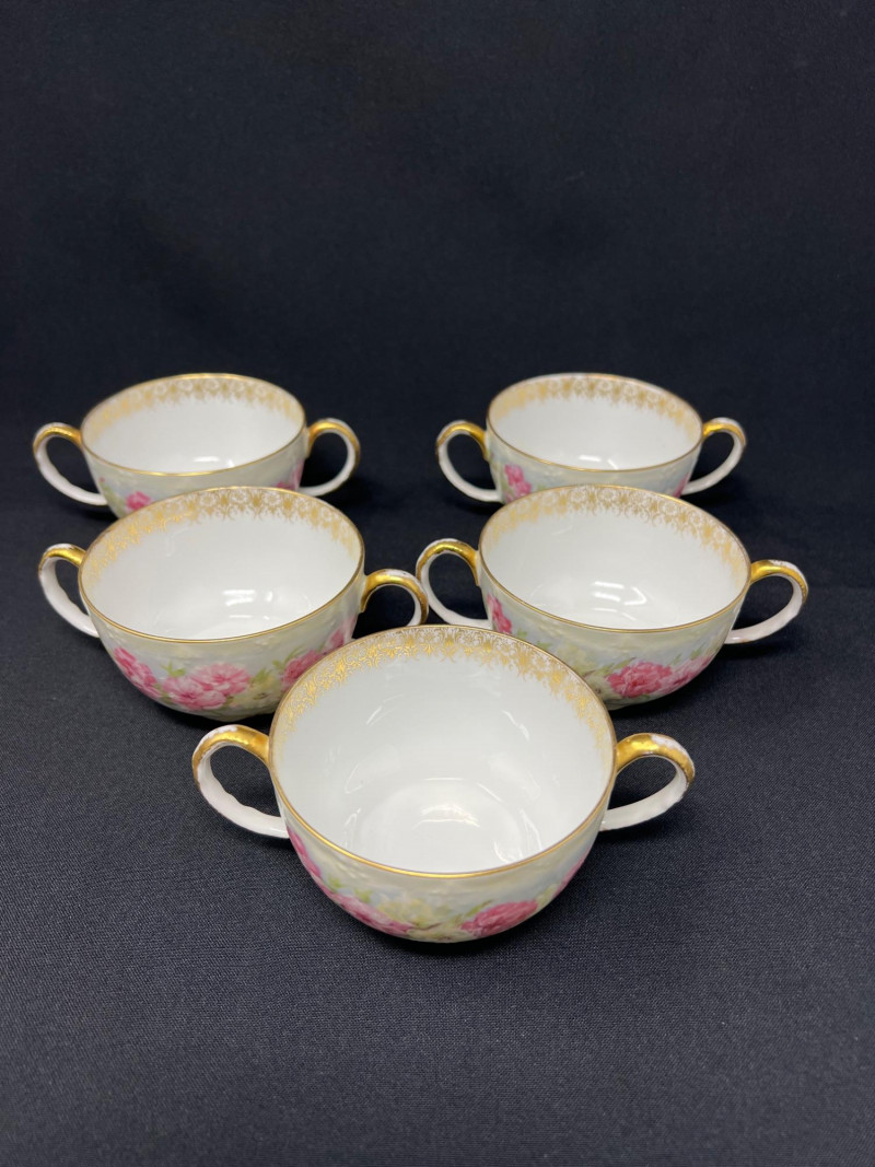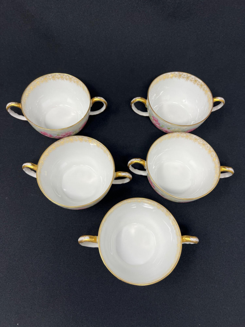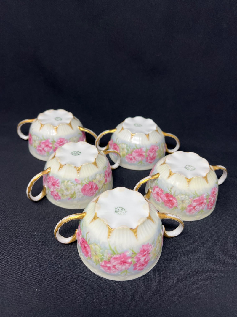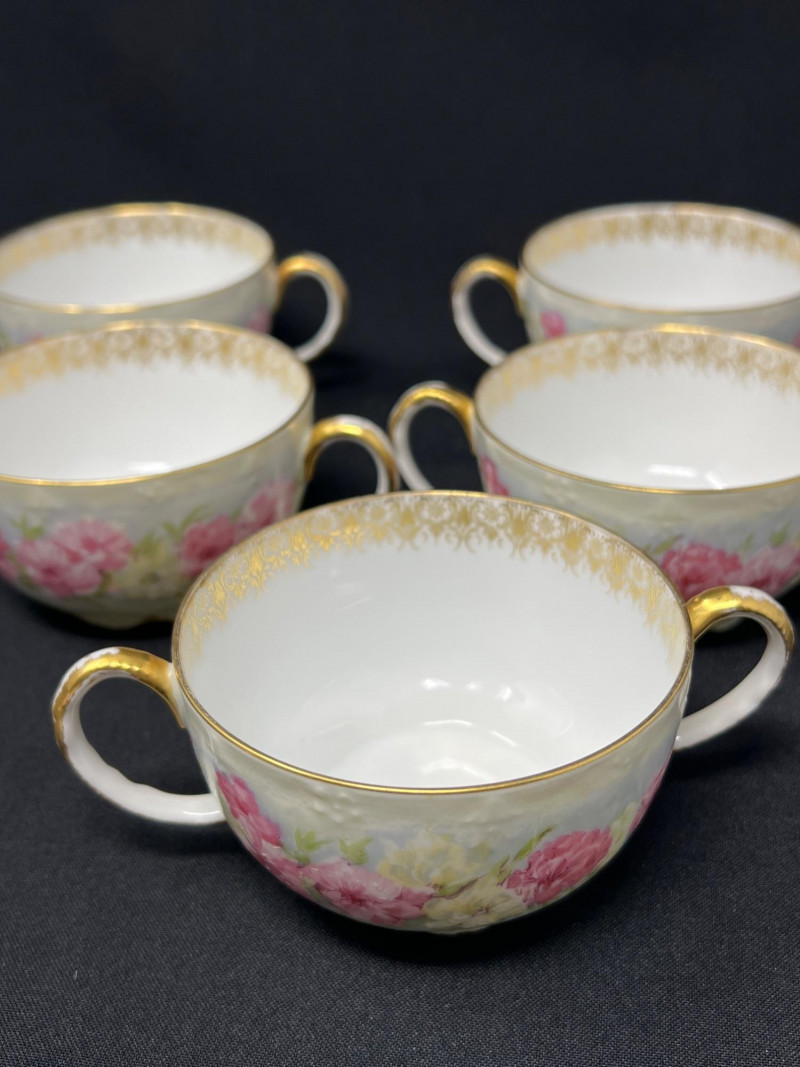 Elegant antique J. Pouyat Limoges bouillon set featuring five double‑handled lidded cups with matching saucers. Each piece displays classic Pouyat floral decoration with pink roses, green foliage, and gold trim, including gold finials and handle accents. The porcelain is finely potted with the refined detailing characteristic of early 20th‑century Limoges production. A beautifully preserved and cohesive set, ideal for display or formal service. Saucer - 5.75” round Lidded cup - 3” tall x 5” wide x 4” wide