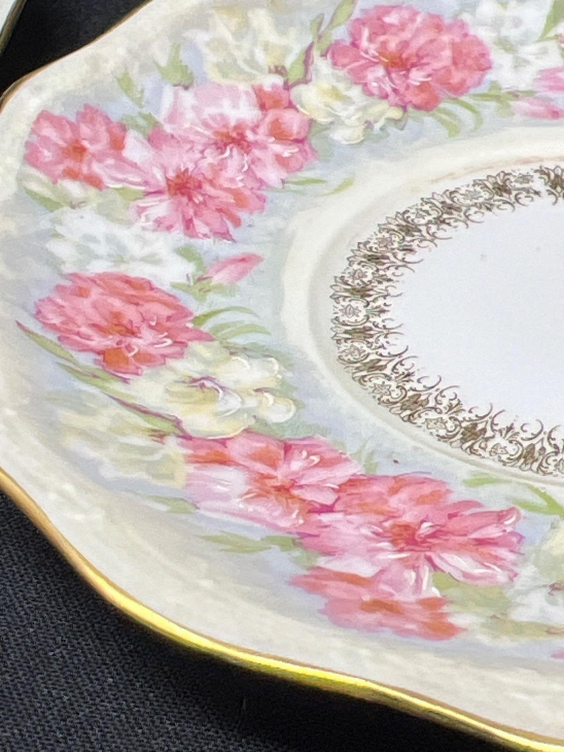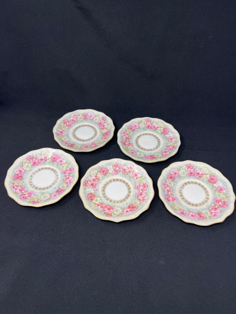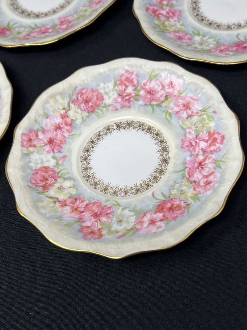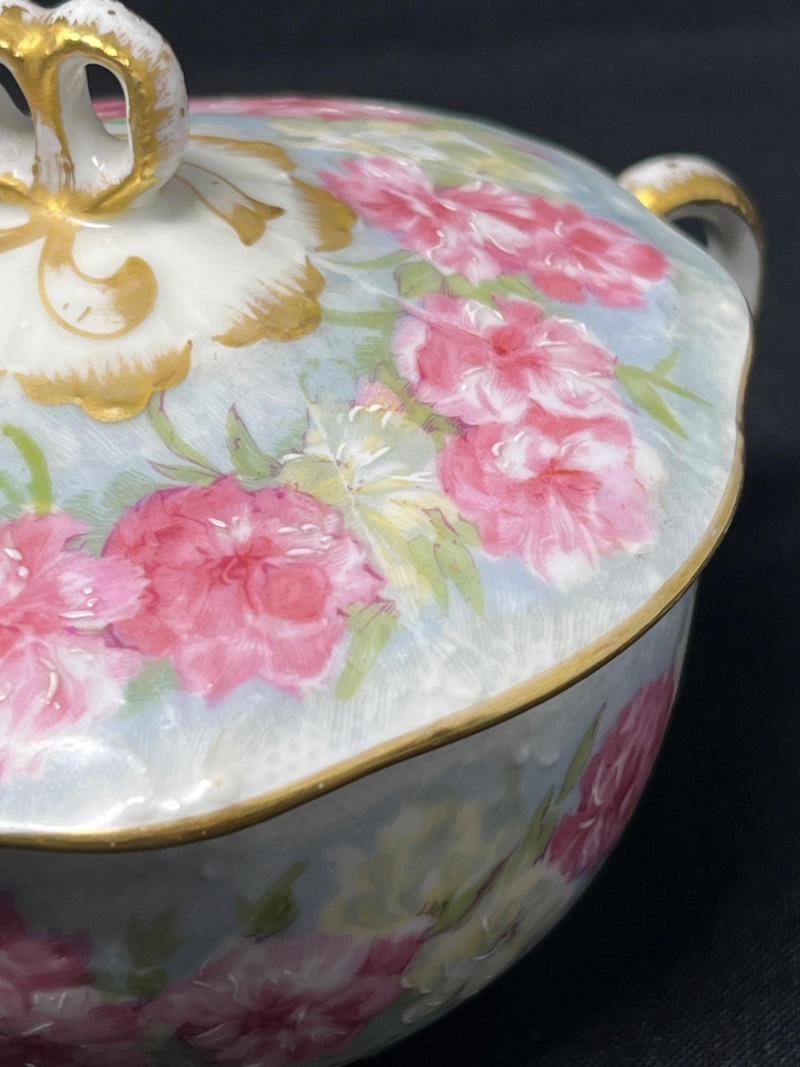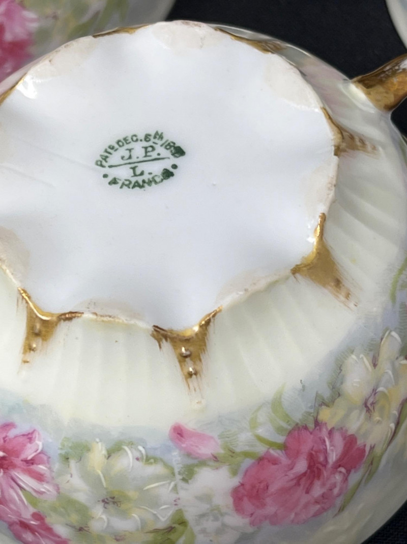 Elegant antique J. Pouyat Limoges bouillon set featuring five double‑handled lidded cups with matching saucers. Each piece displays classic Pouyat floral decoration with pink roses, green foliage, and gold trim, including gold finials and handle accents. The porcelain is finely potted with the refined detailing characteristic of early 20th‑century Limoges production. A beautifully preserved and cohesive set, ideal for display or formal service. Saucer - 5.75” round Lidded cup - 3” tall x 5” wide x 4” wide
