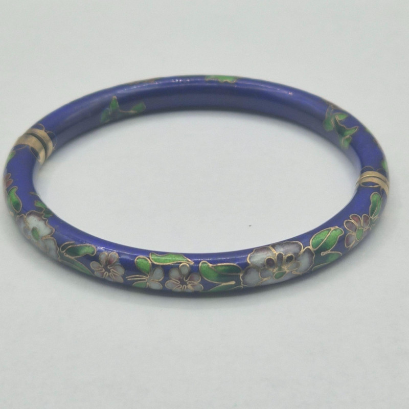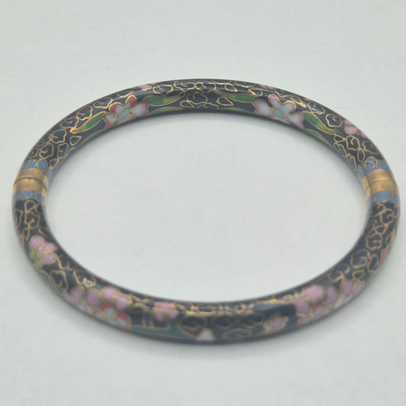 A vibrant, unified collection of cloisonné bangles showcasing classic floral enamel artistry across both hinged and continuous forms. The lot includes eight average‑wrist bracelets—three hinged and five continuous with a 2.5" interior diameter—each decorated in richly colored floral patterns. A coordinating child‑size hinged bangle completes the group with the same traditional cloisonné charm. The enamel surfaces show light age wear with no chipping, maintaining their bright, glossy finish and collectible appeal.
