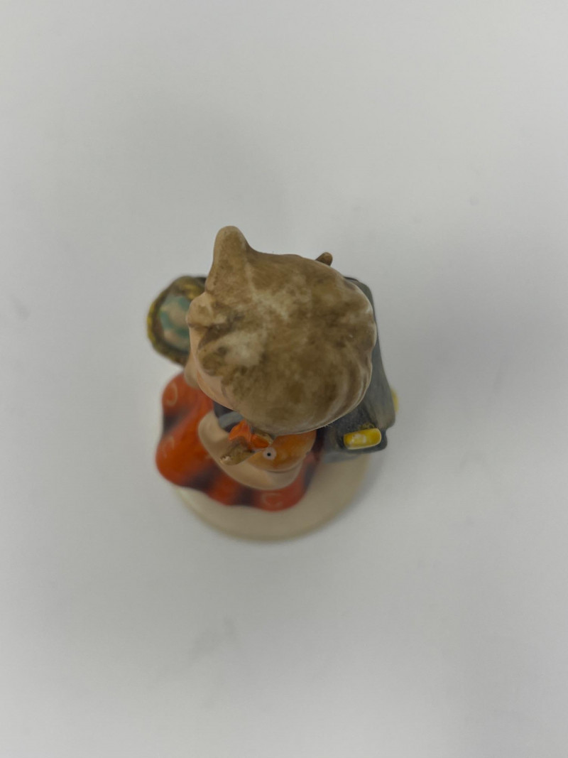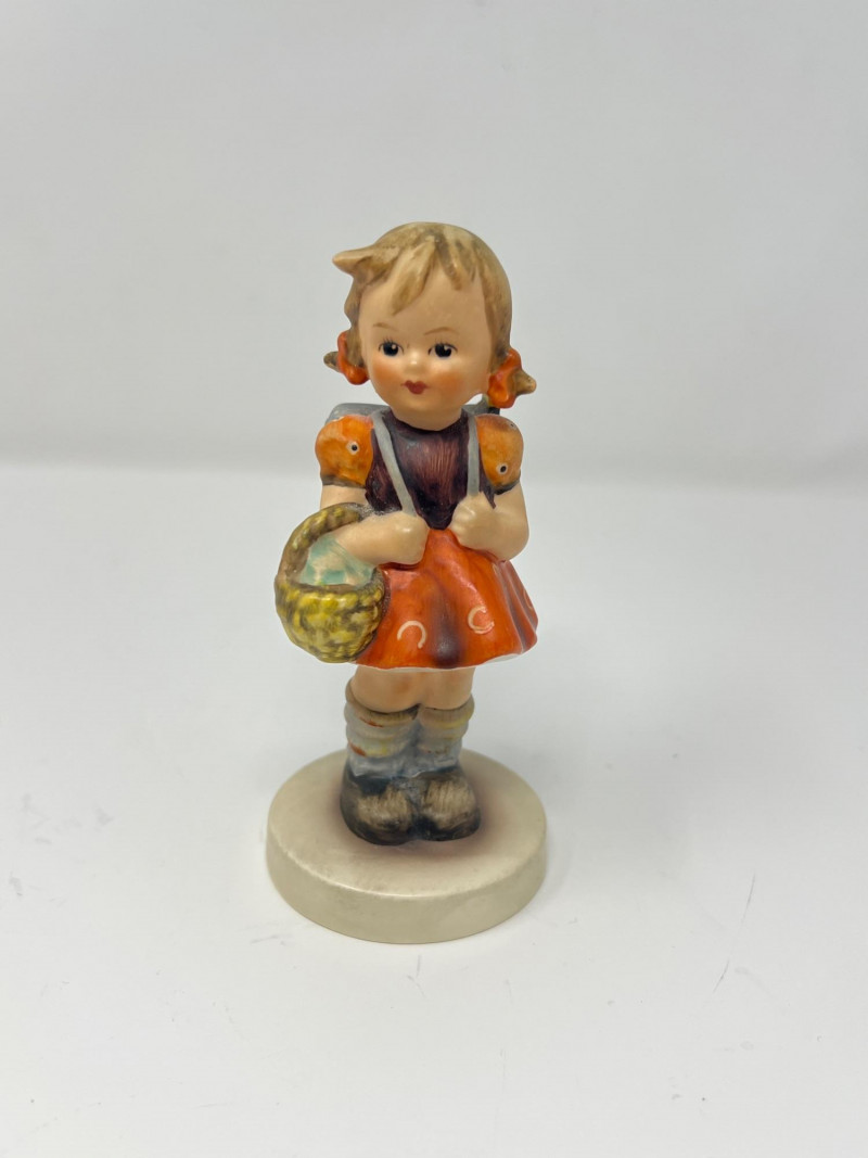 Pair of vintage Goebel M.I. Hummel figurines, both marked with the Goebel Bee trademark: “Cinderella” – child in a red kerchief holding two birds, with a third at her feet. “Girl with Basket” (also known as Girl with Flower Basket) – child in an orange dress carrying a basket and wearing a small backpack. Both pieces feature classic Hummel styling, soft hand‑painted colors, and expressive detail. A charming duo for collectors of early Bee‑mark Hummel figurines.