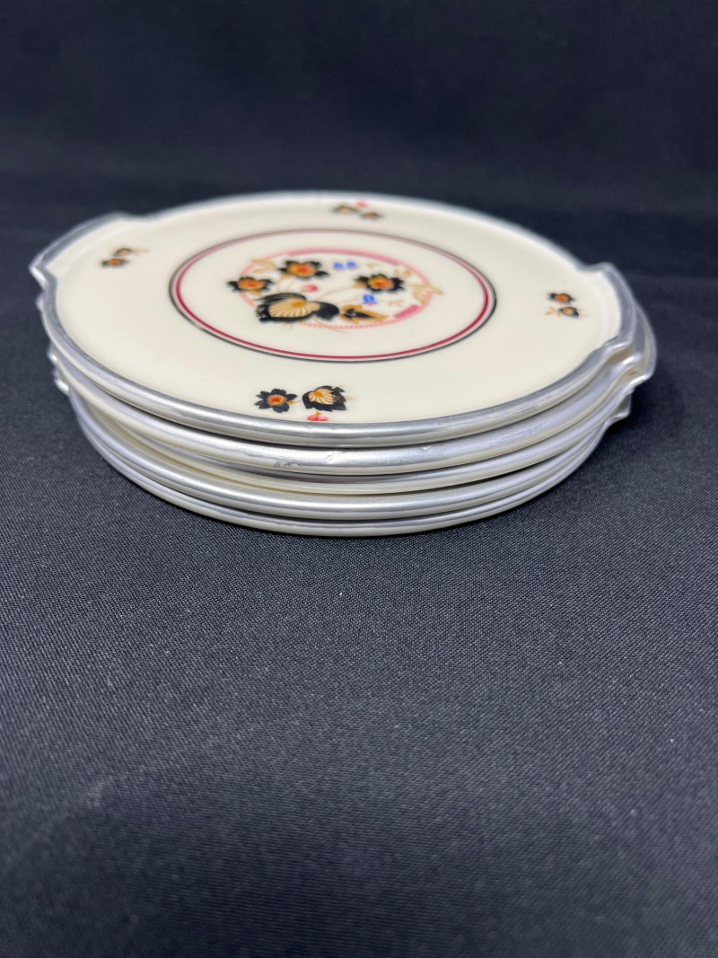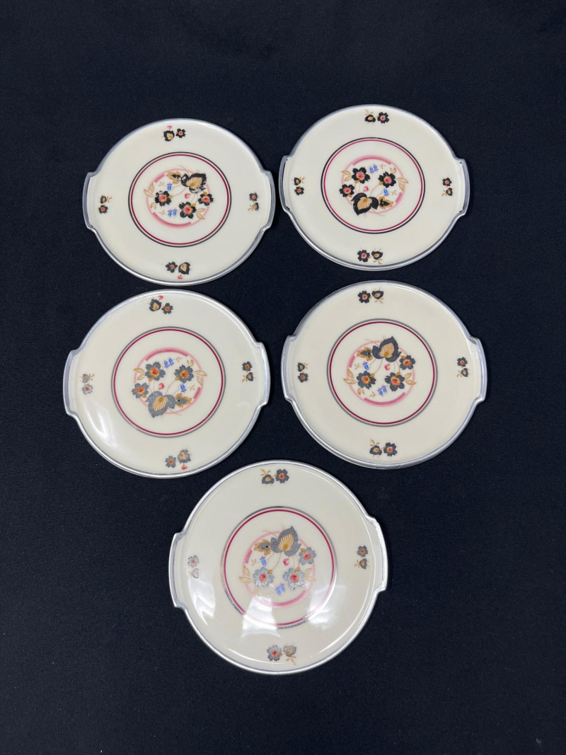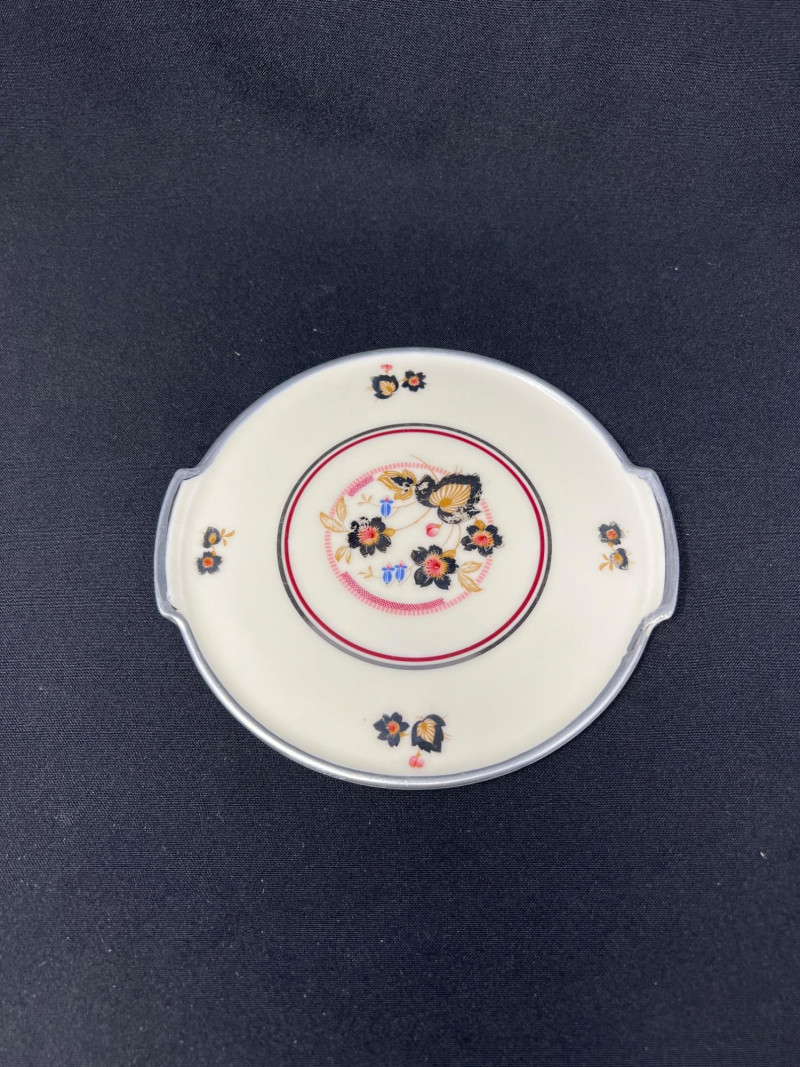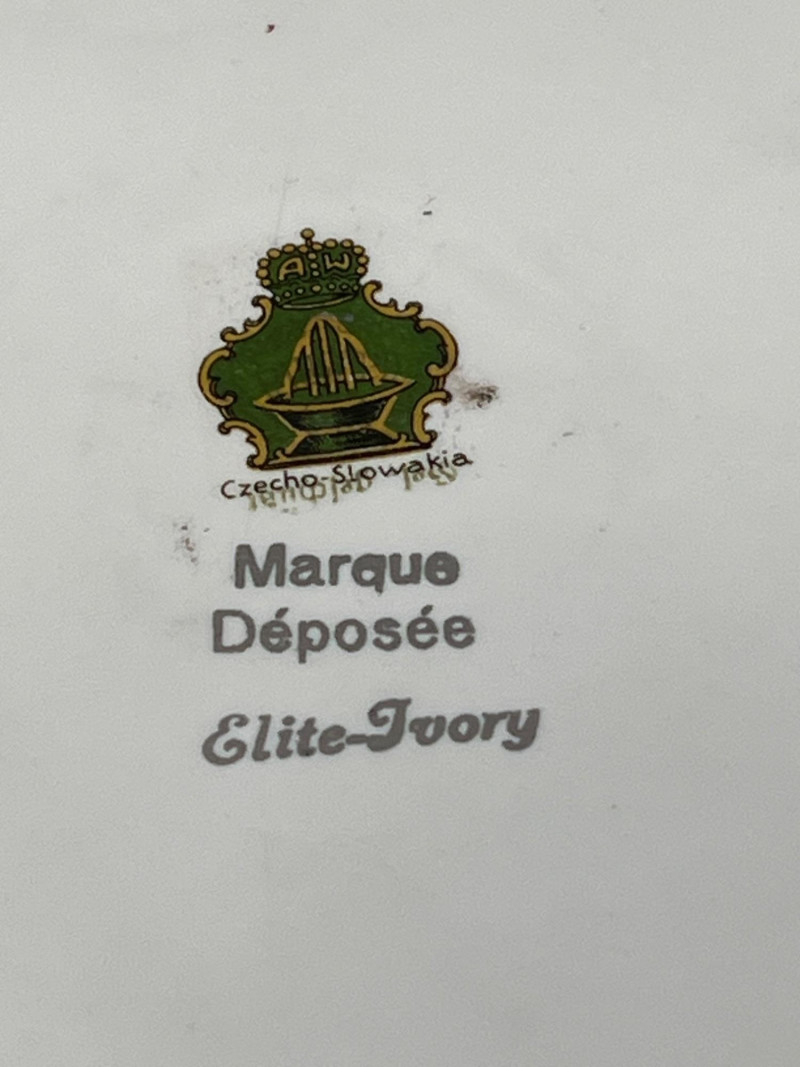 Set of five early 20th‑century Elite‑Ivory porcelain plates, marked A.W. Czecho‑Slovakia. Each plate features hand‑painted floral motifs in vibrant reds, blues, yellows, and greens, framed by a red accent border and finished with small side handles. Produced between 1918 and 1939, this set reflects the delicate craftsmanship and decorative style characteristic of Central European porcelain from the interwar period. A charming and collectible grouping for display or vintage table settings.