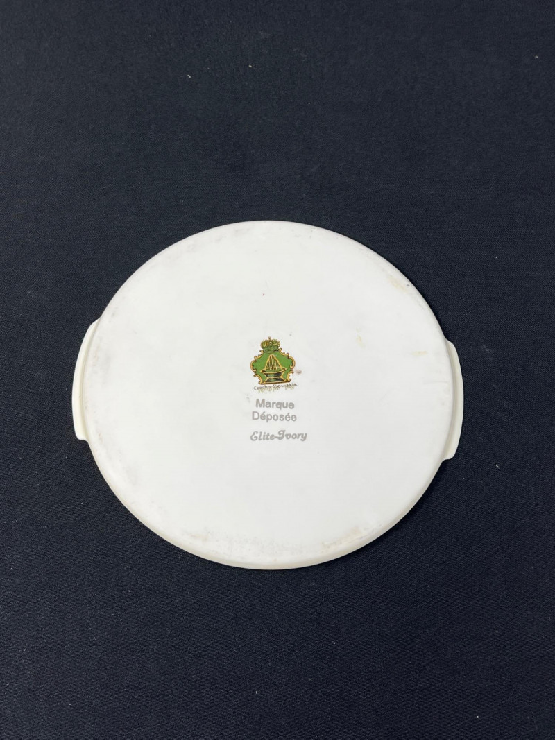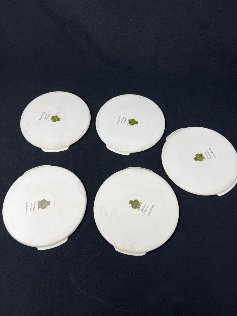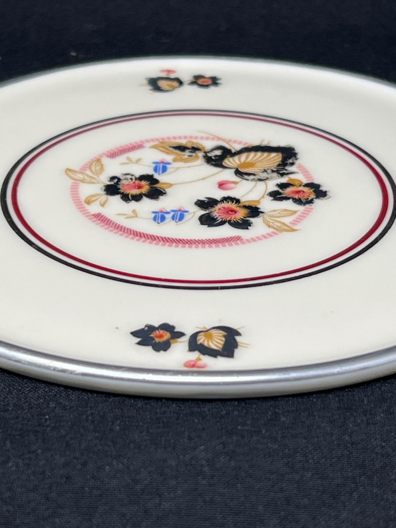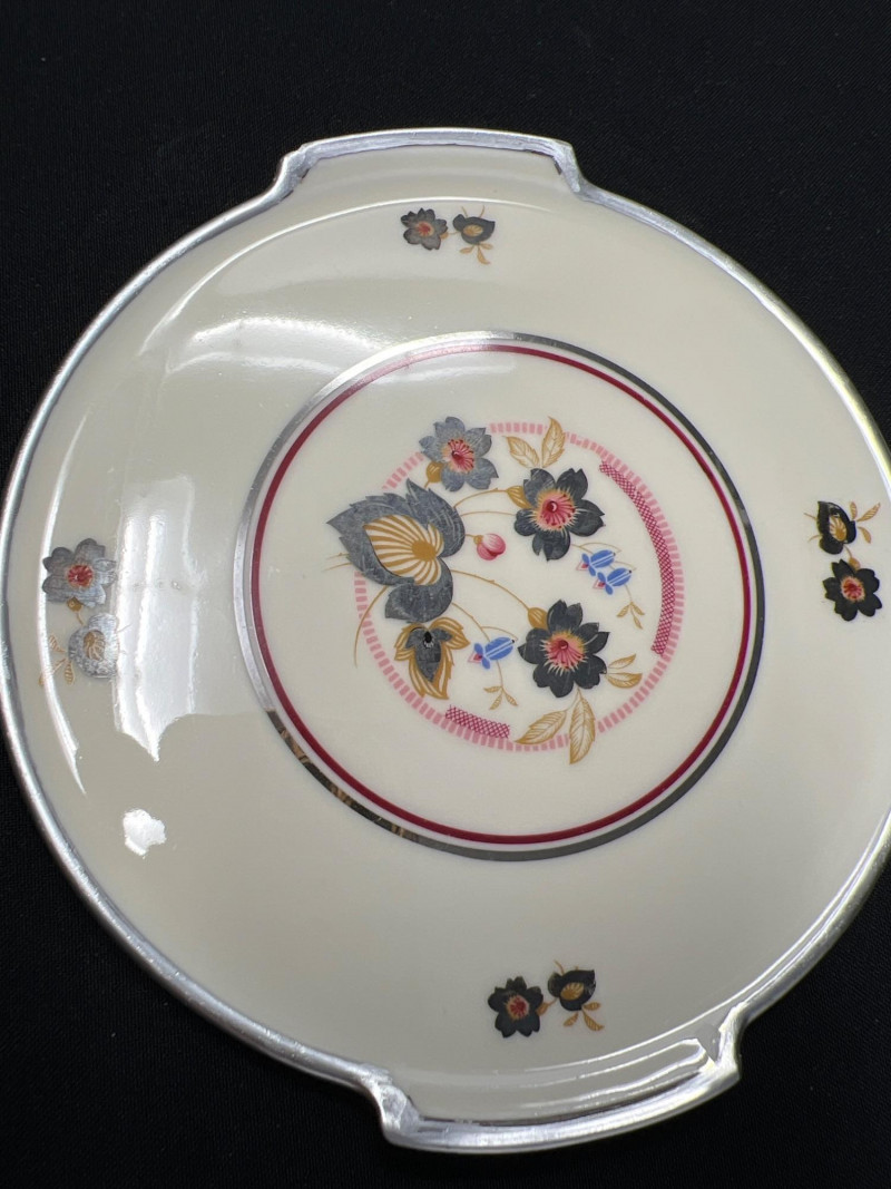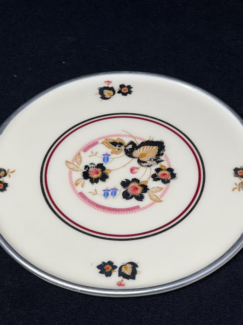Set of five early 20th‑century Elite‑Ivory porcelain plates, marked A.W. Czecho‑Slovakia. Each plate features hand‑painted floral motifs in vibrant reds, blues, yellows, and greens, framed by a red accent border and finished with small side handles. Produced between 1918 and 1939, this set reflects the delicate craftsmanship and decorative style characteristic of Central European porcelain from the interwar period. A charming and collectible grouping for display or vintage table settings.
