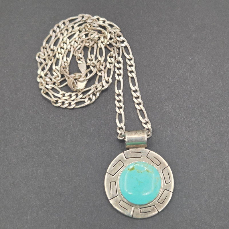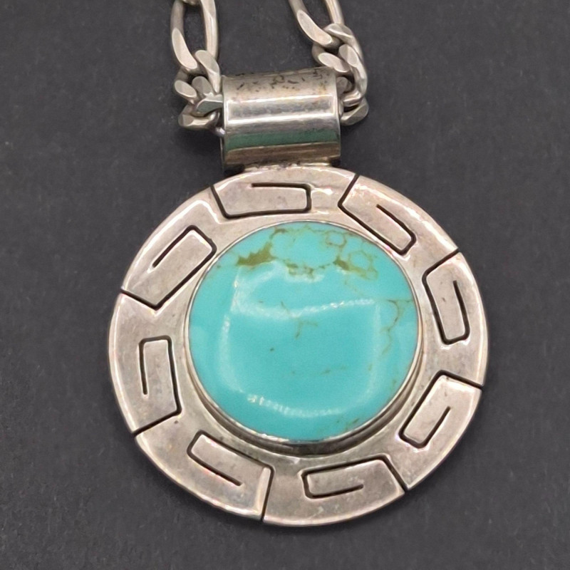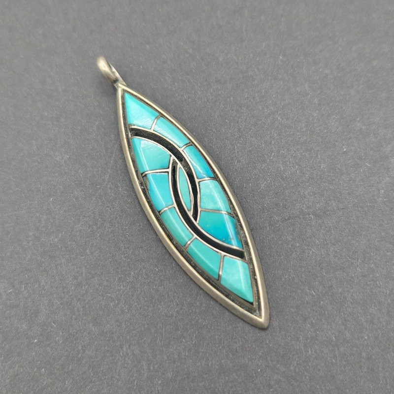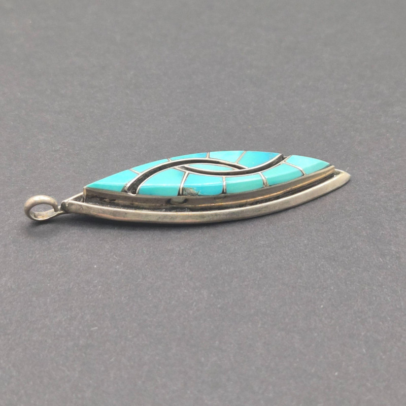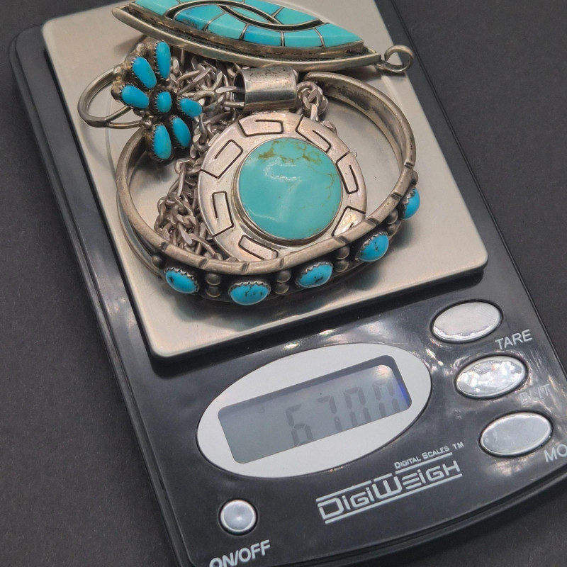 A character‑rich Southwestern and Zuni‑crafted assortment, this lot brings together five distinctive turquoise and sterling silver pieces with strong artisan presence and excellent visual variety. The mix includes a bold cuff, two pendants with contrasting styles, a substantial sterling chain, and a collectible Zuni ring—altogether weighing 67 grams of sterling and stone. The centerpiece of the lot is a five‑stone turquoise cuff bracelet, stamped PL Sterling, with classic hand‑set stones and traditional Navajo‑style construction. Complementing it is a striking turquoise and onyx inlay pendant, measuring 2.25 inches long, showcasing clean geometric lines and rich color contrast. A second pendant features a round turquoise stone suspended from a 23-inch sterling Cuban link chain, adding weight and presence to the grouping. Completing the ensemble is a Bill & Lou Zuni signed turquoise ring, size 5, known for their precise stonework and collectible appeal. The total combined weight of the lot is 67 grams, giving it both substance and value.