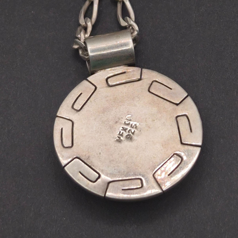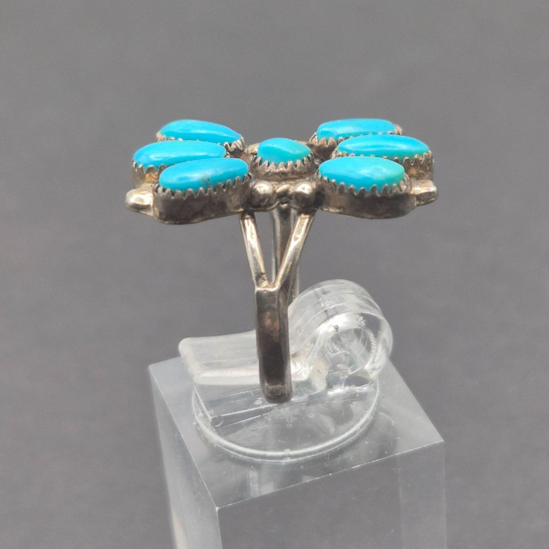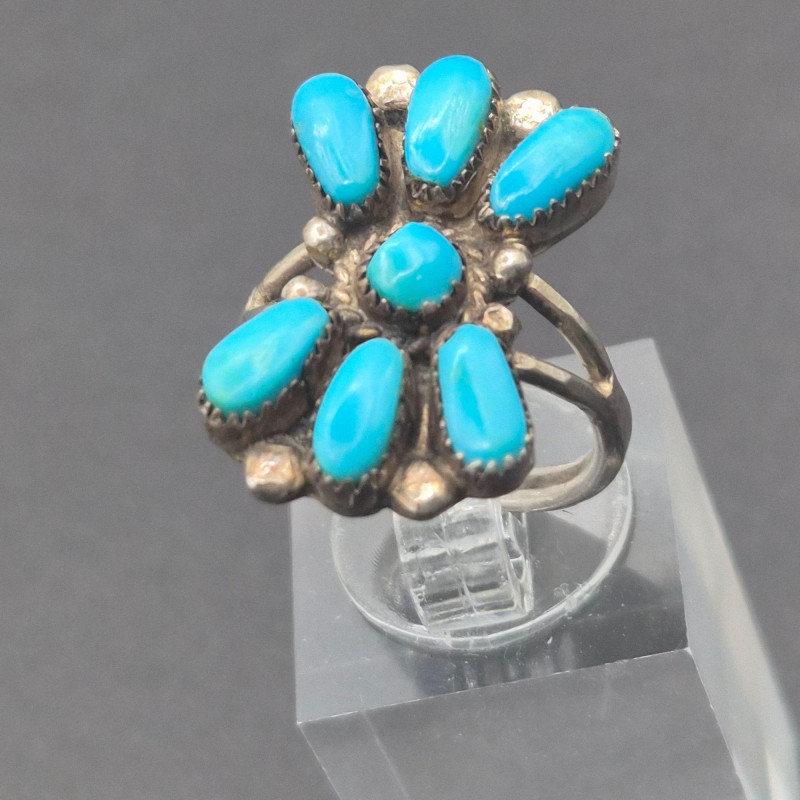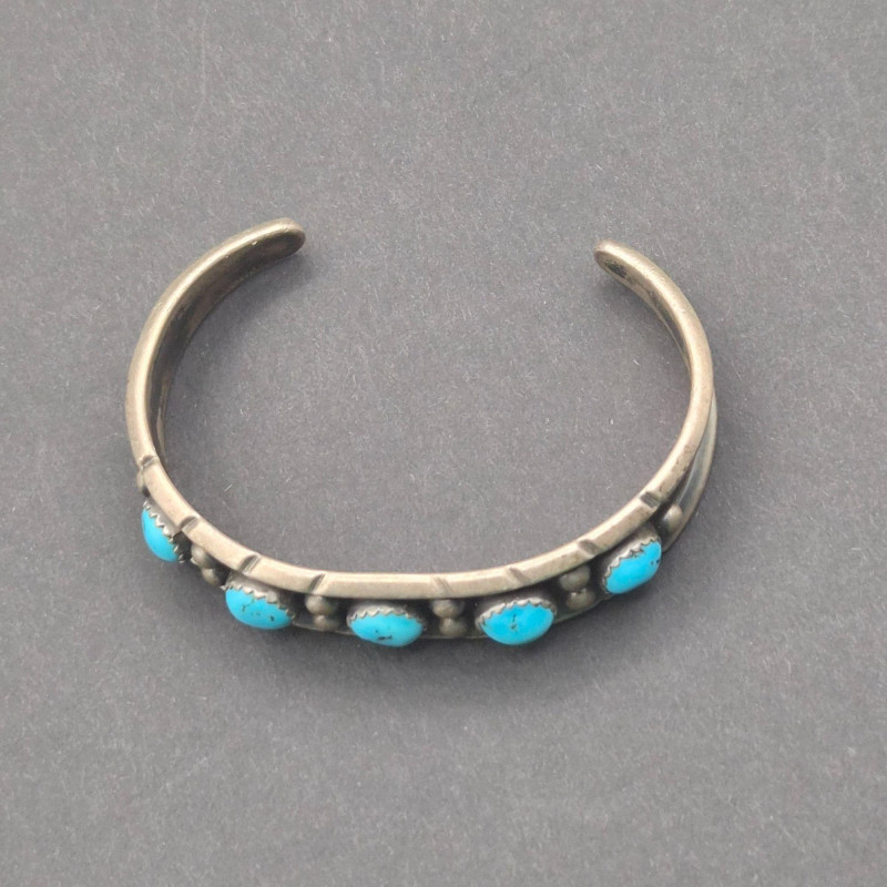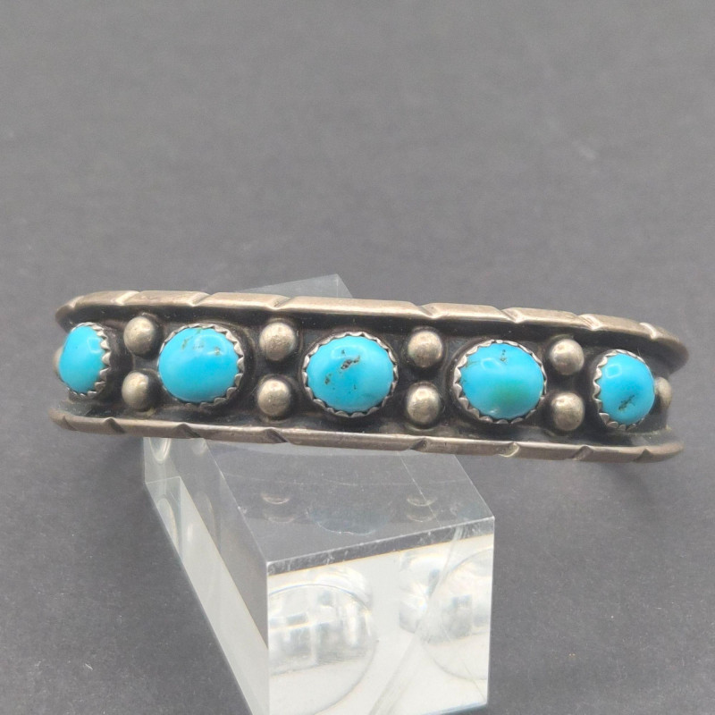 A character‑rich Southwestern and Zuni‑crafted assortment, this lot brings together five distinctive turquoise and sterling silver pieces with strong artisan presence and excellent visual variety. The mix includes a bold cuff, two pendants with contrasting styles, a substantial sterling chain, and a collectible Zuni ring—altogether weighing 67 grams of sterling and stone. The centerpiece of the lot is a five‑stone turquoise cuff bracelet, stamped PL Sterling, with classic hand‑set stones and traditional Navajo‑style construction. Complementing it is a striking turquoise and onyx inlay pendant, measuring 2.25 inches long, showcasing clean geometric lines and rich color contrast. A second pendant features a round turquoise stone suspended from a 23-inch sterling Cuban link chain, adding weight and presence to the grouping. Completing the ensemble is a Bill & Lou Zuni signed turquoise ring, size 5, known for their precise stonework and collectible appeal. The total combined weight of the lot is 67 grams, giving it both substance and value.