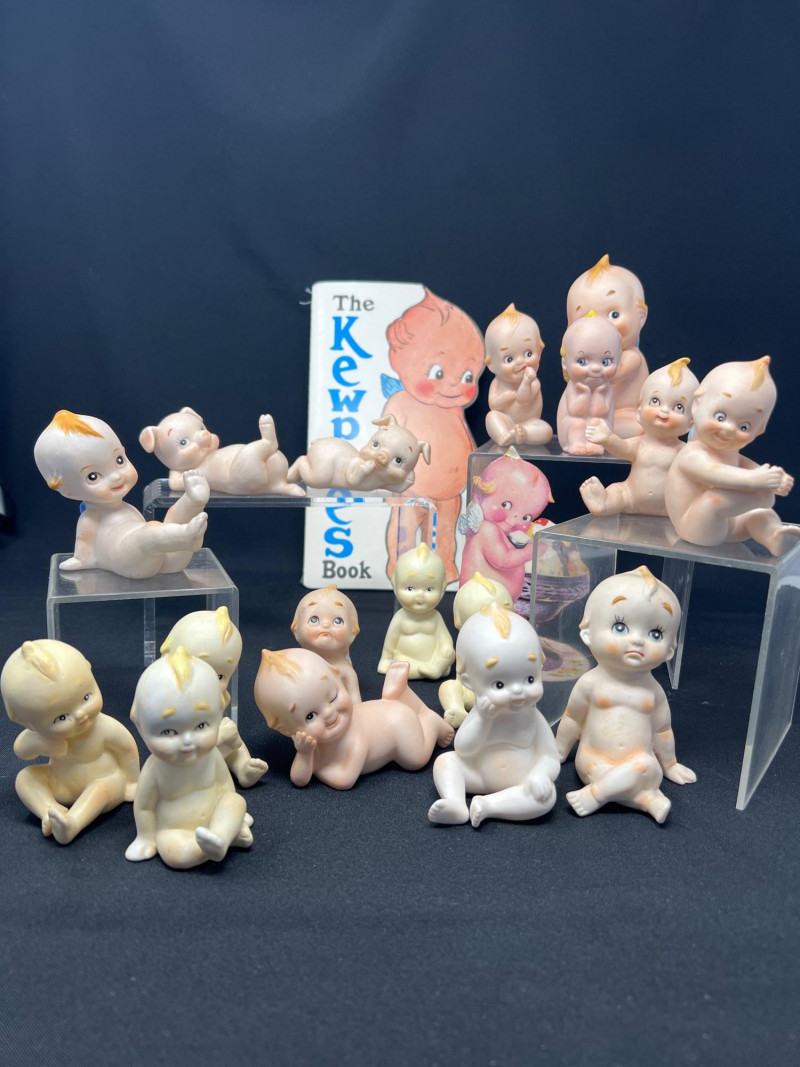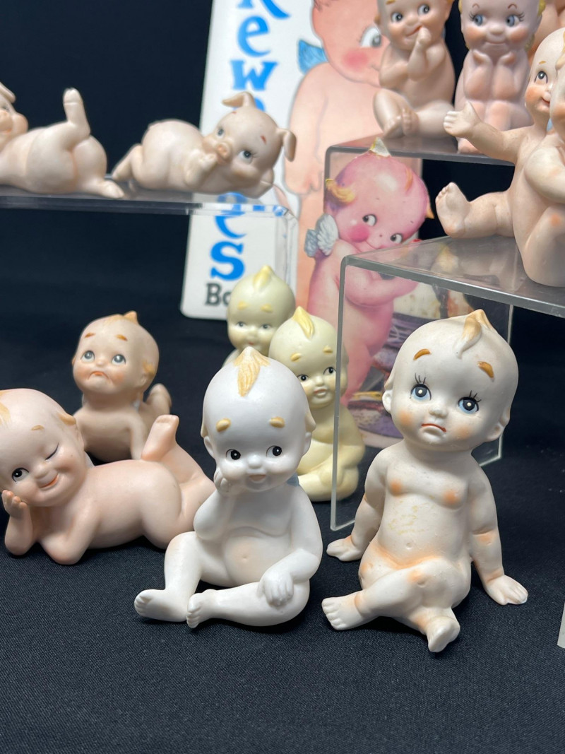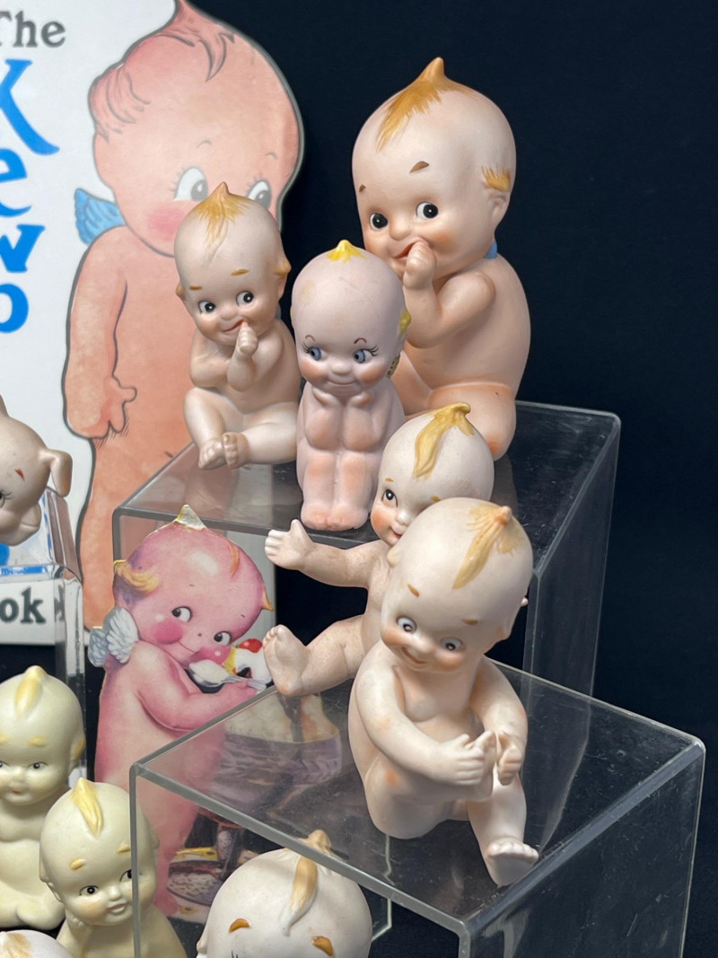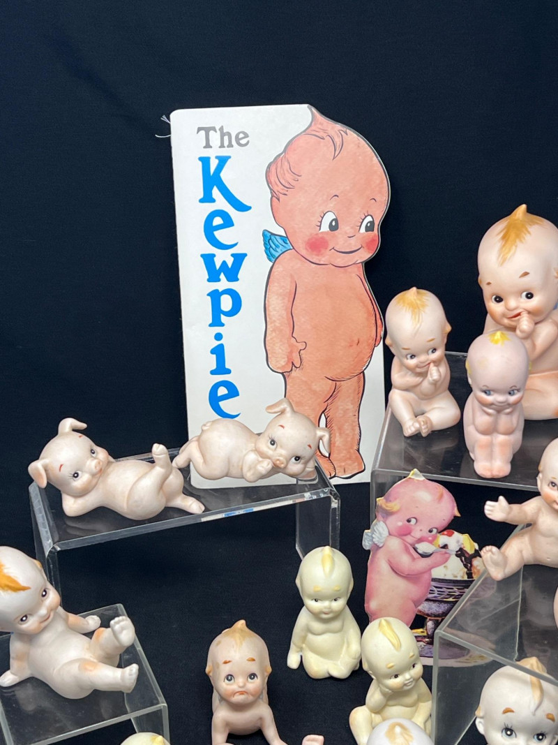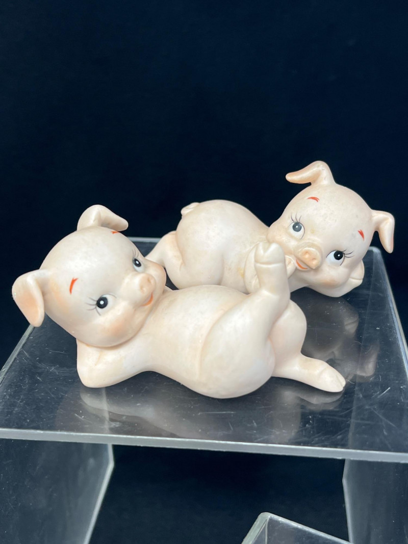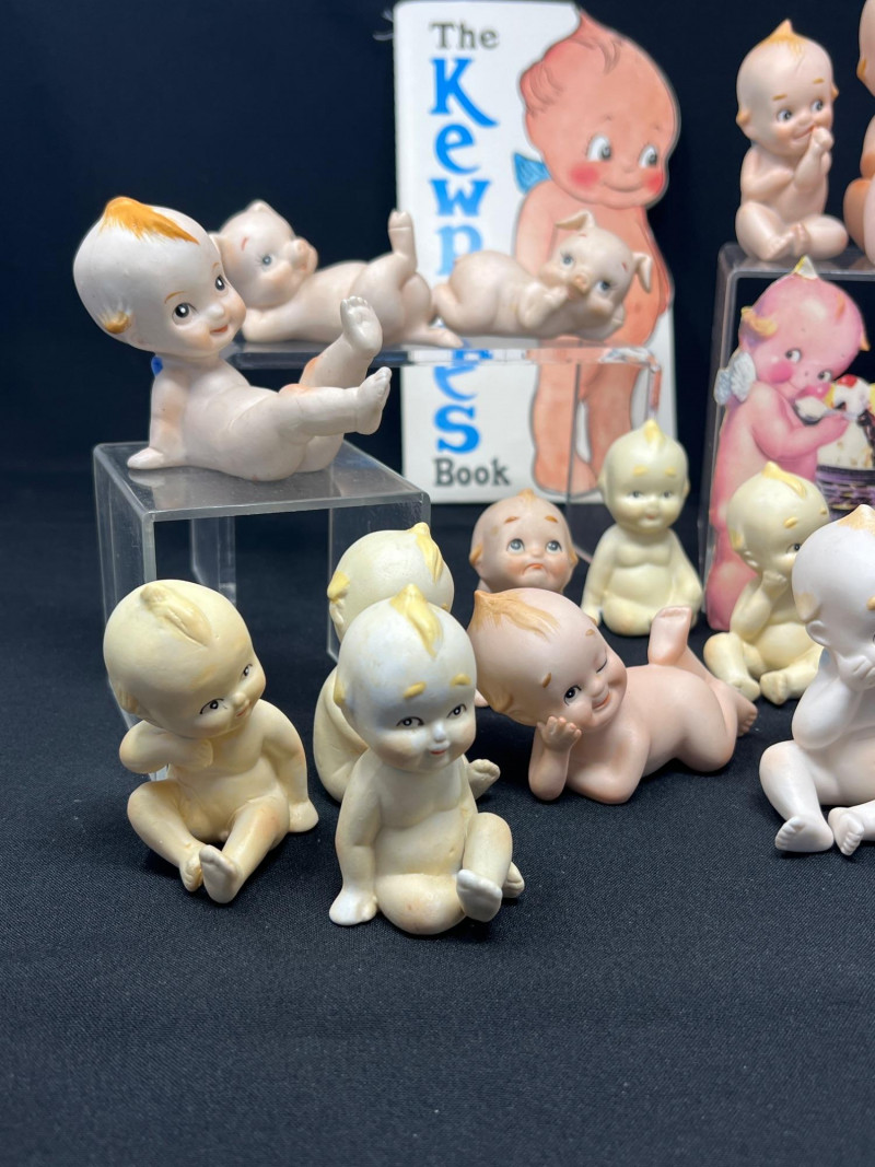 A sweet assortment of a pair of vintage Lefton pig figurines with a significant group of classic Kewpie dolls, each with the expressive faces and playful poses collectors love. The Lefton pigs feature the brand’s signature rosy cheeks and whimsical styling, while the Kewpies range from seated to reclining forms, accompanied by a vintage book and quality cardboard magnet for added display appeal. A charming mixed lot for fans of mid‑century ceramics and Rose O’Neill’s iconic Kewpie designs.