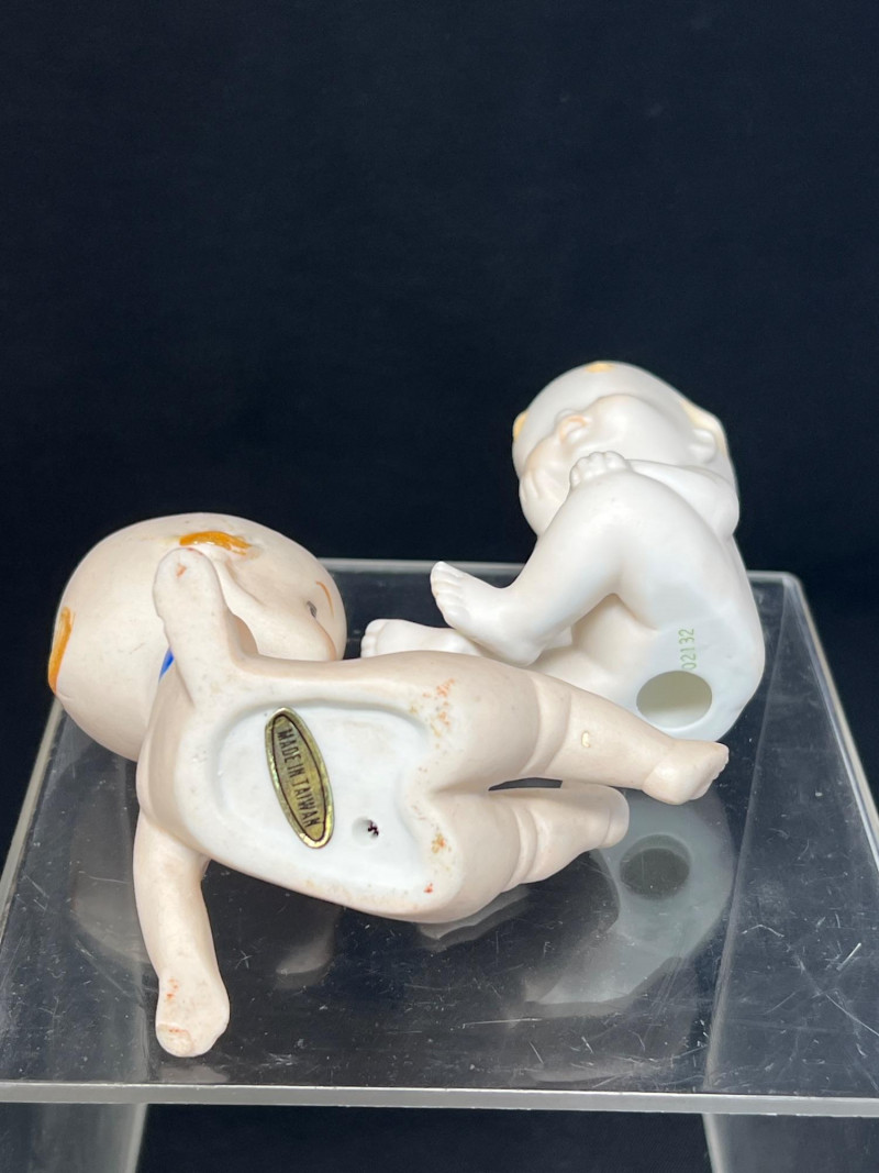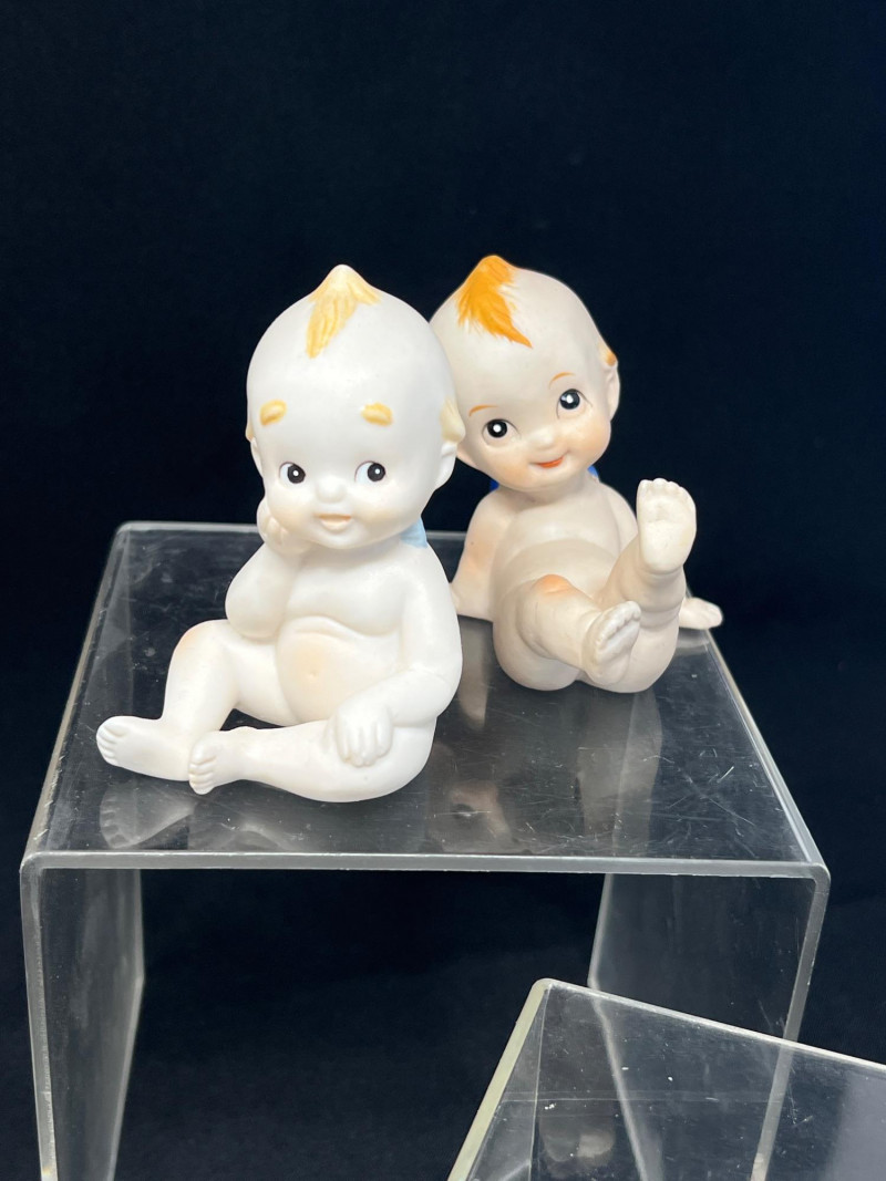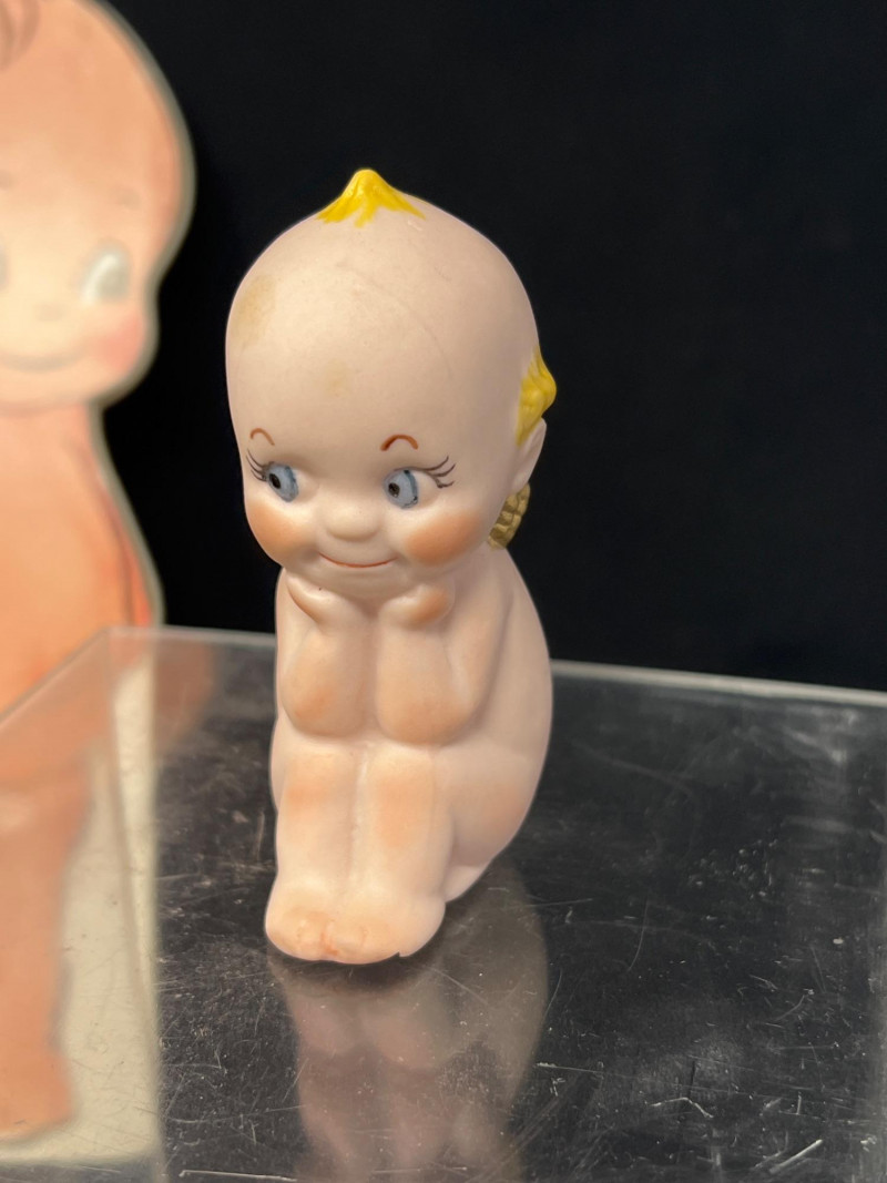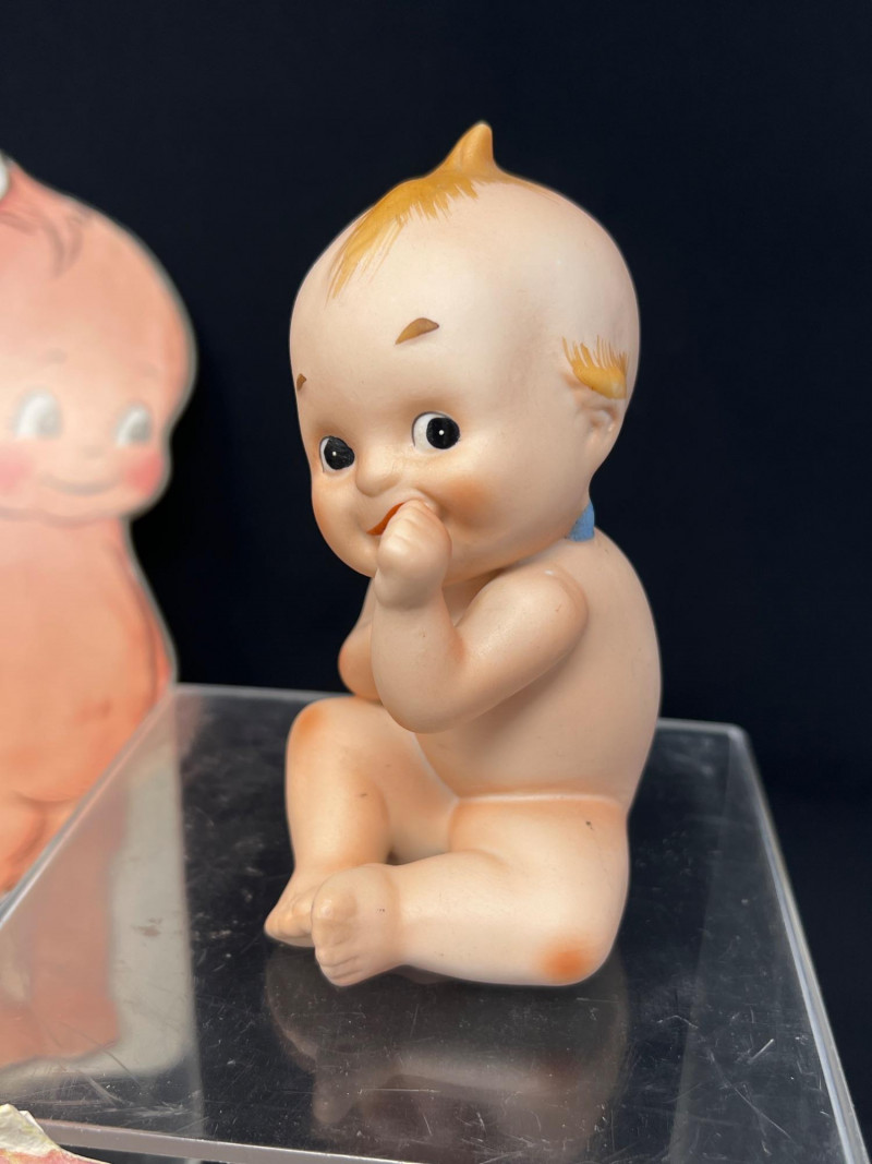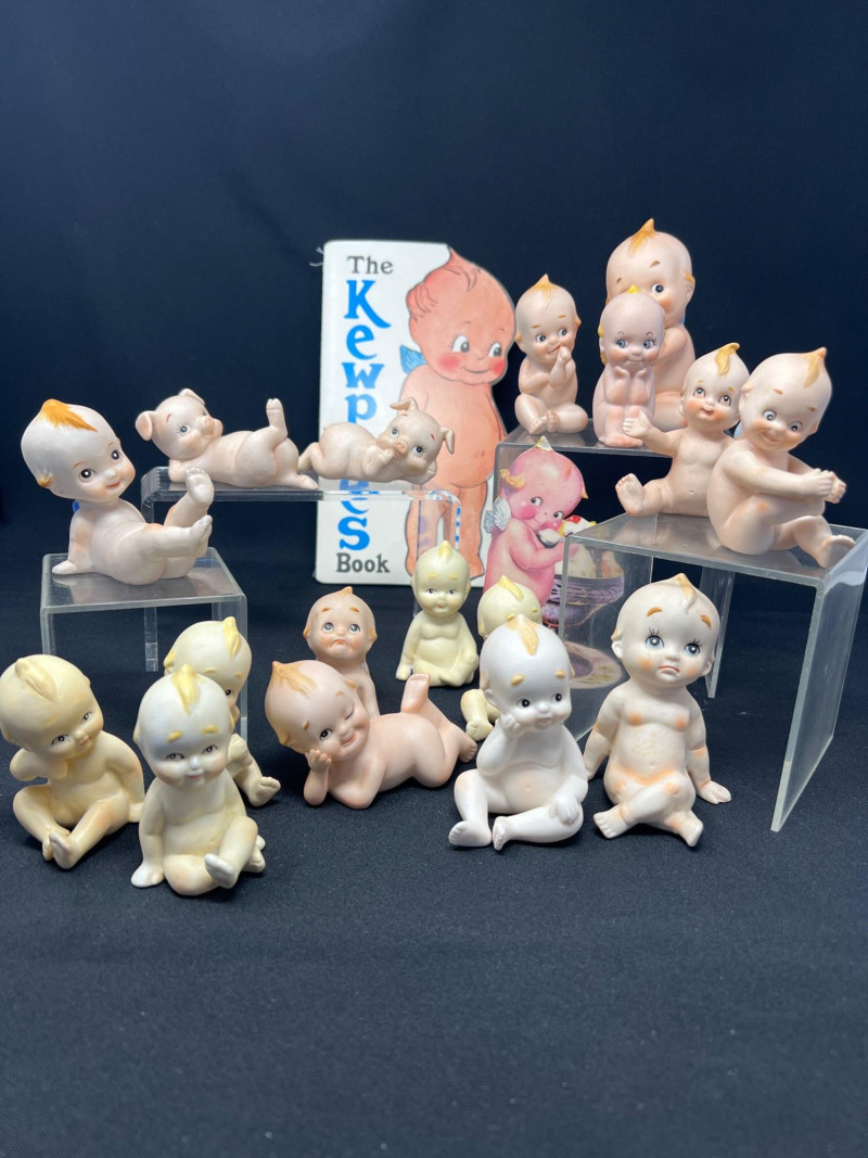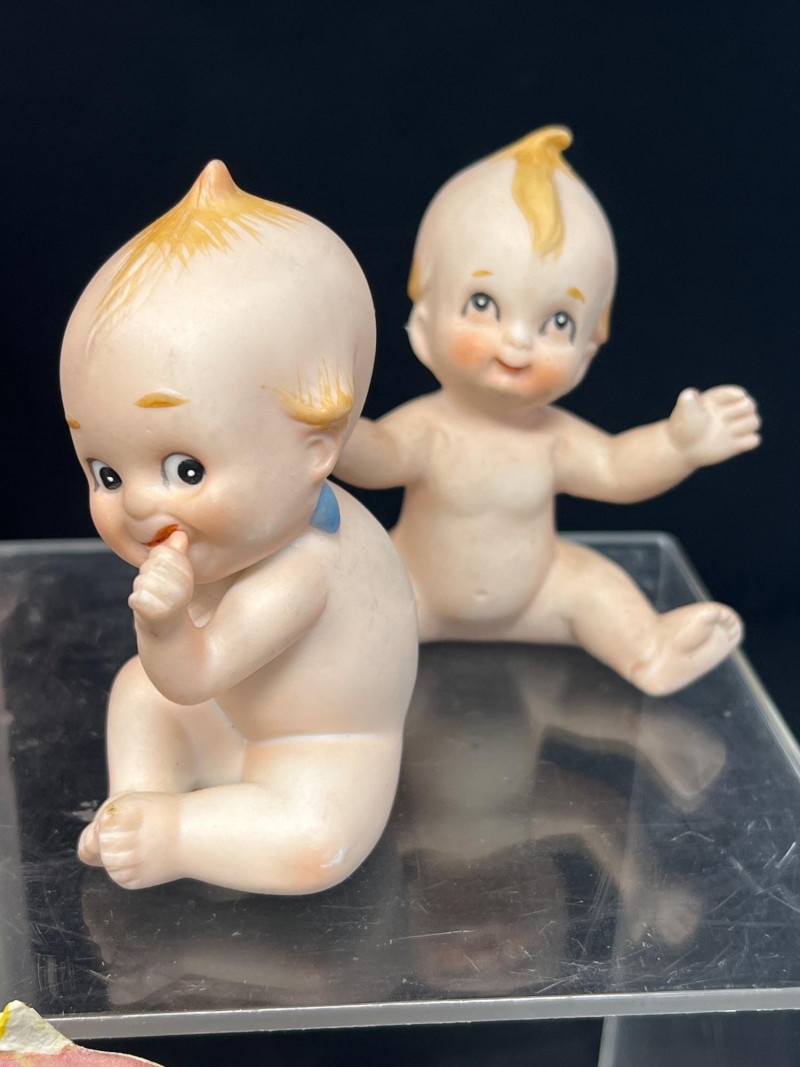A sweet assortment of a pair of vintage Lefton pig figurines with a significant group of classic Kewpie dolls, each with the expressive faces and playful poses collectors love. The Lefton pigs feature the brand’s signature rosy cheeks and whimsical styling, while the Kewpies range from seated to reclining forms, accompanied by a vintage book and quality cardboard magnet for added display appeal. A charming mixed lot for fans of mid‑century ceramics and Rose O’Neill’s iconic Kewpie designs.