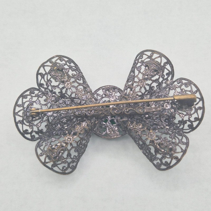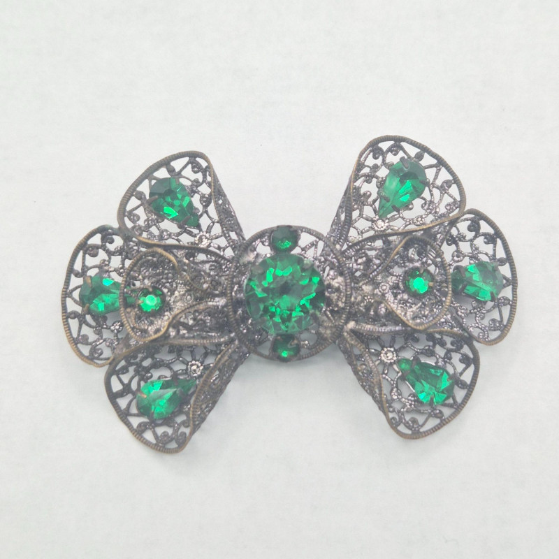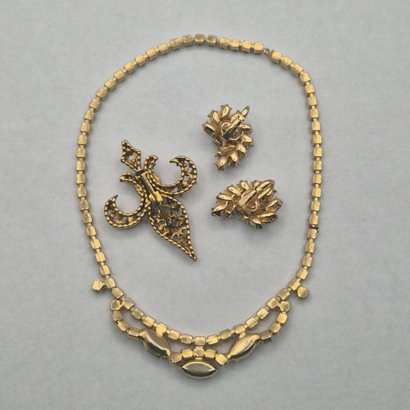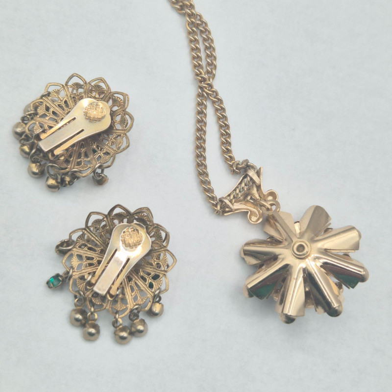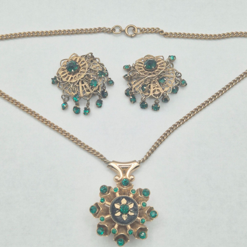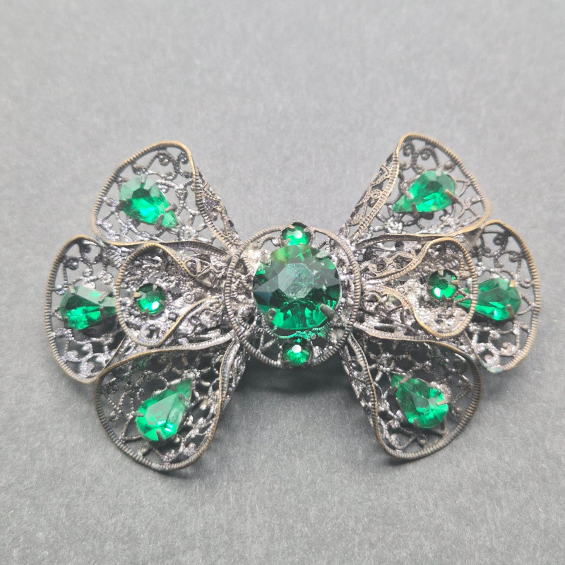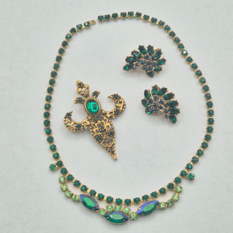 A vivid, mixed‑era collection built around rich green rhinestones, blending ornate Czech filigree work, mid‑century Trifari design, and charming unsigned pieces. The grouping includes a large Czechoslovakia filigree bow brooch measuring 3" x 1.75", an unsigned gold‑tone green leaf brooch with matching 1" clip earrings, and a 14-inch necklace paired with filigree dangle clip earrings that bring movement and sparkle. A 1950s rhinestone choker is included and will need a new connector clasp, while a fleur‑de‑lis brooch is missing one small stone. The Trifari green swirl and blue stone clip earrings are missing one small blue stone, a replacement that should be straightforward for a jewelry repairer. All other pieces retain their stones and present beautifully, with the expected gentle age wear typical of vintage rhinestone jewelry.
