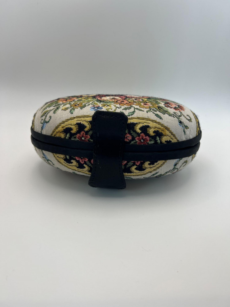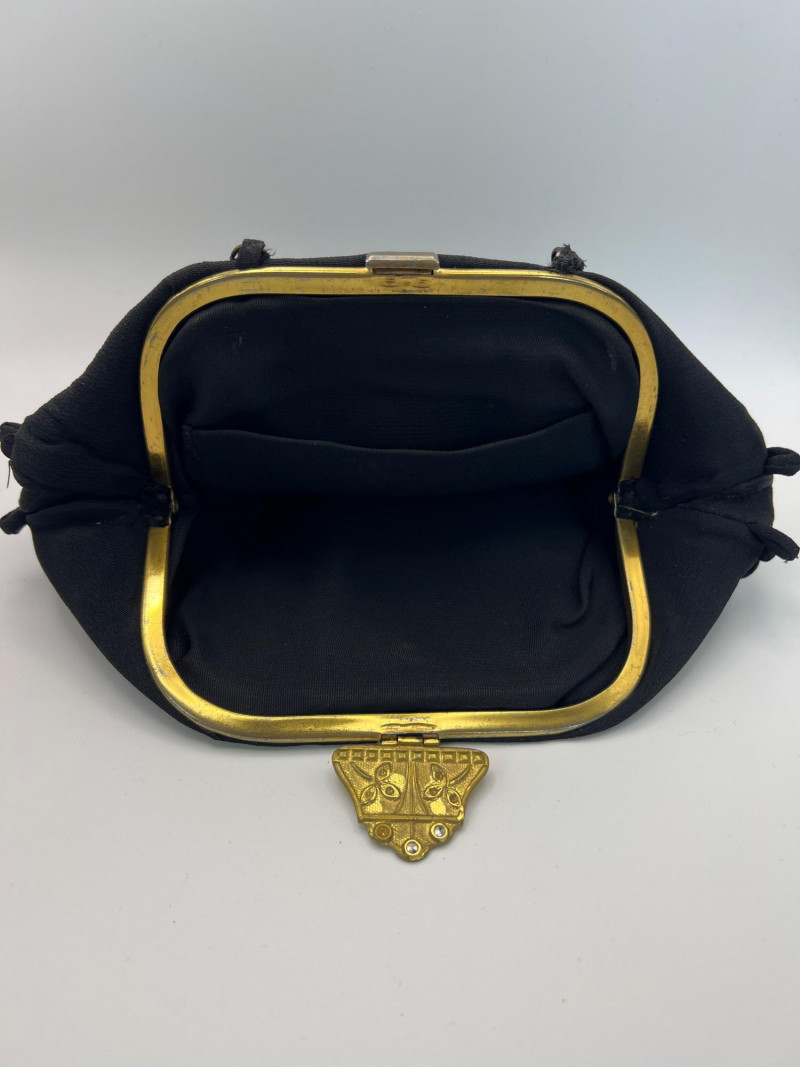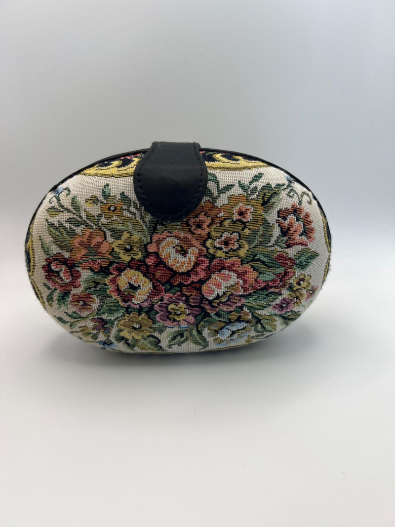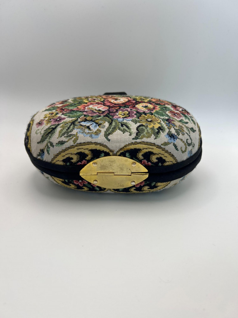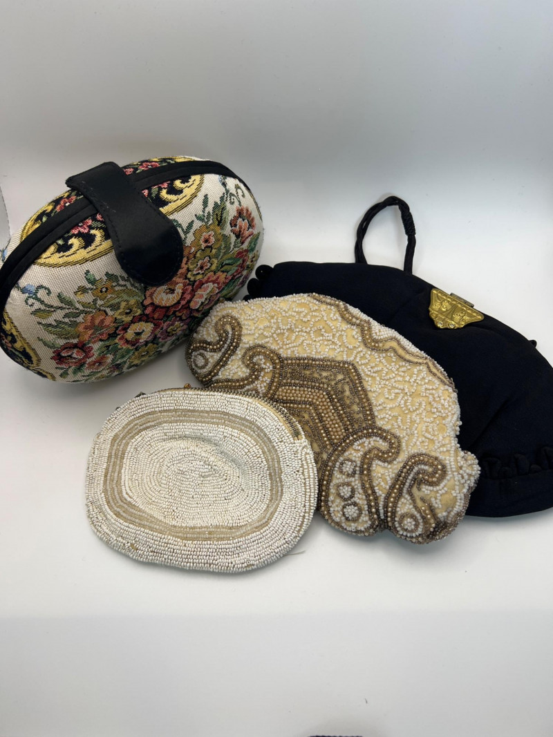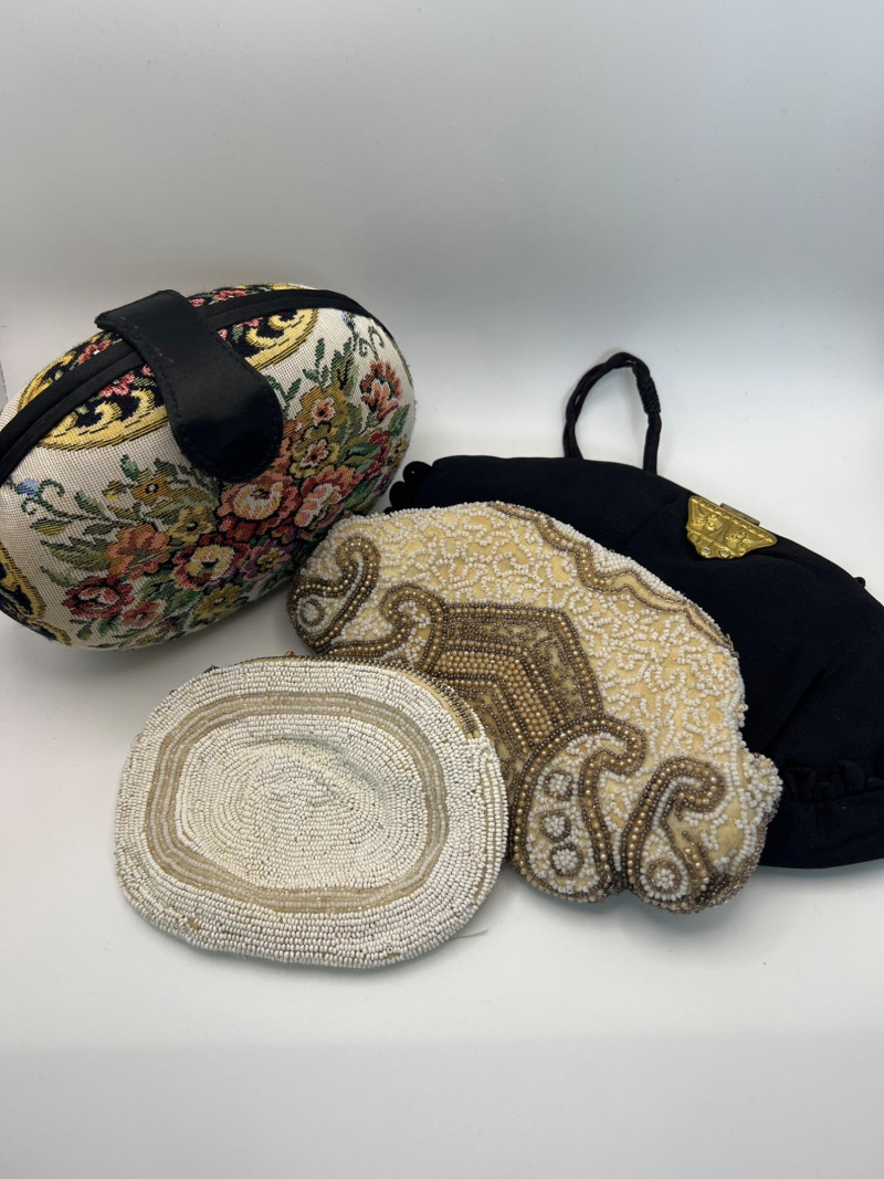 Four vintage ladies’ evening bags, each showcasing a different style of mid‑century craftsmanship. The grouping includes: Two Beaded Evening Bags – Intricately hand‑beaded designs with ornate patterns, ideal as formal clutches or coin purses. Black Fabric Framed Evening Bag – A classic structured frame purse with a gold‑tone clasp and short handle, timeless in silhouette. Tapestry / Needlepoint Hard‑Shell Evening Bag – A floral, oval‑shaped hard‑sided case with a woven tapestry exterior, a style often referred to as a tapestry evening bag or minaudière. Together, these pieces form a charming mix of vintage evening accessories, perfect for collectors, costumers, or anyone who appreciates the detail and artistry of earlier handbag design.