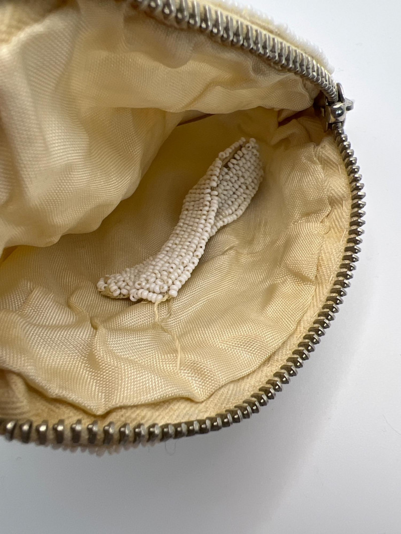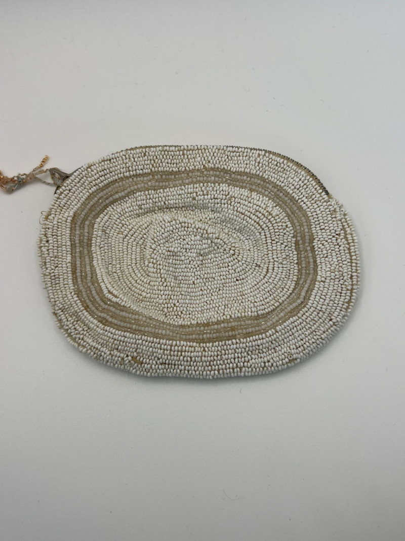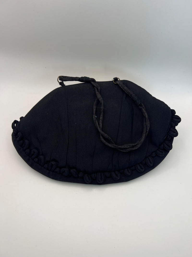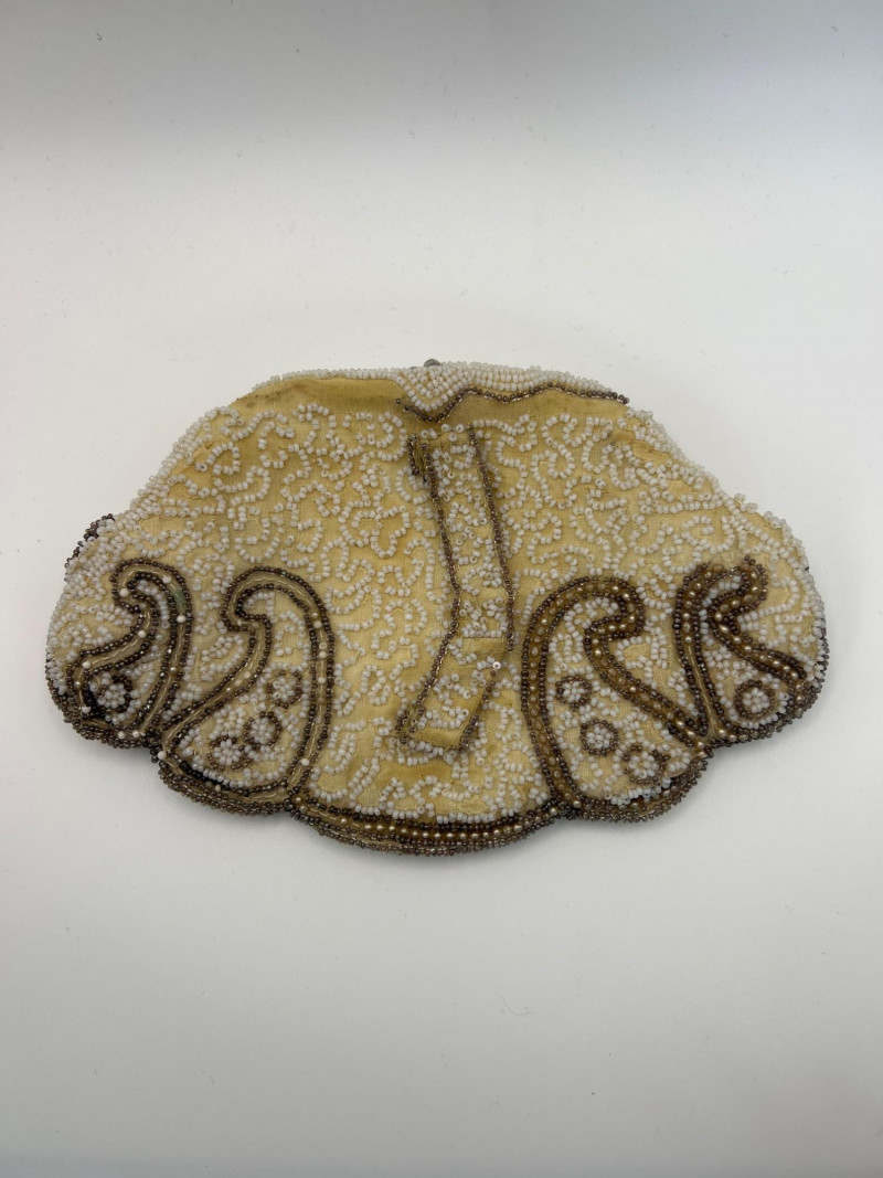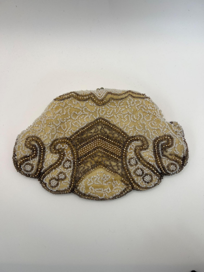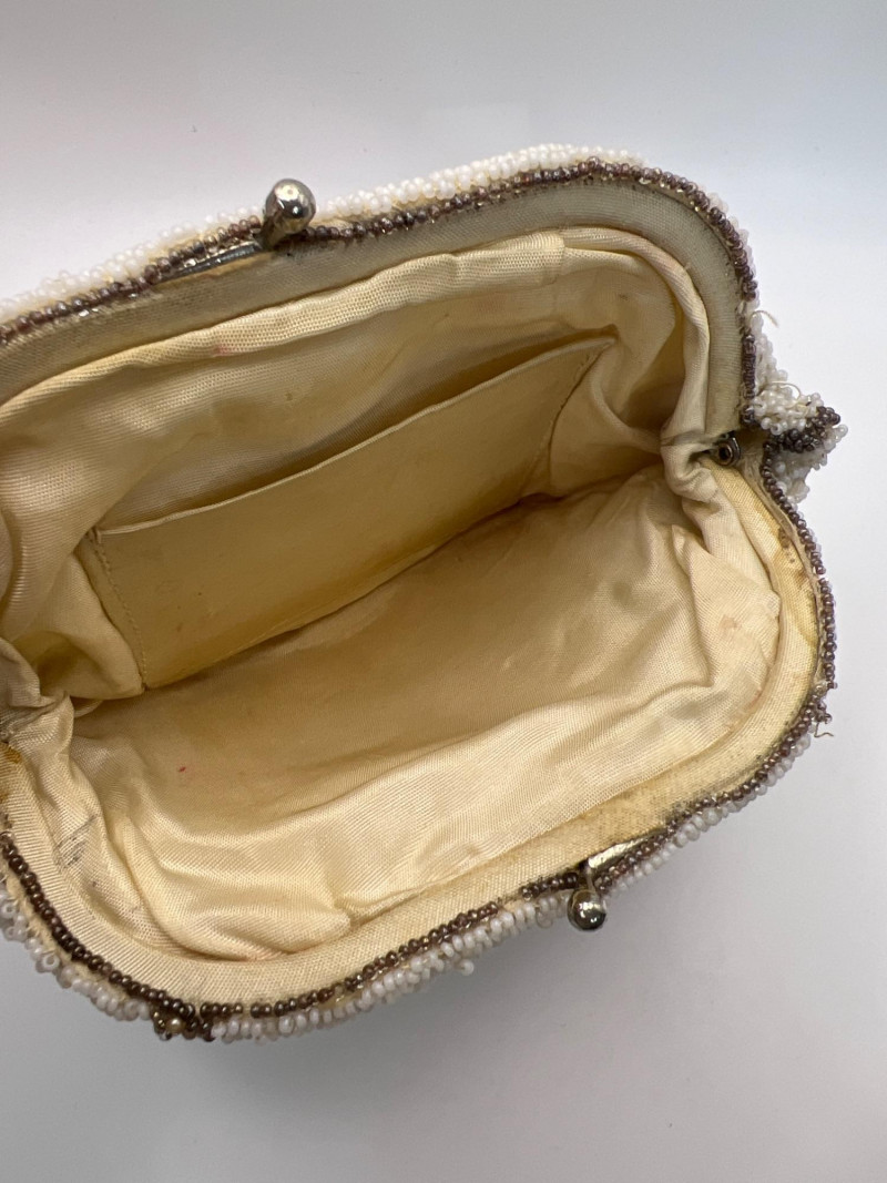 Four vintage ladies’ evening bags, each showcasing a different style of mid‑century craftsmanship. The grouping includes: Two Beaded Evening Bags – Intricately hand‑beaded designs with ornate patterns, ideal as formal clutches or coin purses. Black Fabric Framed Evening Bag – A classic structured frame purse with a gold‑tone clasp and short handle, timeless in silhouette. Tapestry / Needlepoint Hard‑Shell Evening Bag – A floral, oval‑shaped hard‑sided case with a woven tapestry exterior, a style often referred to as a tapestry evening bag or minaudière. Together, these pieces form a charming mix of vintage evening accessories, perfect for collectors, costumers, or anyone who appreciates the detail and artistry of earlier handbag design.