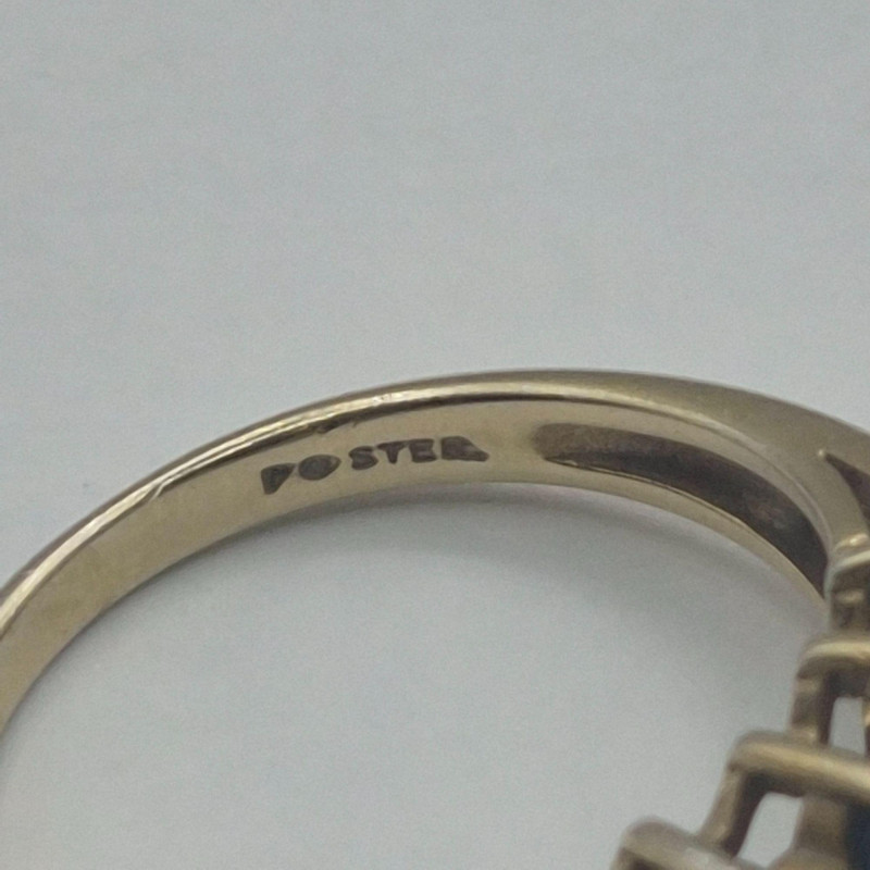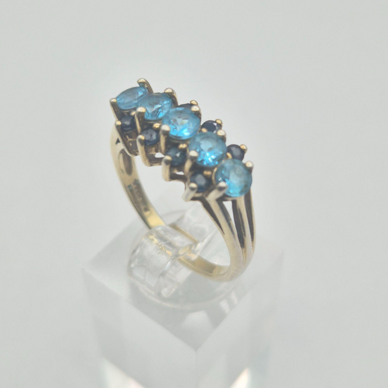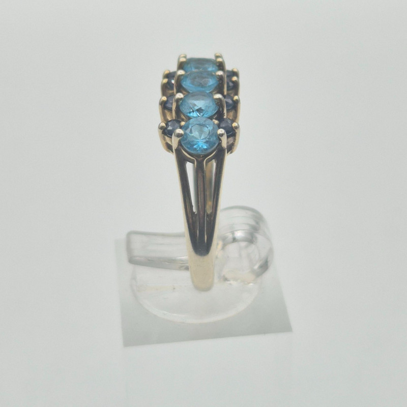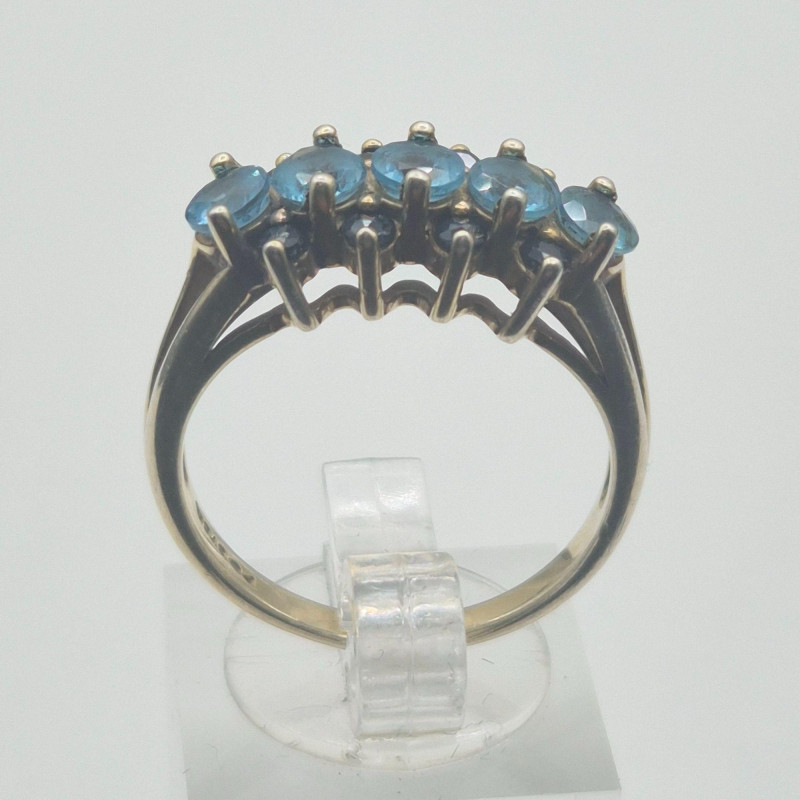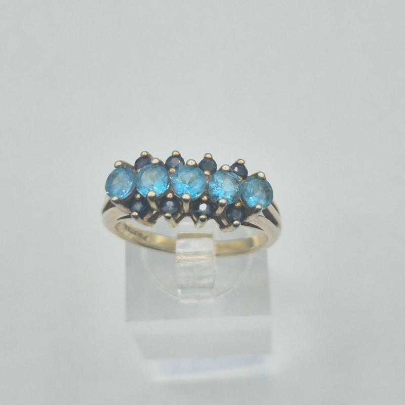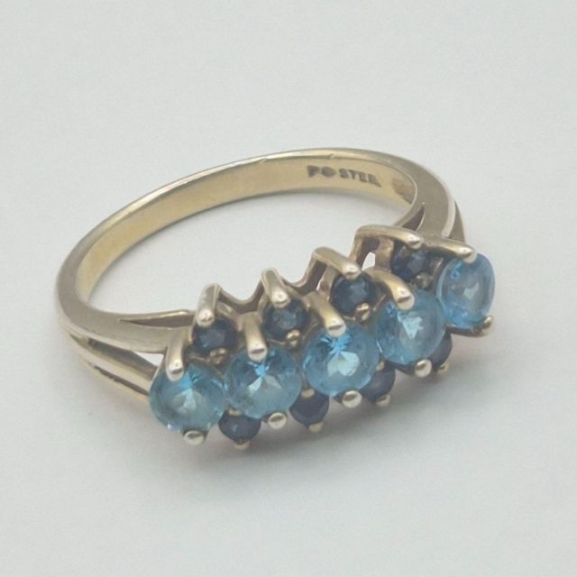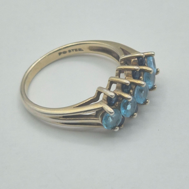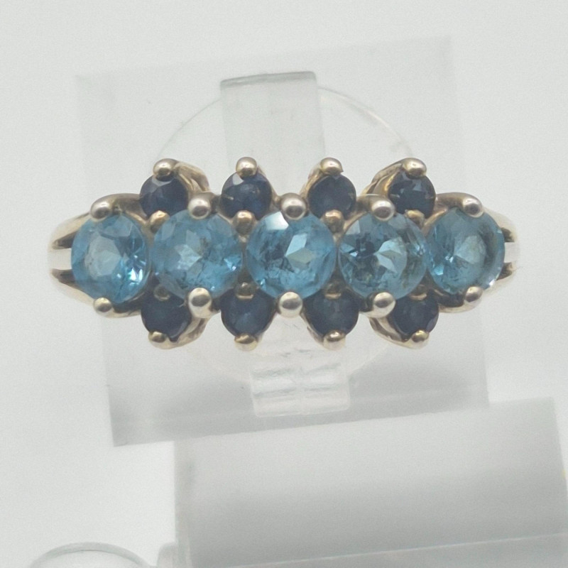A dramatic and beautifully contrasted cocktail ring showcasing two shades of blue spinel arranged in a tiered, light‑catching design. The center row features aqua blue spinel, framed above and below by darker blue spinel, creating a vivid two‑tone effect with strong visual depth. The ring is stamped “Ster” and finished in a gold‑wash over sterling silver, giving it the warmth of gold with the structure of silver beneath. Sized at 9, it has presence and elegance without feeling oversized.