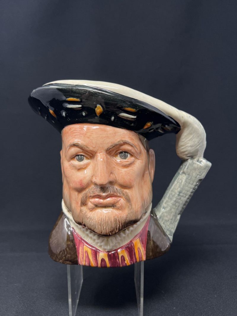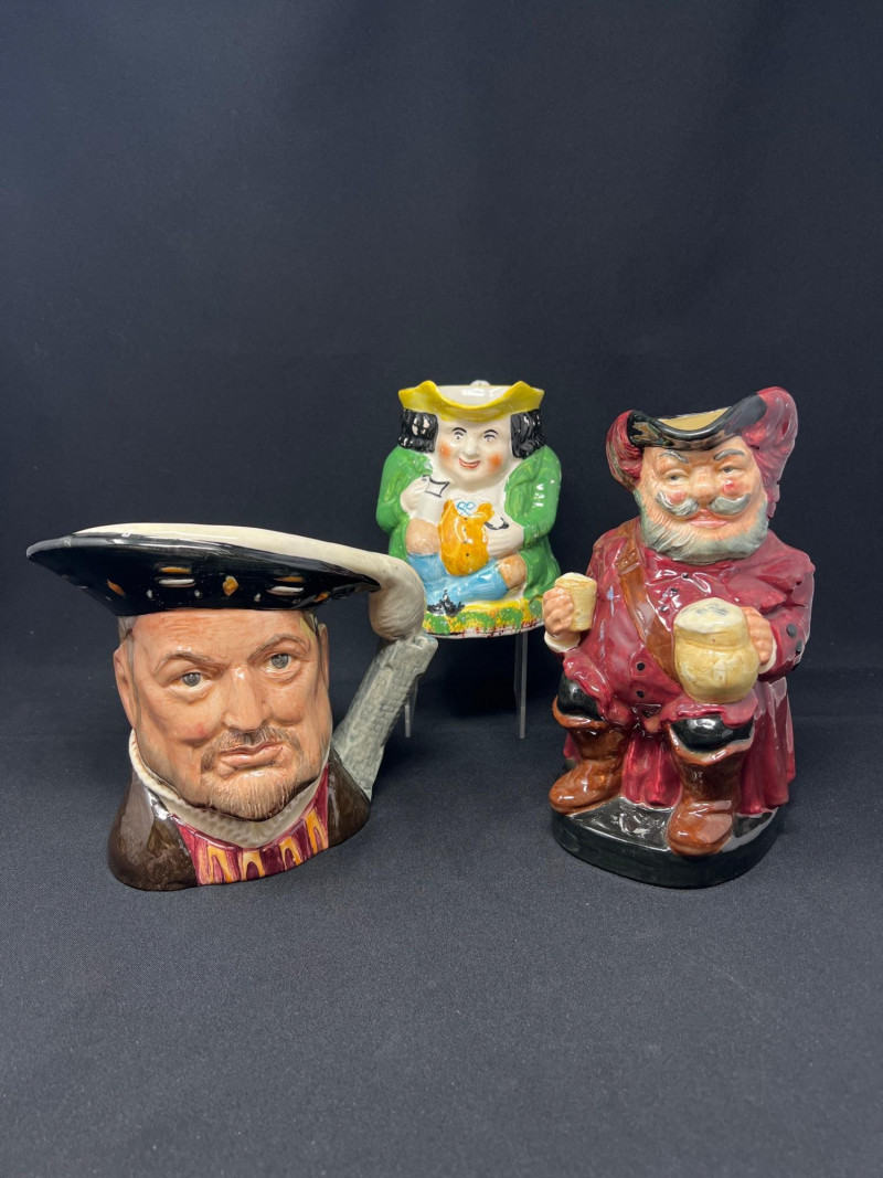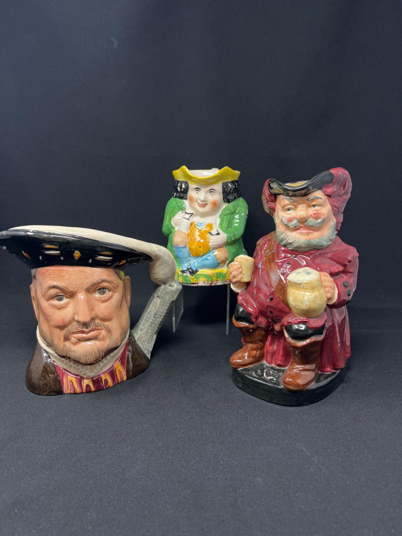 A trio of vintage character mugs, including a Henry VIII mug, a Sir John Falstaff mug, and an Allertons England character mug. Each piece features expressive molded detail and hand‑painted accents, capturing the charm and personality typical of mid‑century figural ceramics. A lively grouping for collectors of character jugs and historical or literary figures.