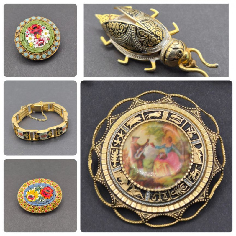 A refined selection of vintage European jewelry showcasing two beloved decorative arts: Damascene metalwork and Italian micro‑mosaic. This lot brings together intricate craftsmanship, rich color, and old‑world charm. Included in the lot: