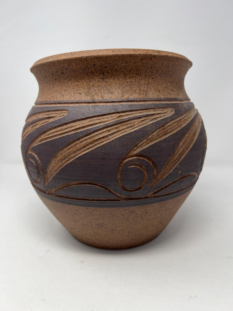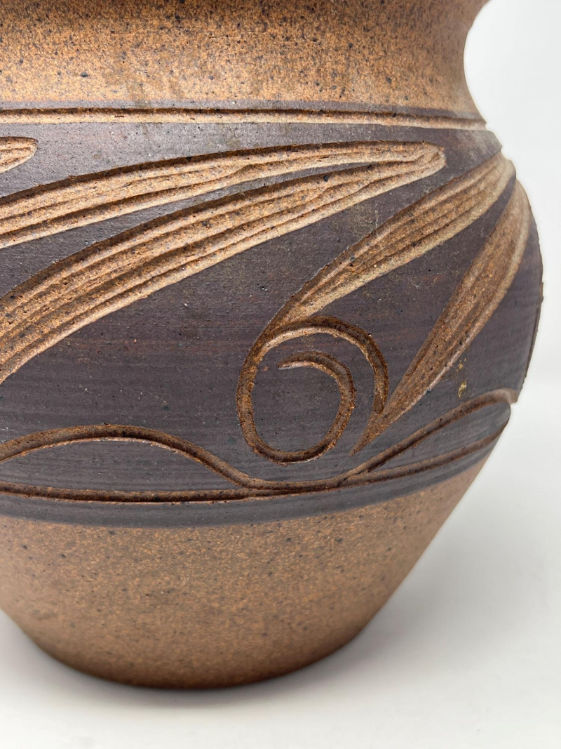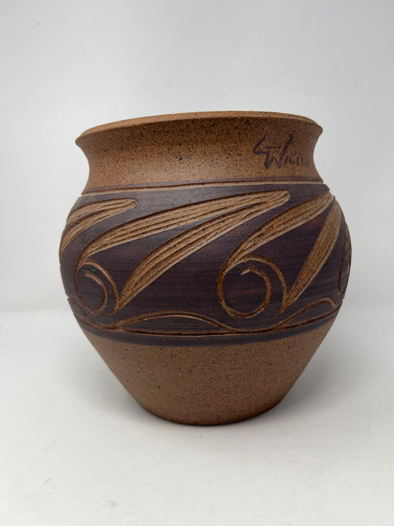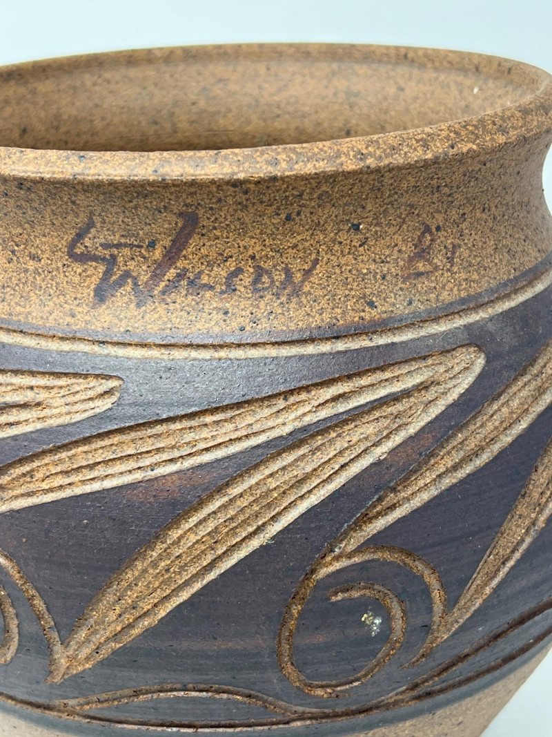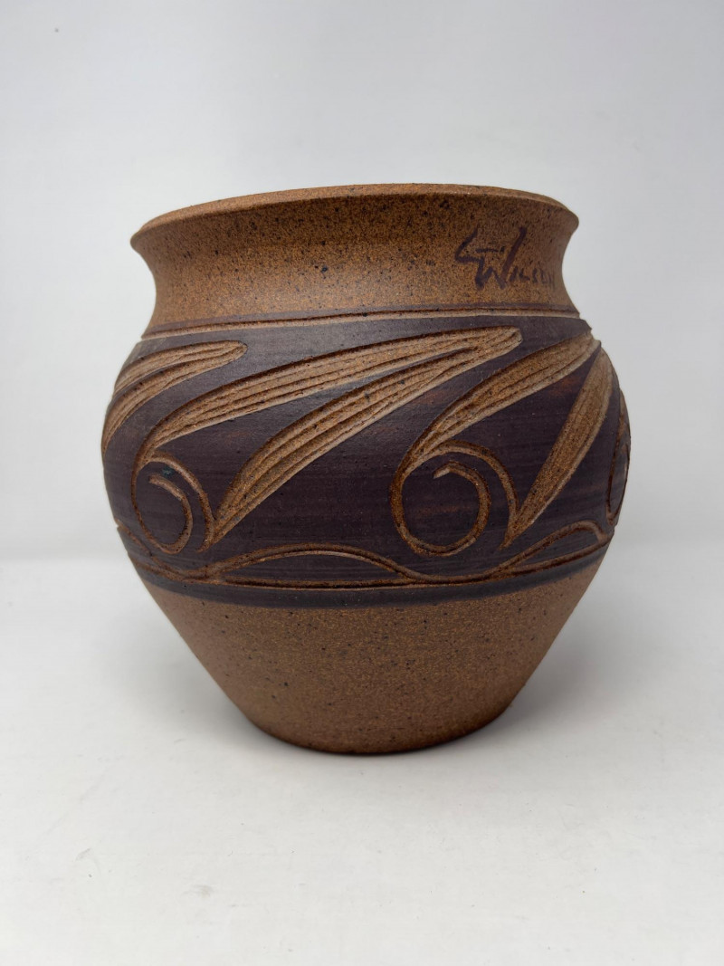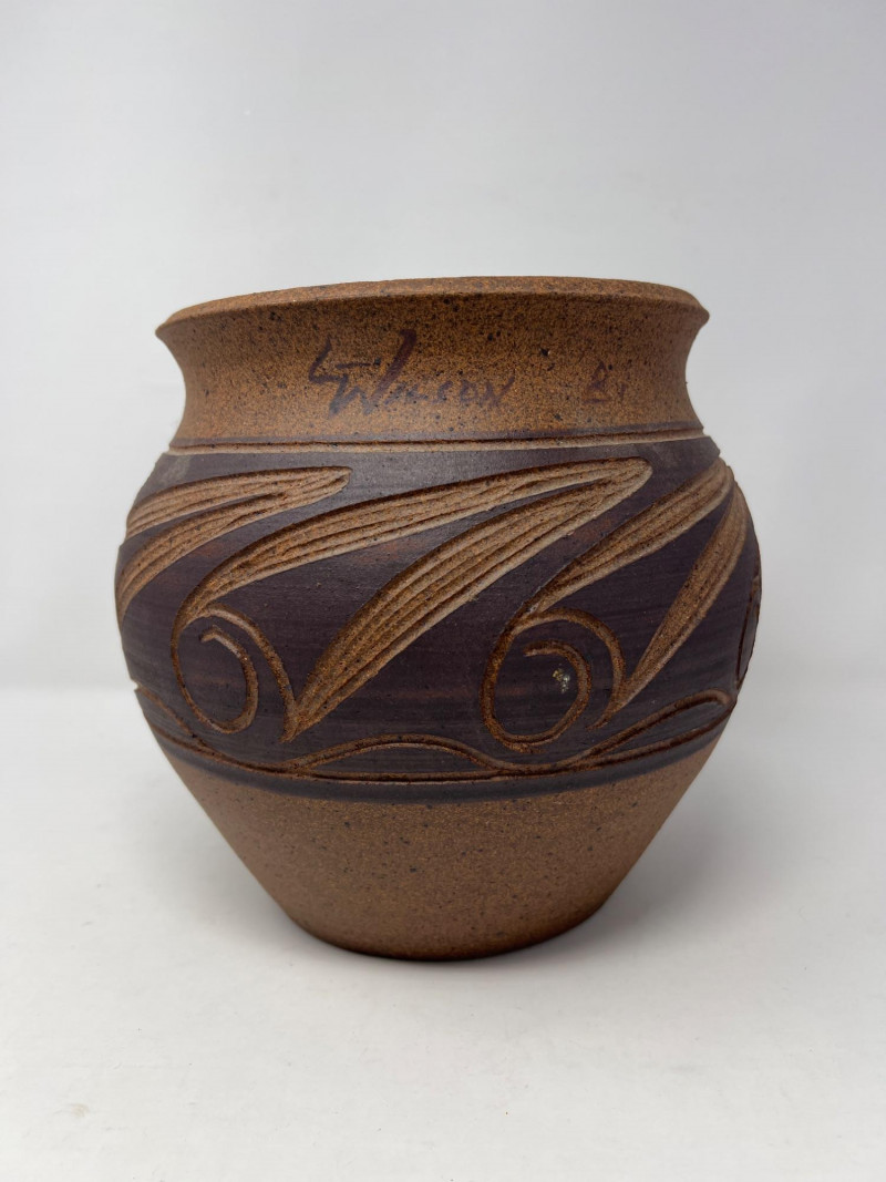 Hand‑thrown artisan pottery vessel with a warm natural clay body and carved decorative banding. The midsection features a darker slip with incised swirl and line motifs revealing the lighter clay beneath. Subtle texture, flared rim, and balanced form highlight the maker’s craftsmanship. Signed "L. Wilson 81" near the rim with an accompanying mark. Light, expected surface wear consistent with handmade studio pottery. A distinctive piece for collectors of regional studio ceramics or handcrafted decorative pottery.