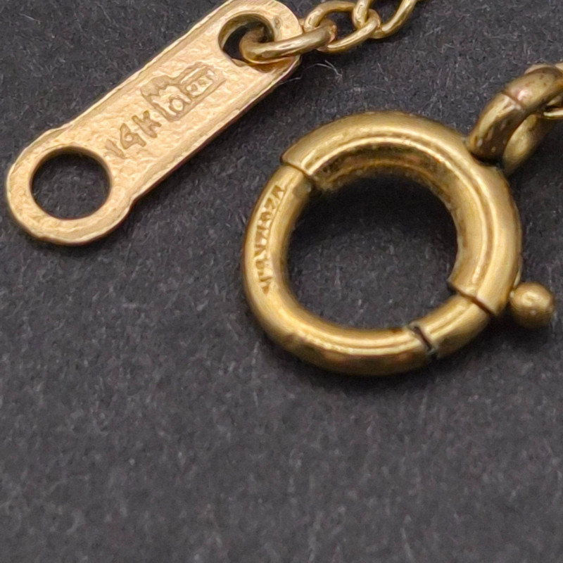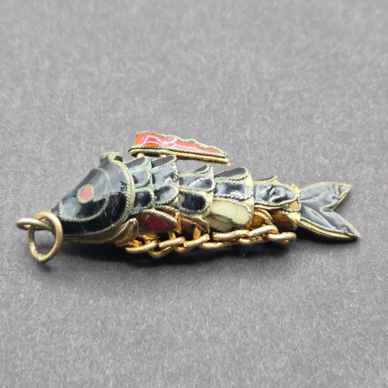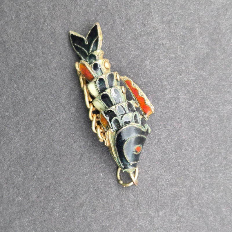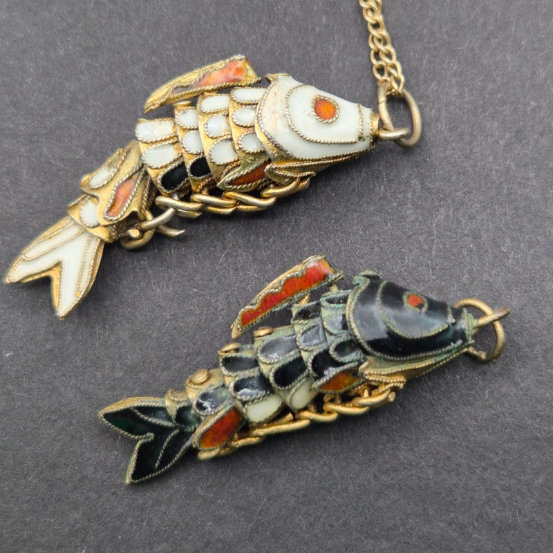 A charming pair of articulating cloisonné fish pendants, one which is suspended on a 14" gold‑filled chain. Each enamel fish measures 1.25" × 0.5" and features hinged articulation for gentle movement and added visual interest. Richly colored cloisonné enamel is outlined in fine metalwork, offering an artisan, mid‑century costume‑jewelry vibe that’s equally suited to everyday wear or curated vintage collections. Lightweight and eye‑catching, this set makes a playful, wearable statement or a thoughtful gift for lovers of enamel work and whimsical design.