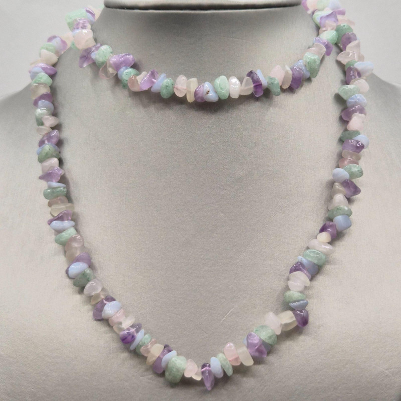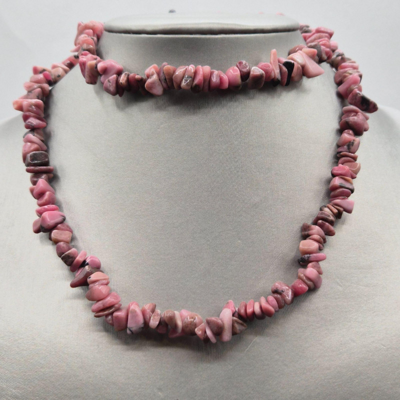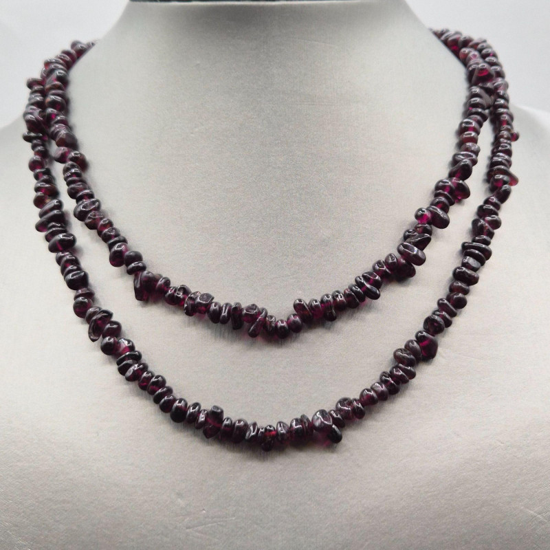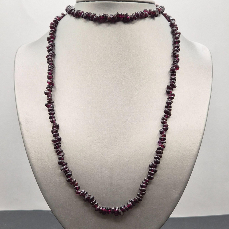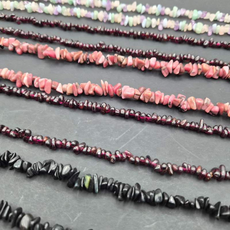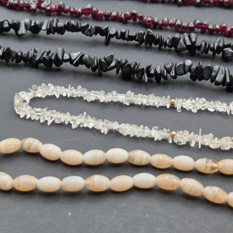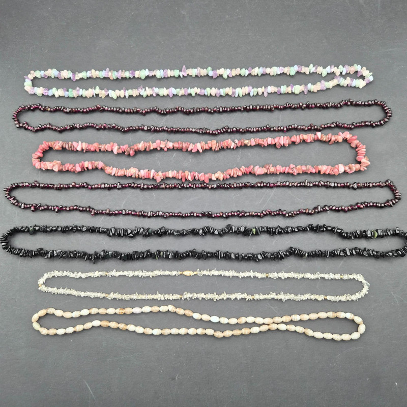 A colorful estate grouping of natural stone necklace strands featuring garnet, onyx, pink rhodonite, and agate in chip and bead styles. Lengths range from 28" to 33", making these strands ideal for single‑strand wear, layered looks, or creative redesign into shorter necklaces and bracelets. Each strand shows the organic color variation and surface texture unique to natural stones; some beads may display minor chips or surface wear consistent with vintage use. Perfect for jewelry designers, beaders, resellers, and collectors seeking authentic gemstone components with wearable vintage character.