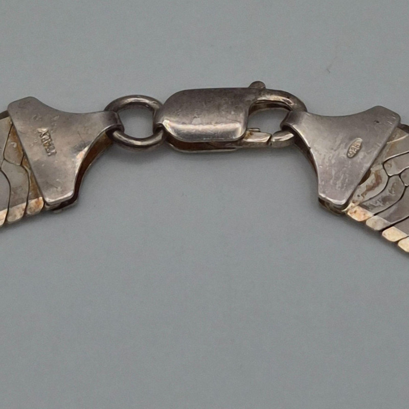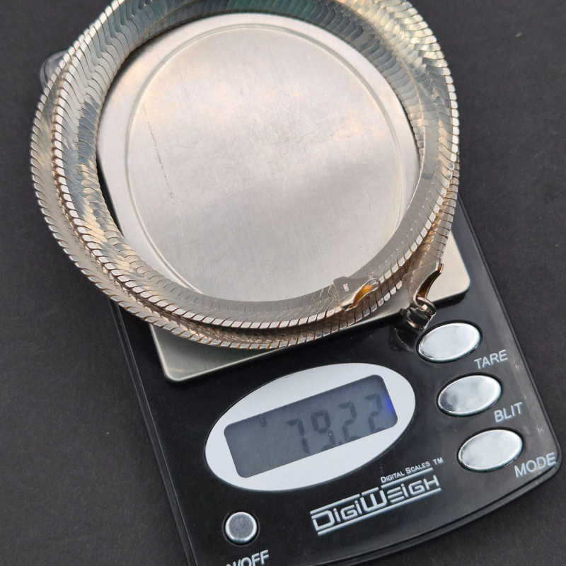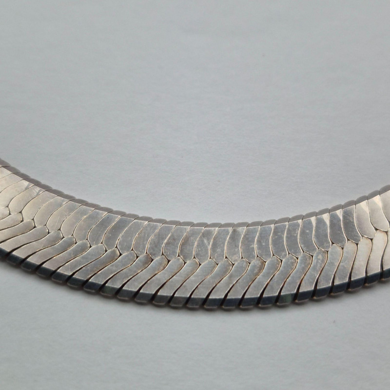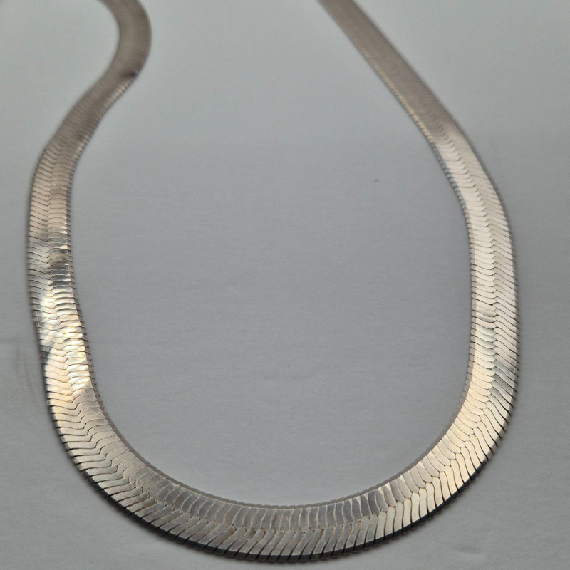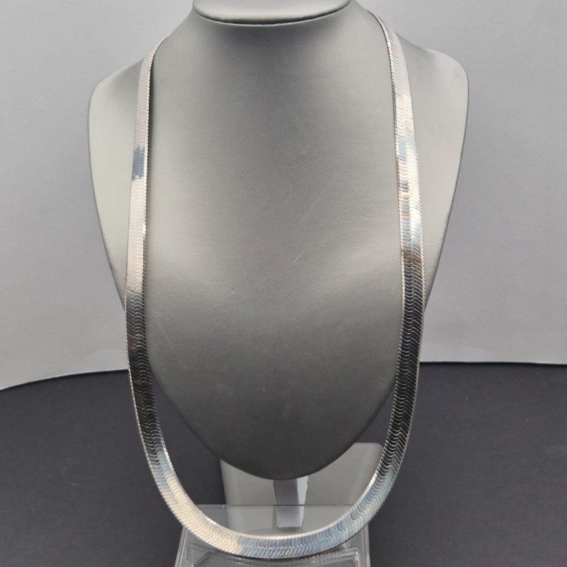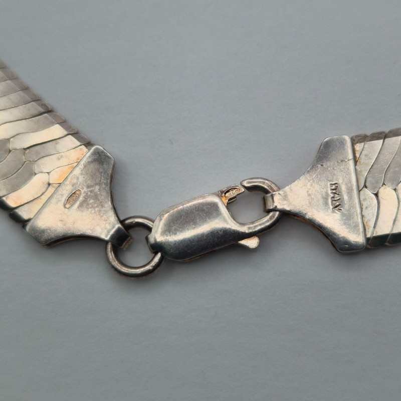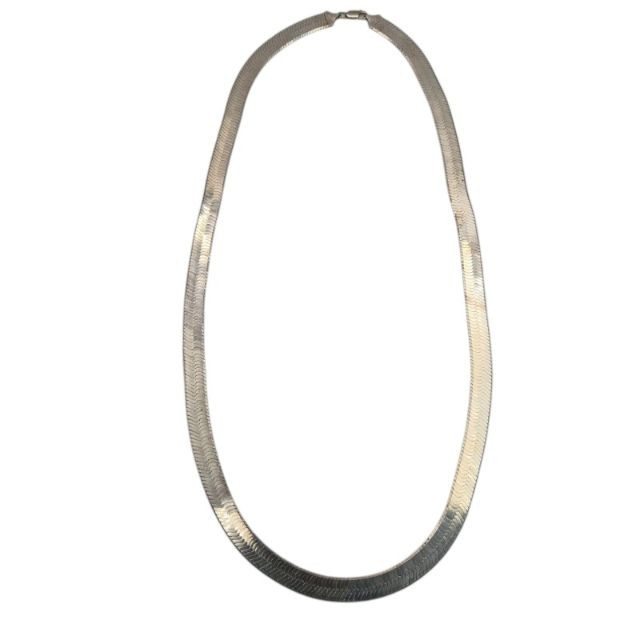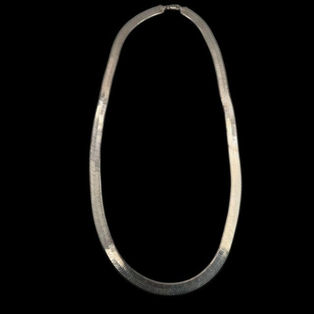 A handsome, substantial herringbone chain in sterling silver, stamped 925 Italy. This 27" chain measures approximately 12mm wide and weighs 79.2 grams, offering a bold, polished silhouette that sits beautifully alone or layered with pendants. The flat, woven herringbone links create a smooth, reflective surface that catches light across its length, while the Italian 925 stamp confirms solid sterling construction and mid‑century to modern craftsmanship. Vintage/estate condition with natural surface wear and light patina consistent with age