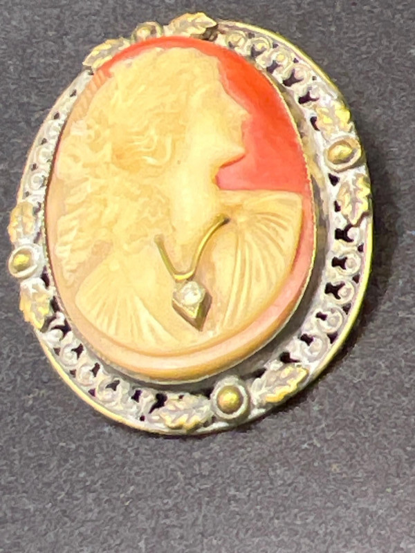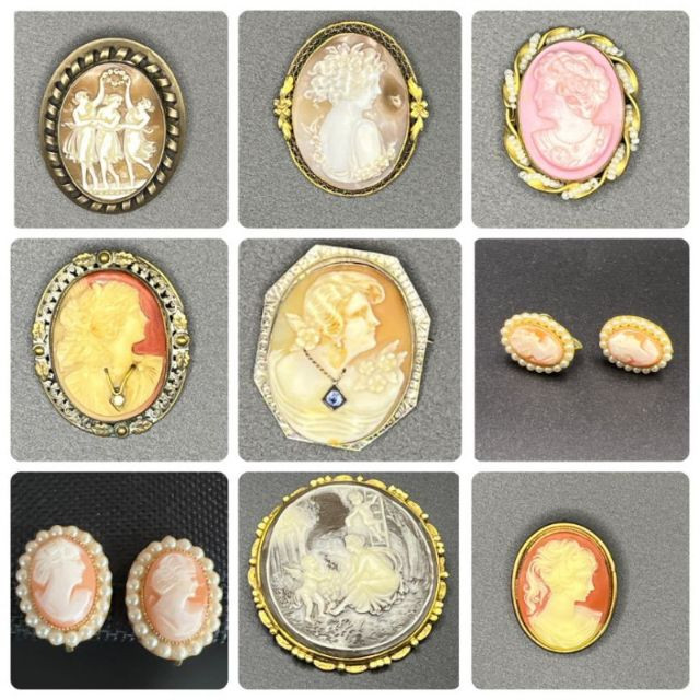 A varied estate grouping of cameos in shell and resin, offered as a mixed lot that blends wearable pieces and collectible components. The assortment includes multiple sizes and styles suitable for display, wear, restoration, or repurposing. One shell brooch may be set in 10k white gold and appears to include a small diamond, increasing the lot’s potential interest and value pending verification.