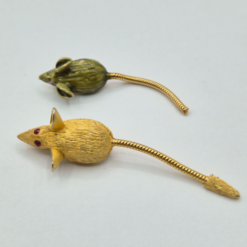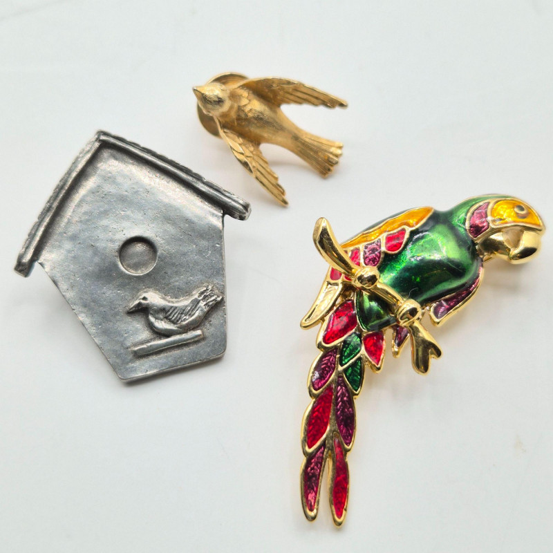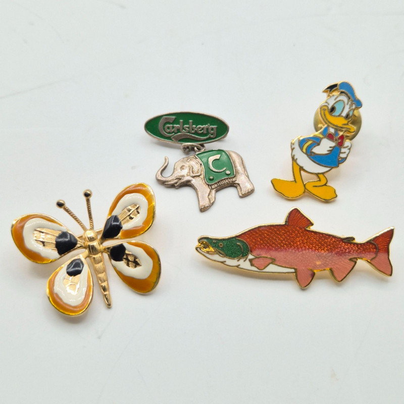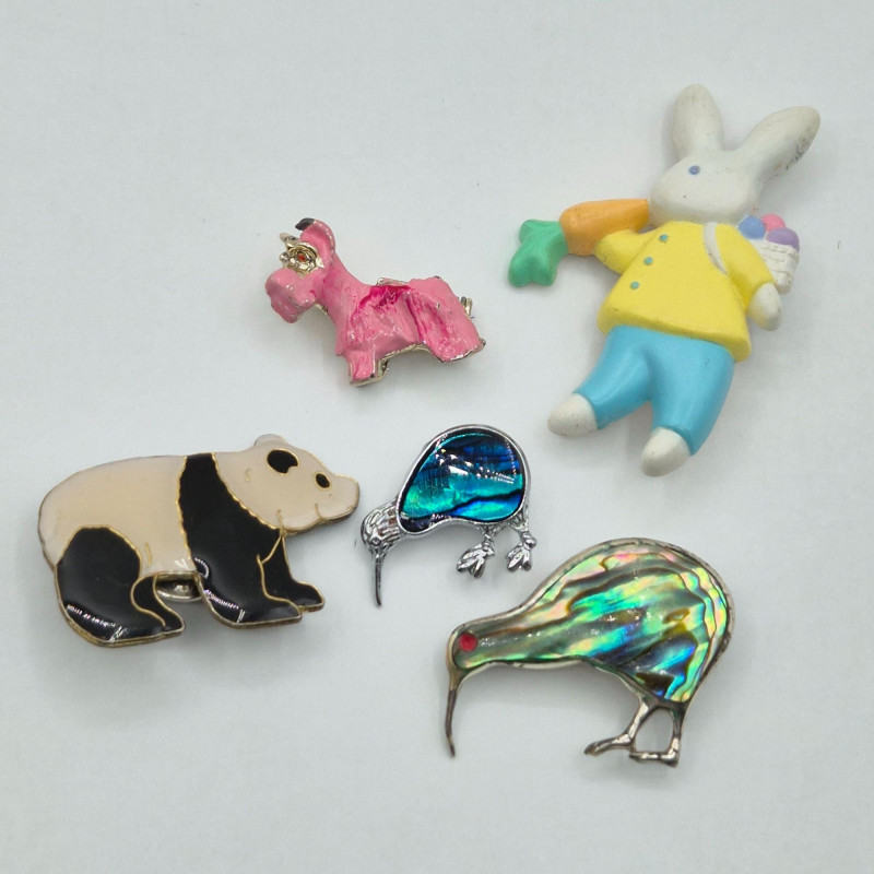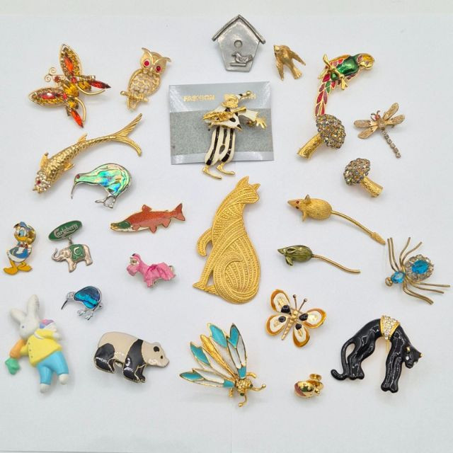 Playful and varied assortment of brooches and pins featuring animals, insects, and whimsical novelty designs. This collection includes owls, butterflies, cats, mice, fish, pandas, dinosaurs, birds, and other character‑filled pieces crafted in rhinestone, enamel, faux pearl, and gold‑tone finishes. A lively mix of statement brooches and smaller accent pins — ideal for collectors, crafters, upcyclers, or anyone who loves expressive, personality‑rich jewelry. A fun, colorful grouping with charm and visual appeal.