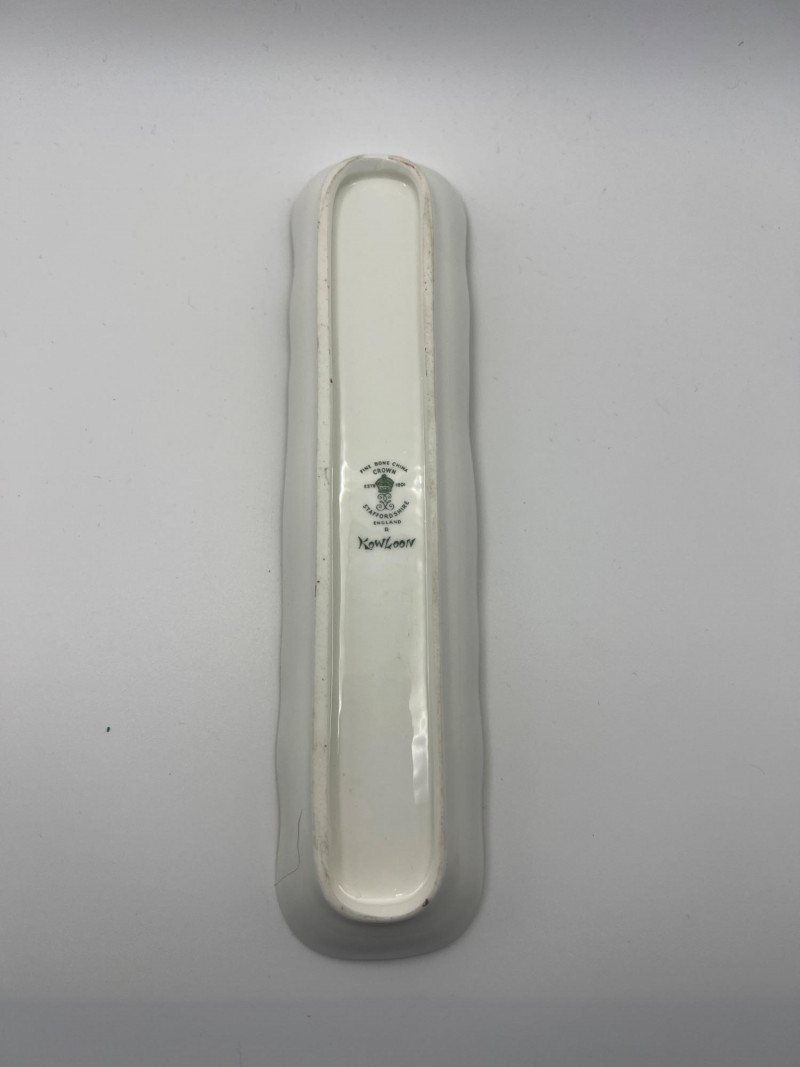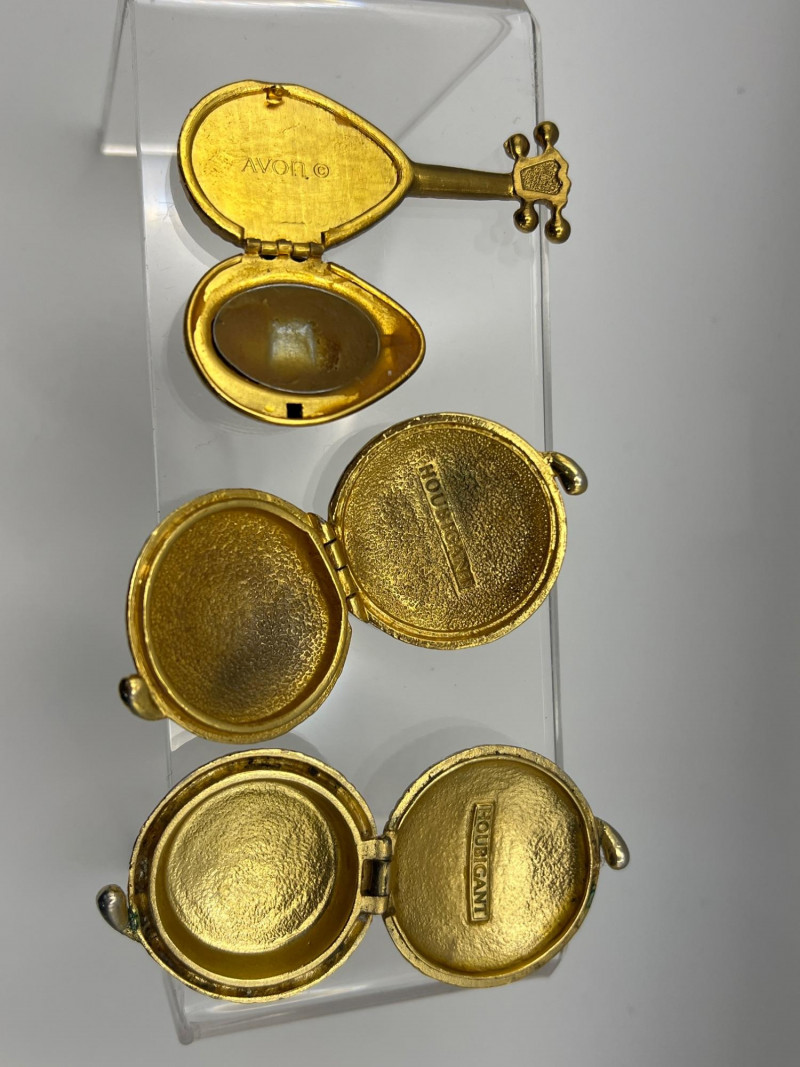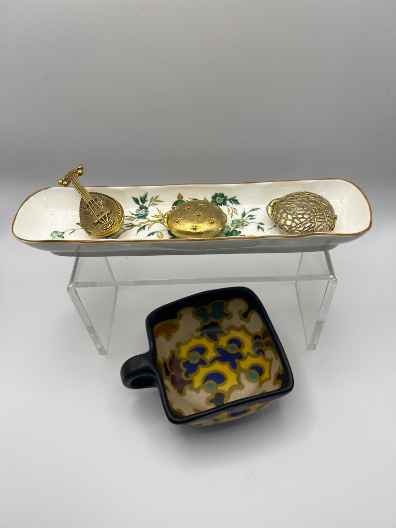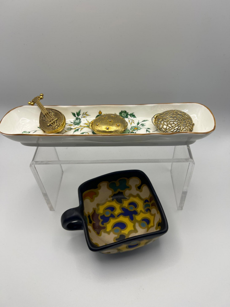 Charming mixed lot of decorative collectibles featuring European ceramics and vintage perfume compacts. Includes: Gouda Holland Ceramic Piece (3.5 inch x 3.5 inch) – Hand‑painted and marked Regina, showcasing the bold colorwork and stylized forms associated with Dutch art pottery. Crown Staffordshire Fine Bone China (9 inch length x 2 inch width) – Marked Kowloon, representing classic English craftsmanship and refined pattern work. Three Vintage Perfume Compacts – One Avon key‑shaped compact and two Houbigant round compacts, each with hinged lids and gold‑tone finishes. Lovely as vanity décor, small keepsake holders, or collectible accents. A refined assortment ideal for collectors of European ceramics, vintage perfume accessories, and small decorative objects.