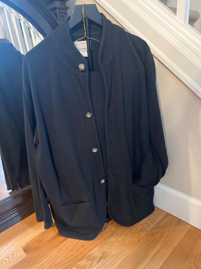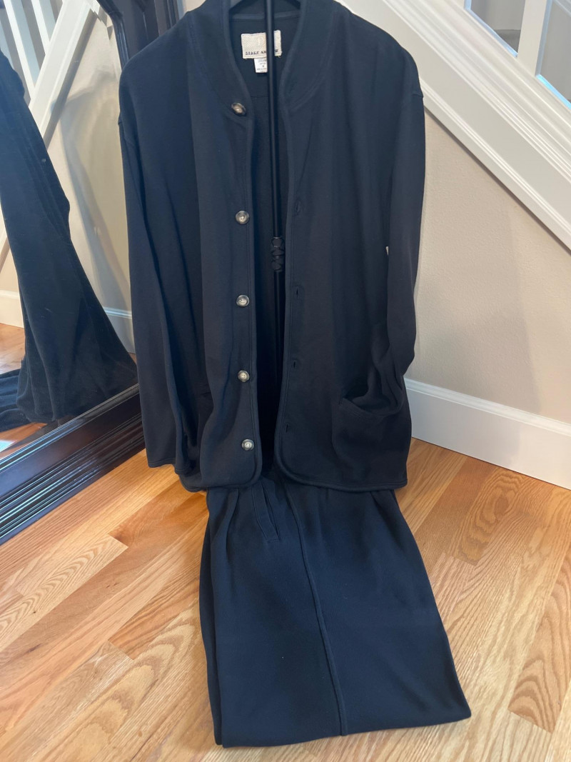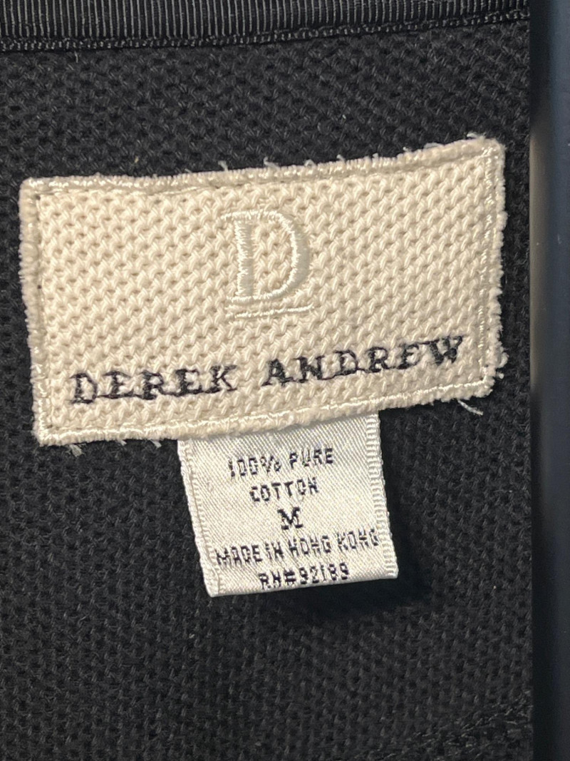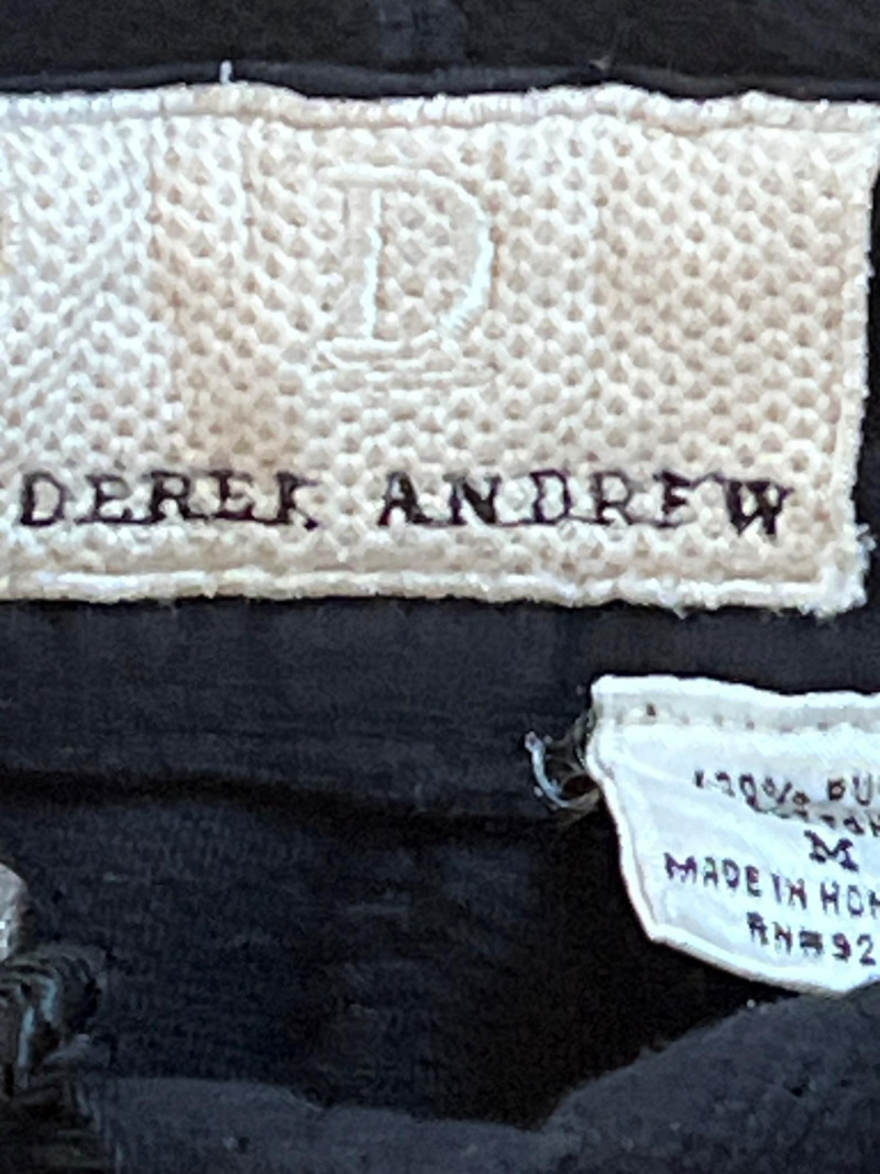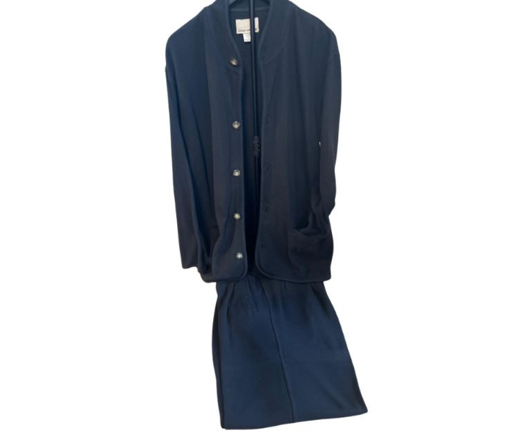 Vintage Derek Andrew women’s two‑piece pant suit in a deep navy blue, crafted from quality cotton with a soft, structured drape. The set includes a collarless button‑front jacket with metallic buttons and matching straight‑leg pants. The clean, minimalist silhouette is characteristic of Derek Andrew’s late‑20th‑century womenswear — practical, understated, and easy to style. Marked Women’s Medium.